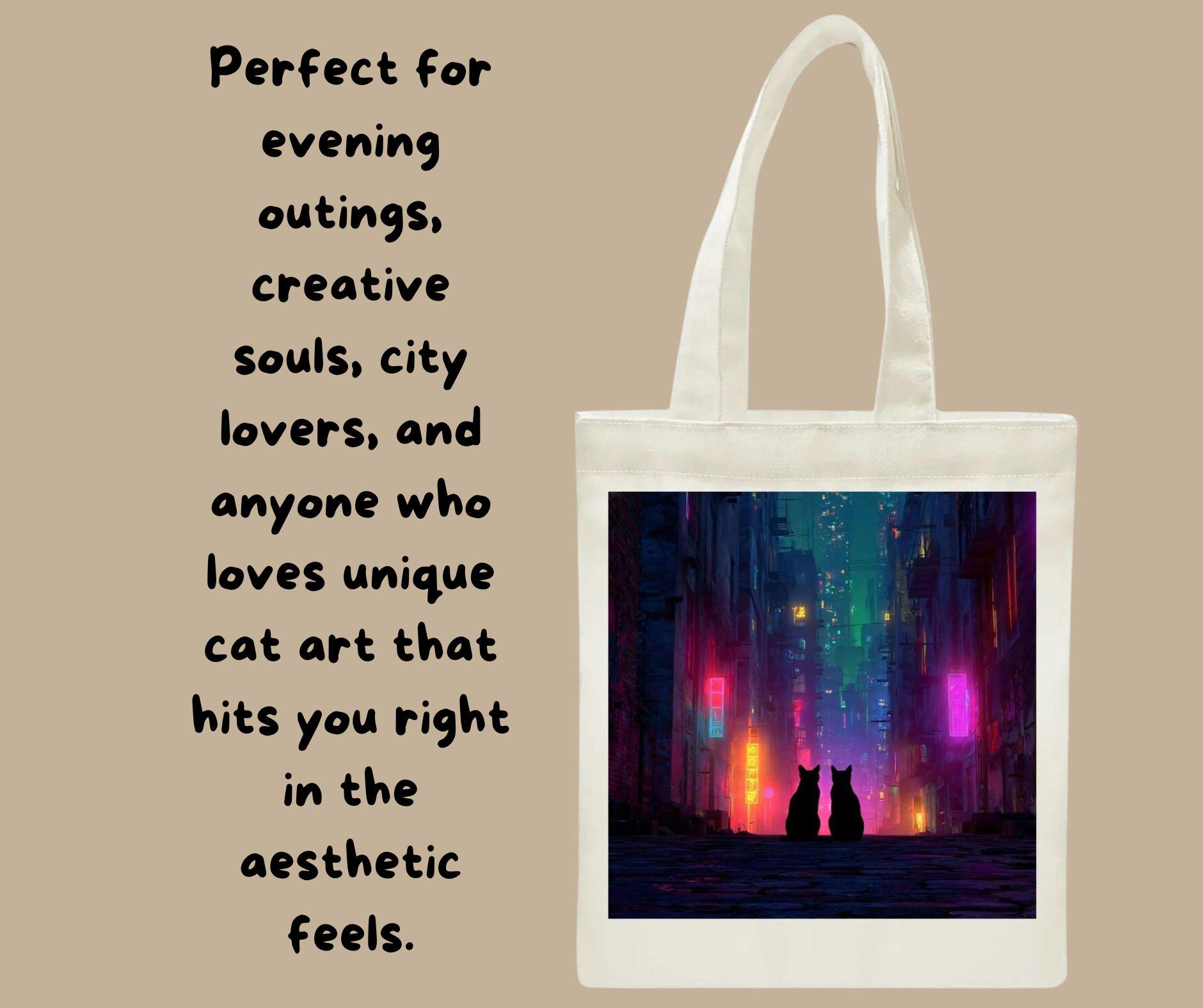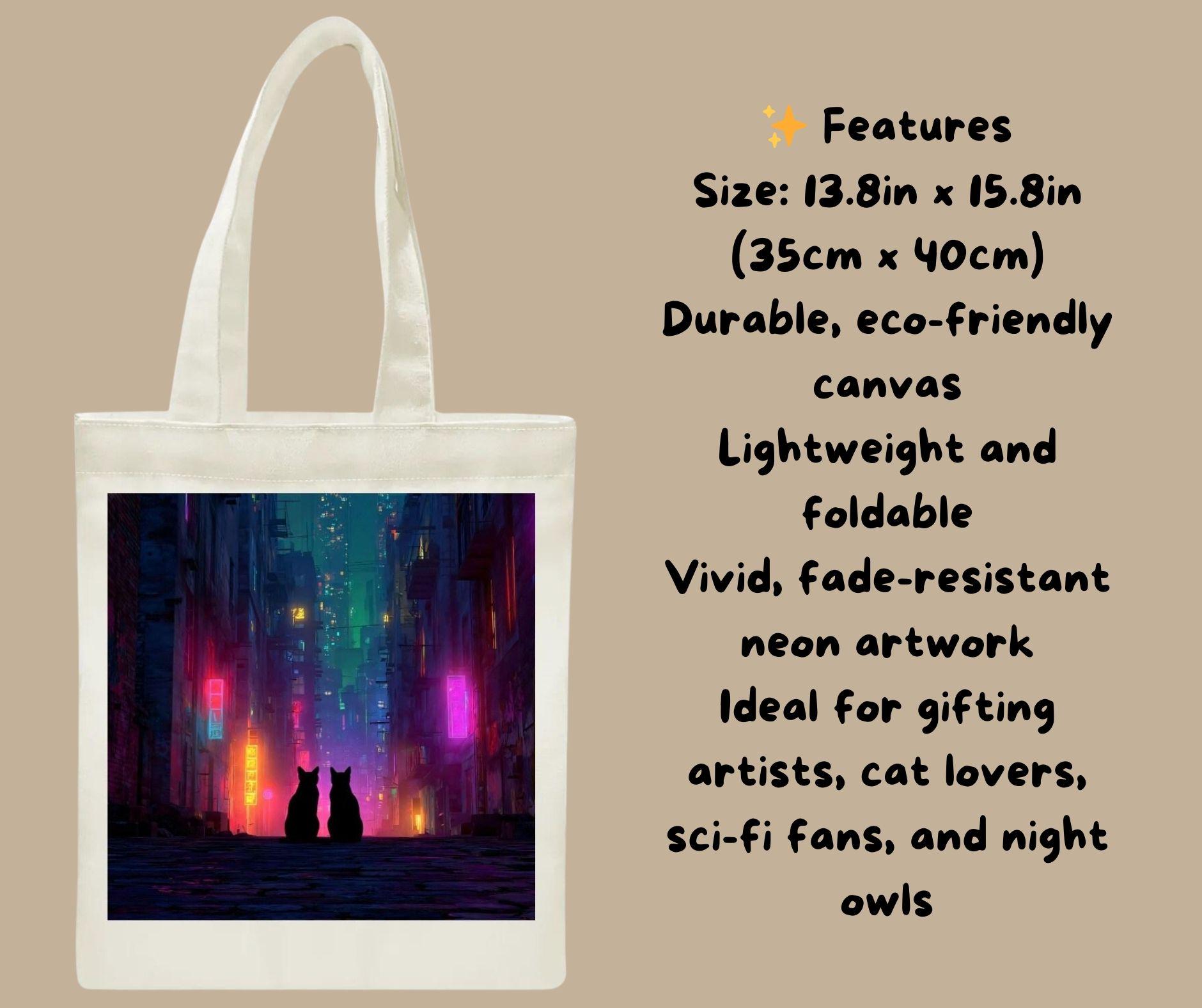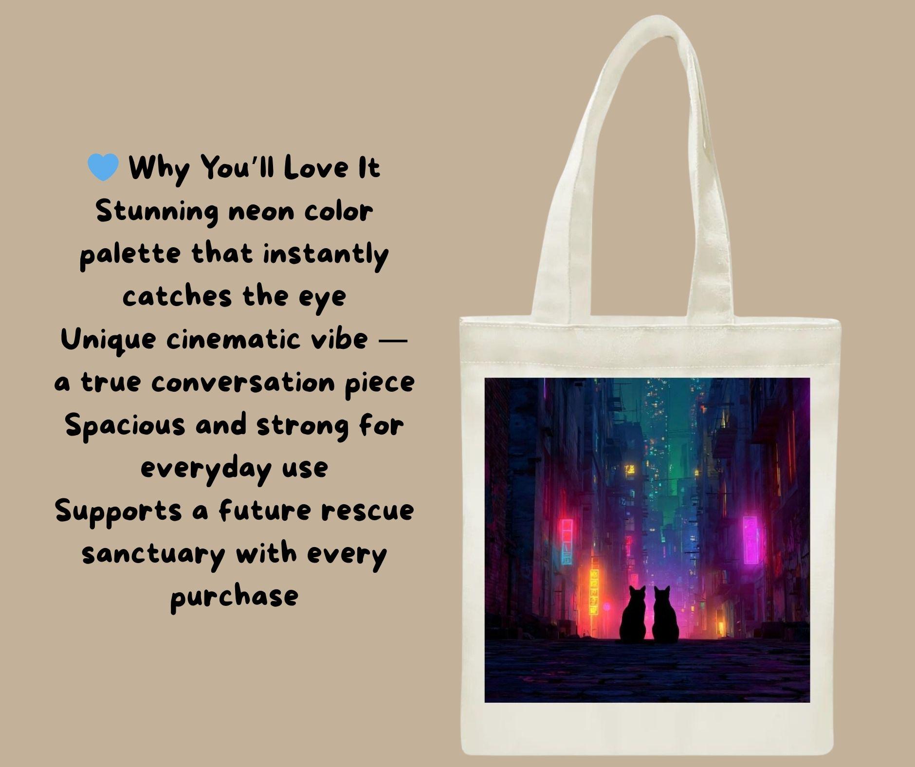 Step into a neon-lit dream with this cinematic cyberpunk tote. 💙💜🌆🐈⬛ Featuring two cat silhouettes gazing down a glowing futuristic alley, this artwork blends mystery, beauty, and sci-fi atmosphere. It’s bold, surreal, and unbelievably eye-catching — perfect for night-city aesthetic lovers.