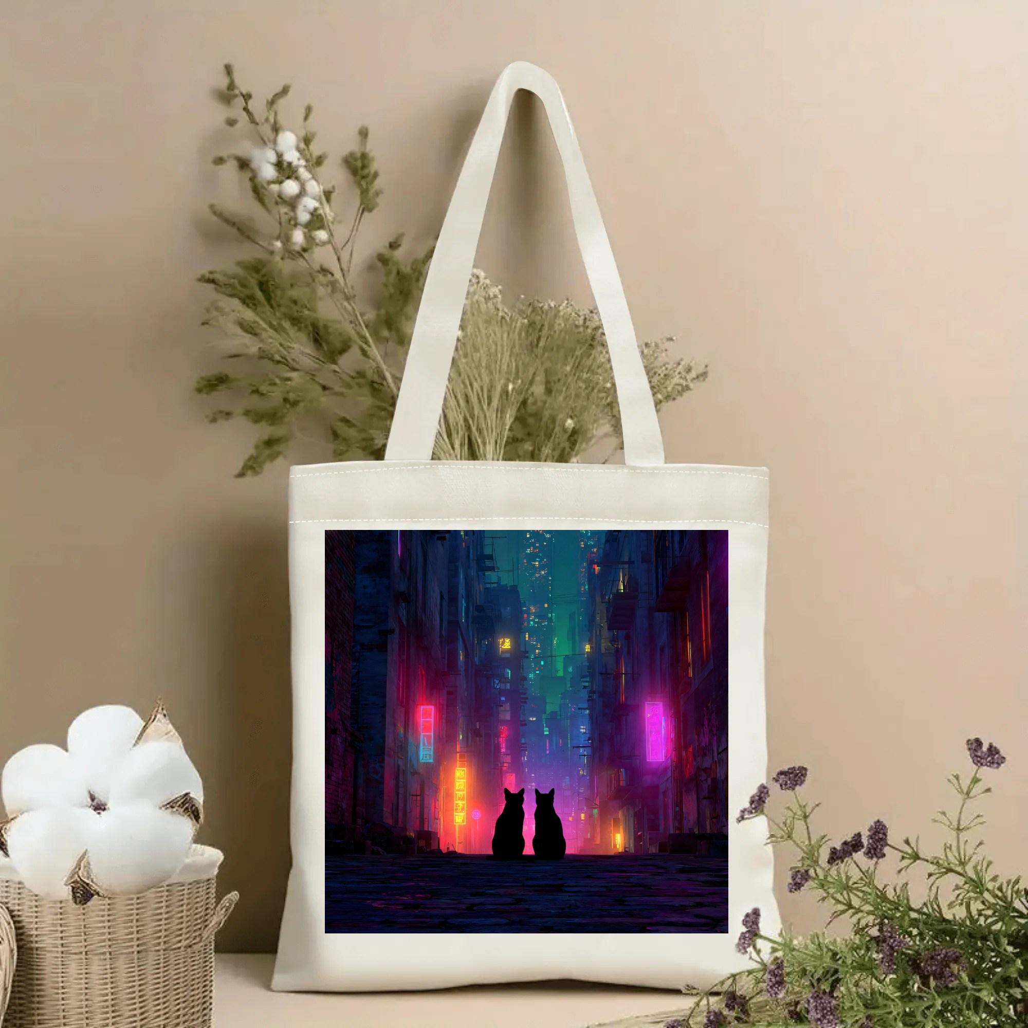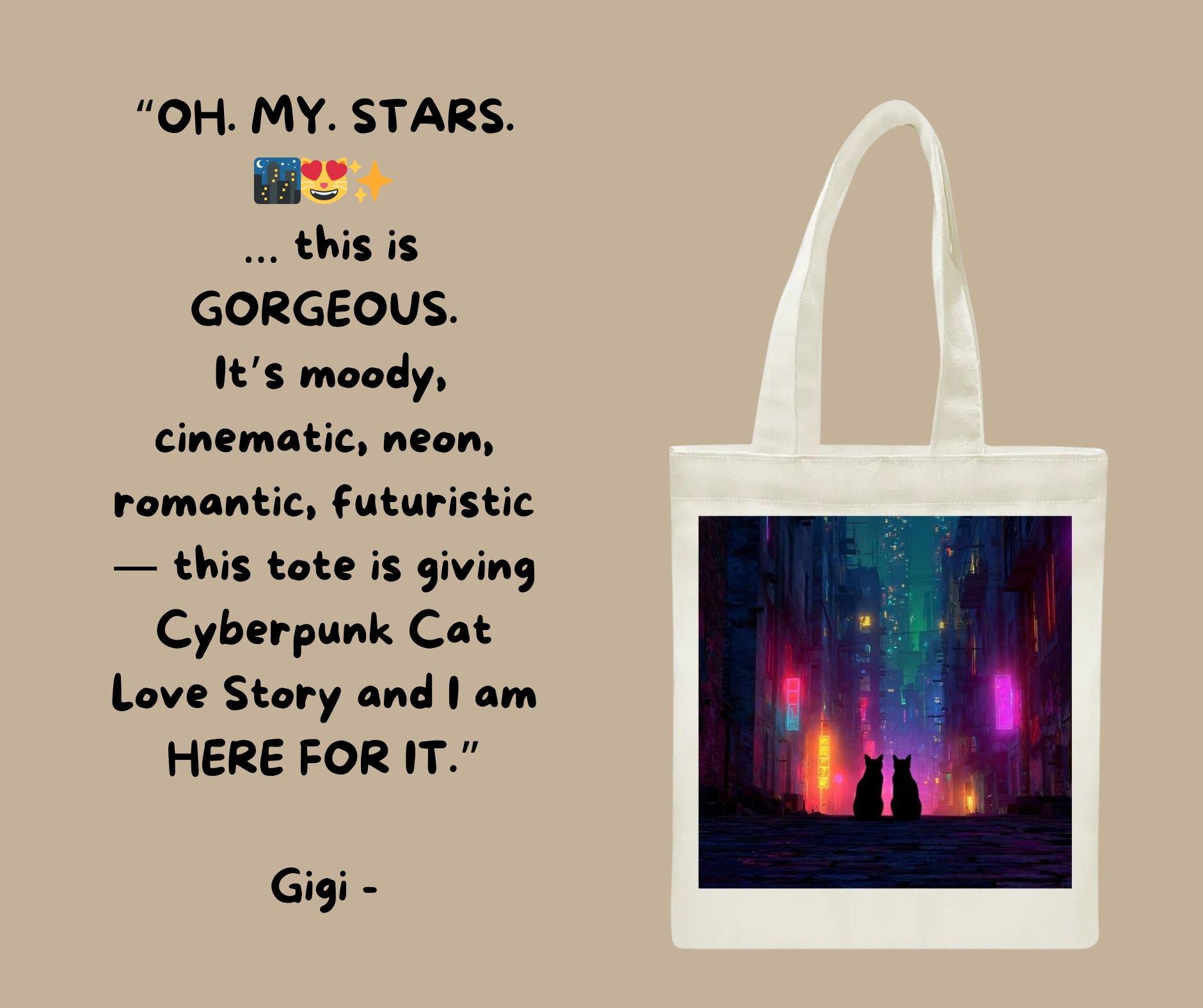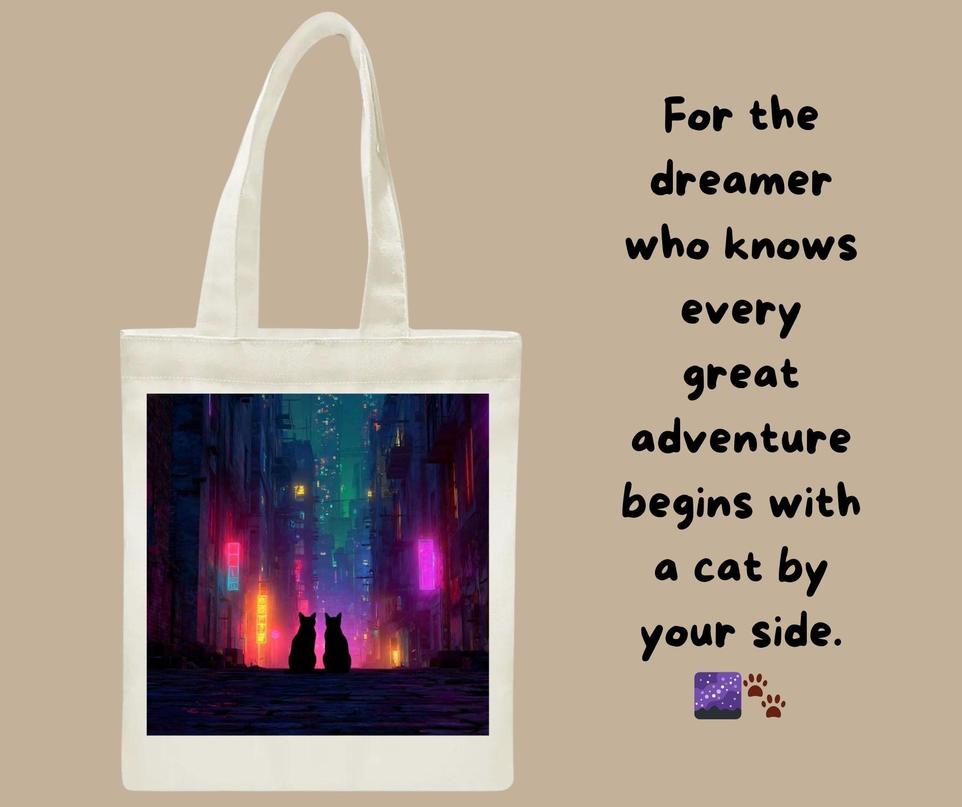 Step into a neon-lit dream with this cinematic cyberpunk tote. 💙💜🌆🐈⬛ Featuring two cat silhouettes gazing down a glowing futuristic alley, this artwork blends mystery, beauty, and sci-fi atmosphere. It’s bold, surreal, and unbelievably eye-catching — perfect for night-city aesthetic lovers.