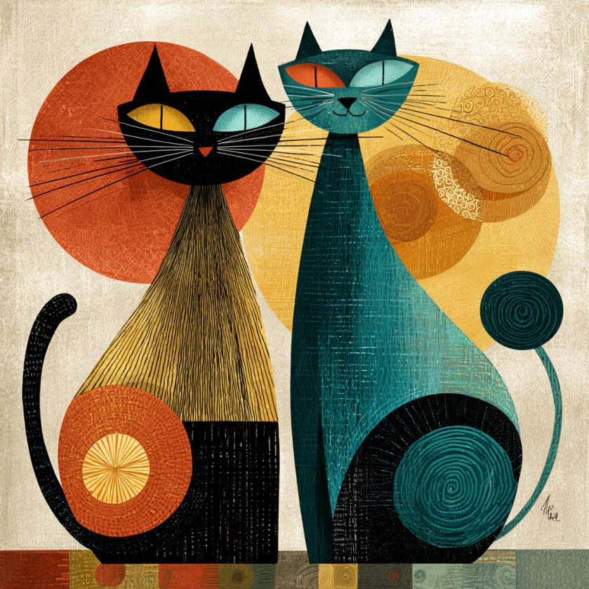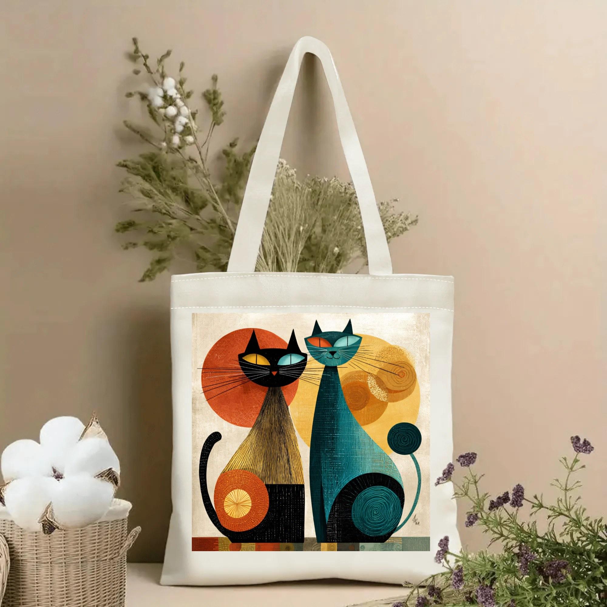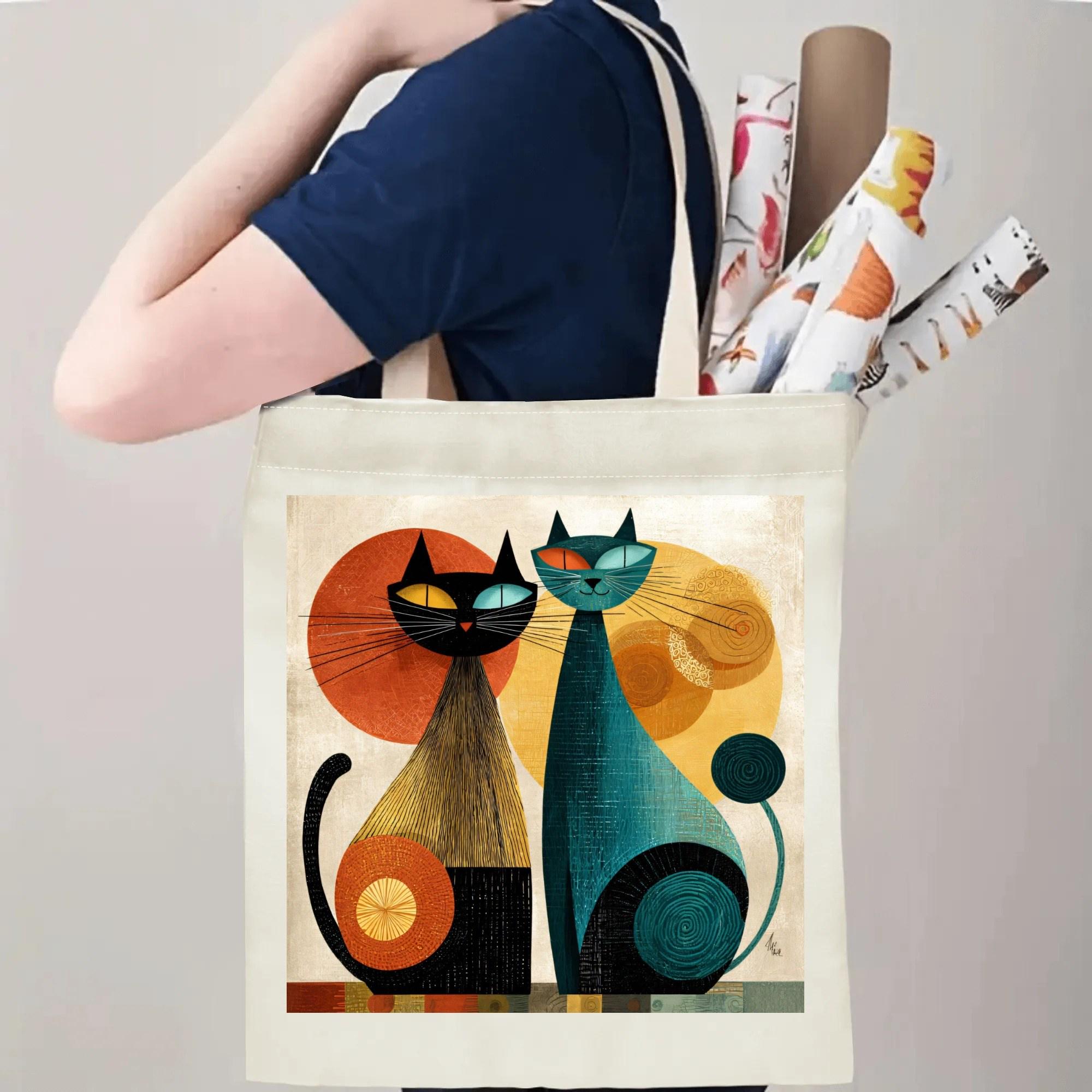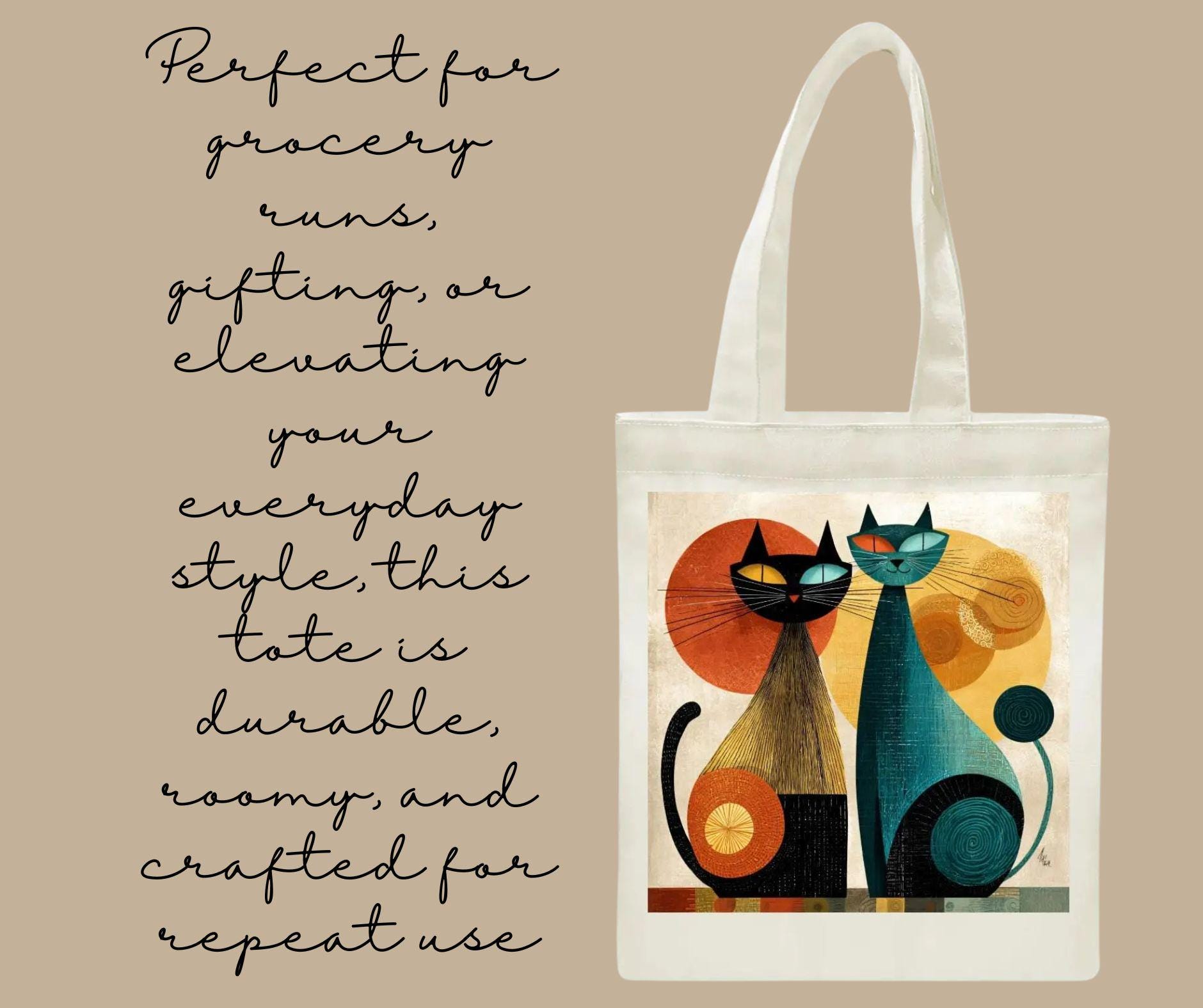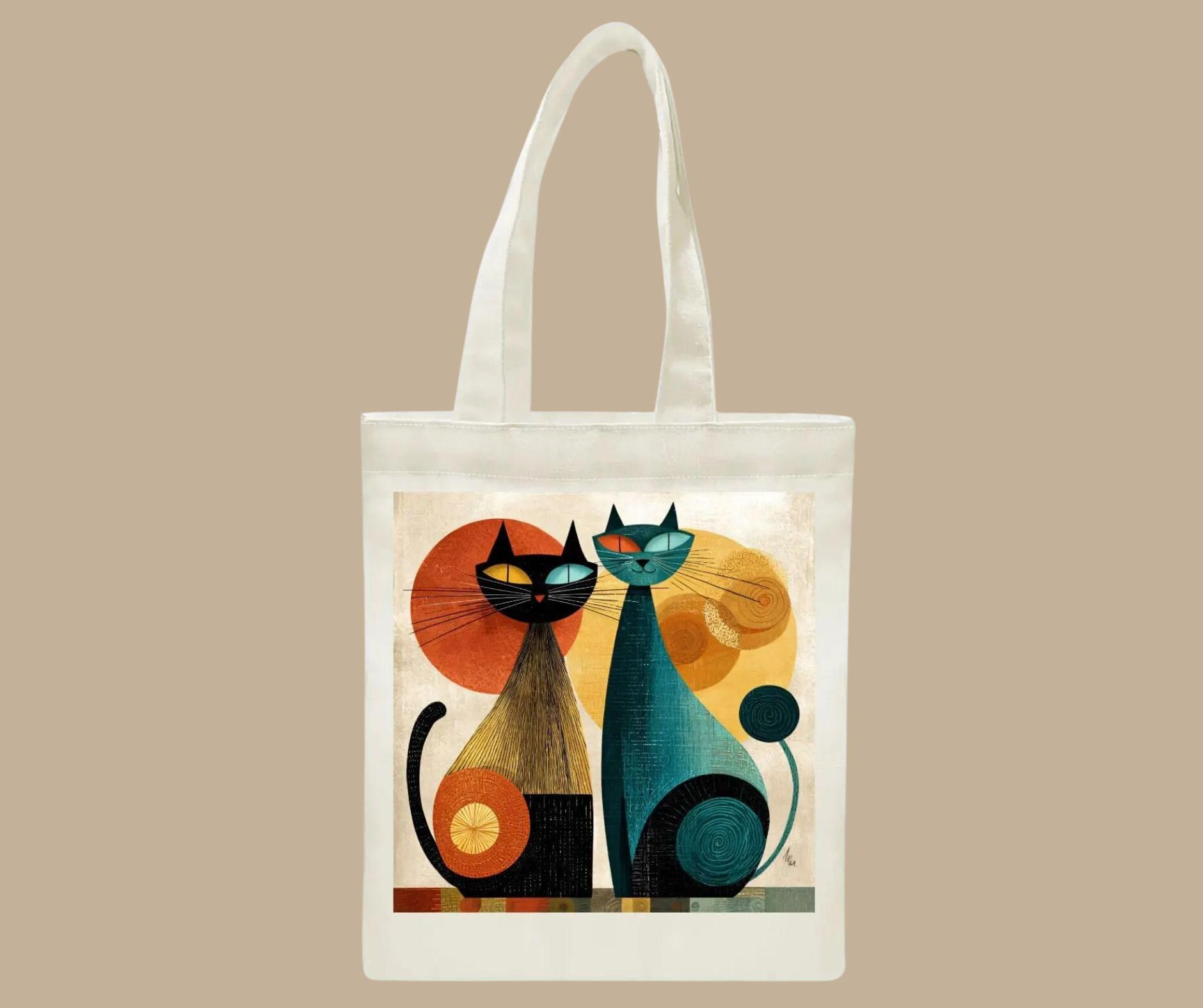 Fall in love with this retro-chic duo. 🎨🐈⬛🐈✨ This gorgeous canvas tote features two mid-century modern inspired cats sitting together against a warm geometric backdrop of oranges, golds, and teals. It’s stylish, artsy, and full of personality — the kind of tote that gets compliments everywhere you go.
