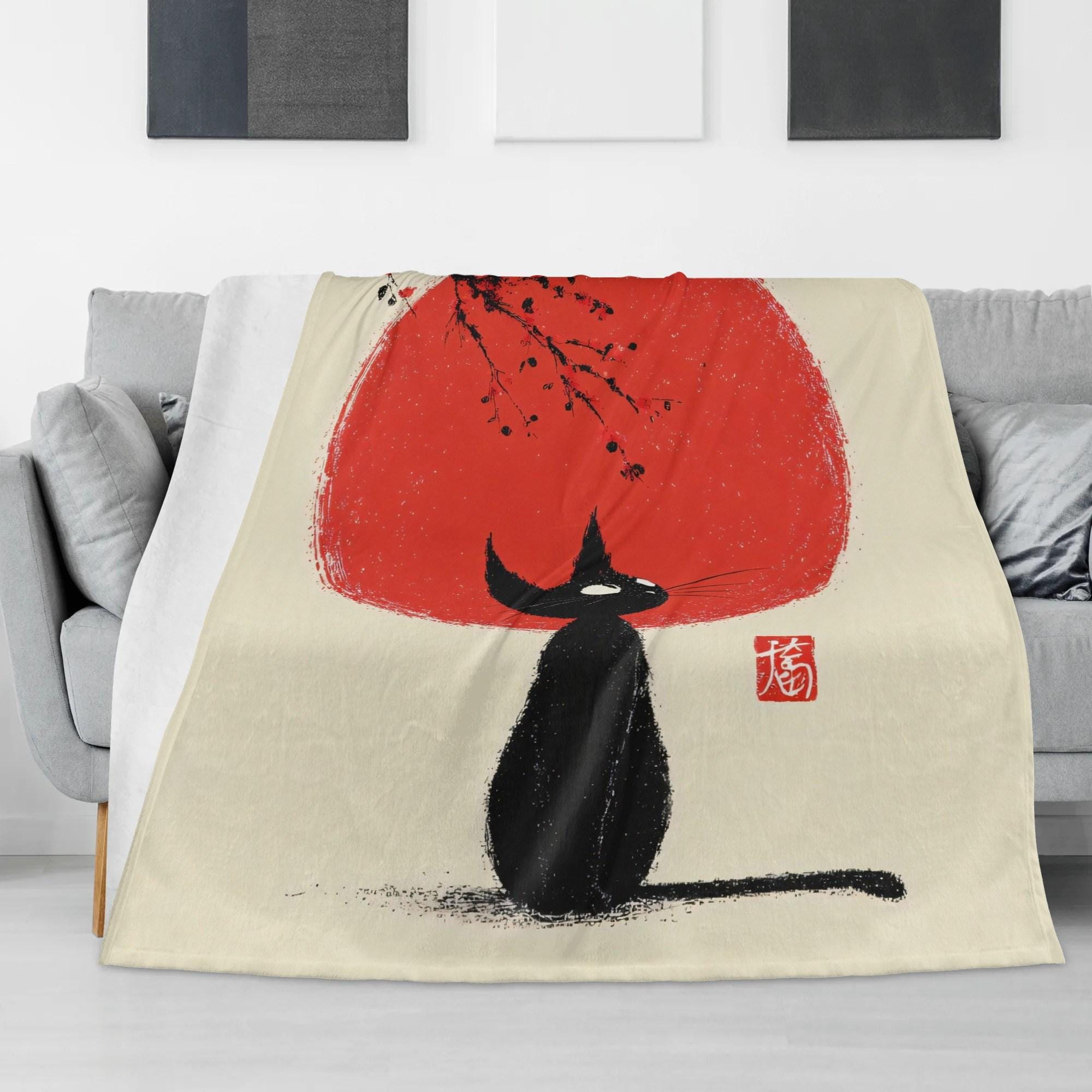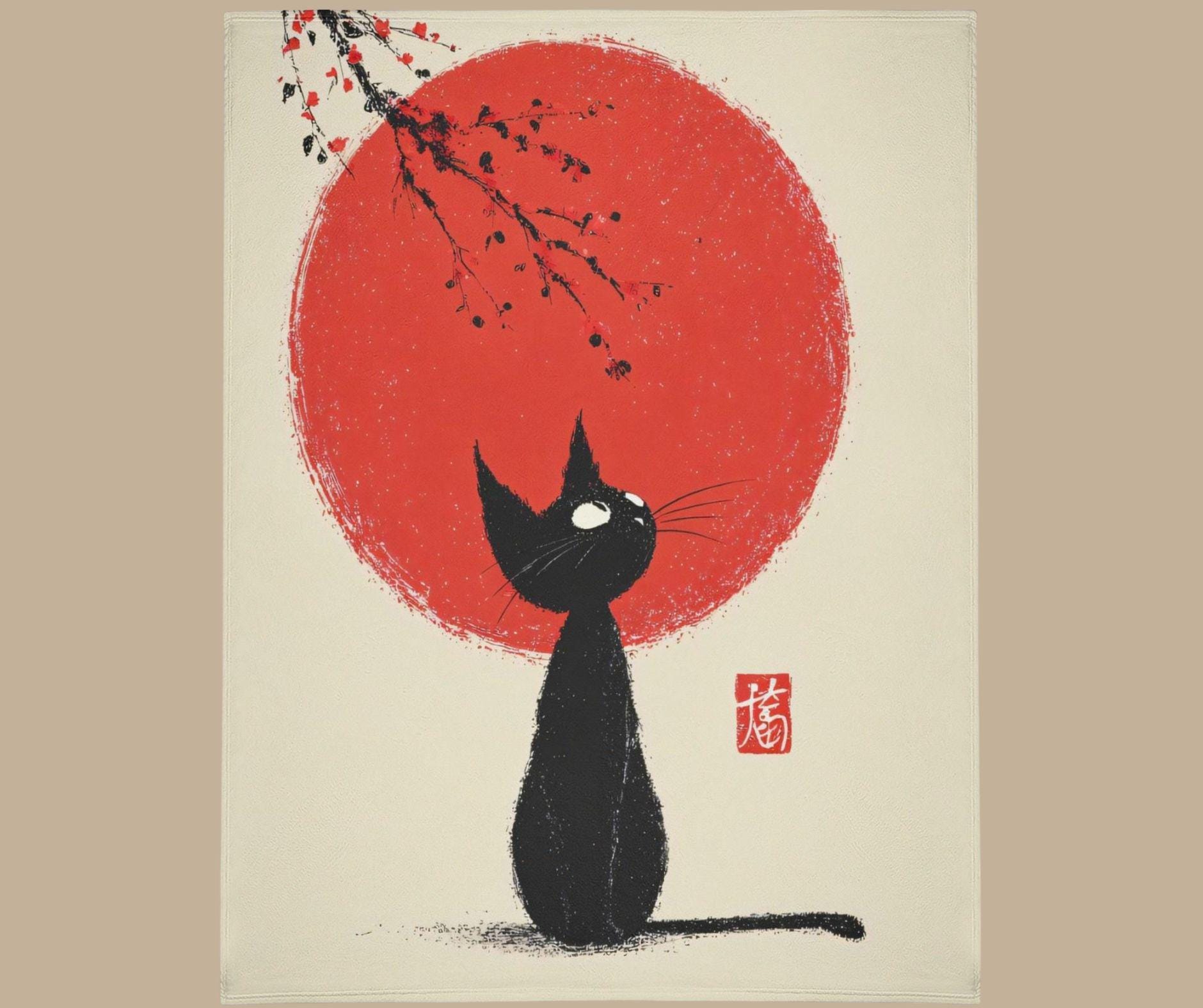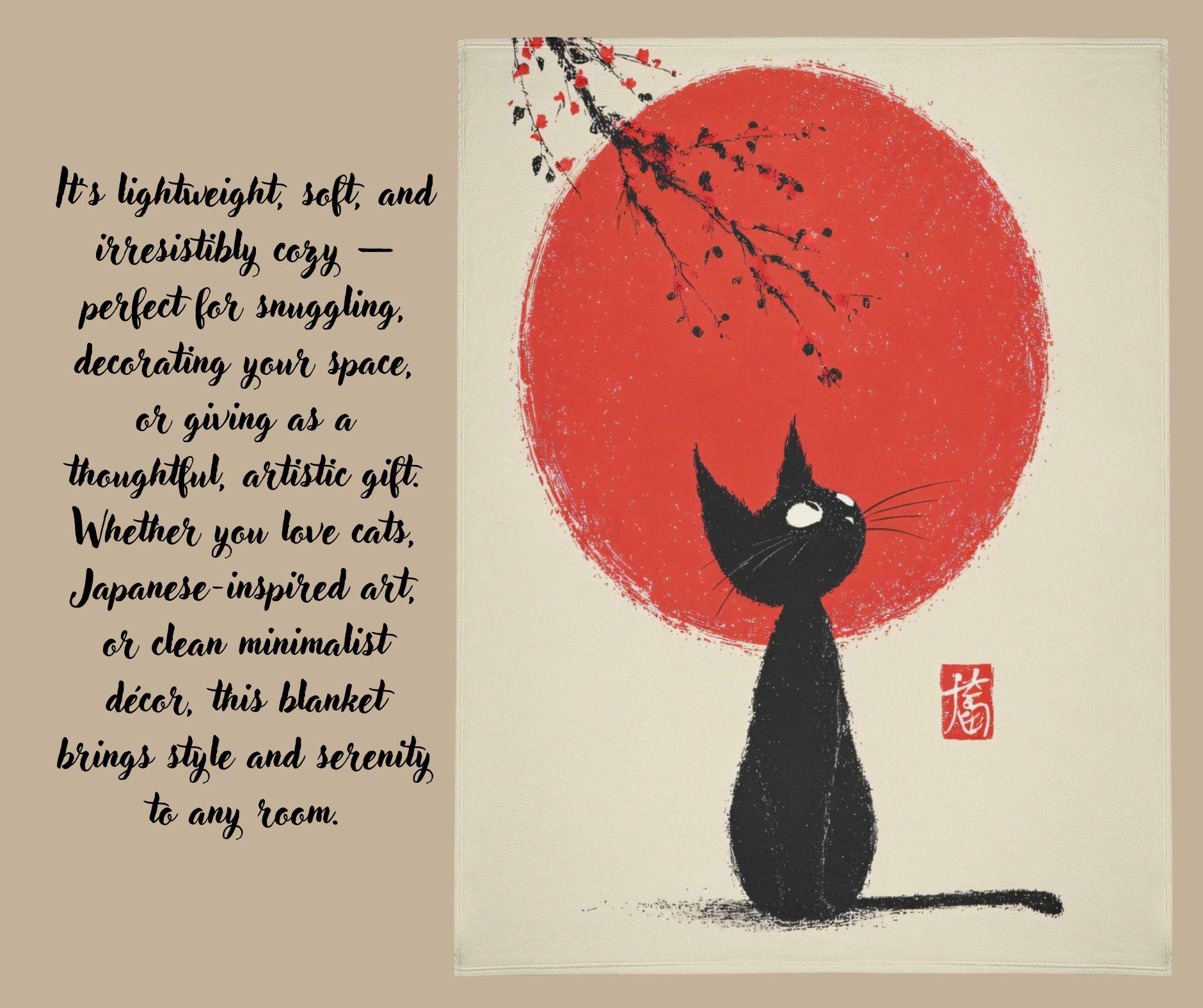 Bring a little magic, mystery, and minimalist beauty into your home with this breathtaking Japanese-inspired black cat blanket. Featuring a striking ink-brush style black cat sitting before a bold red sun and delicate cherry blossom branches, this piece blends traditional Asian art with modern cozy comfort.