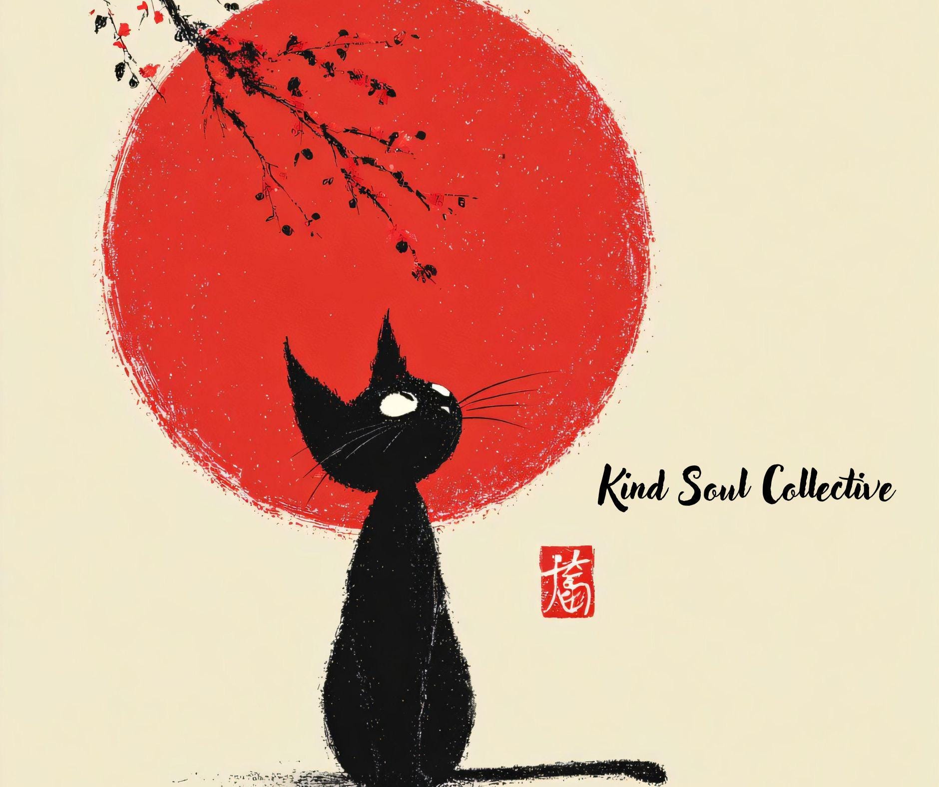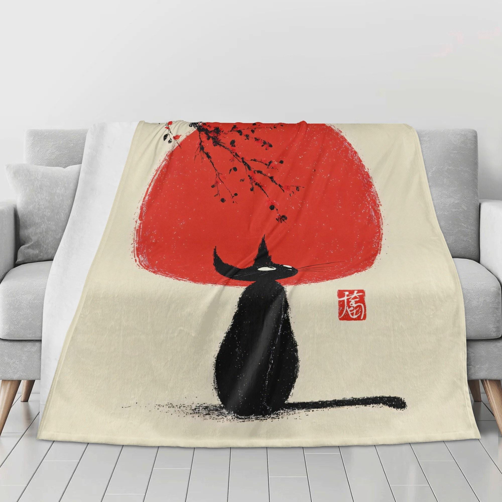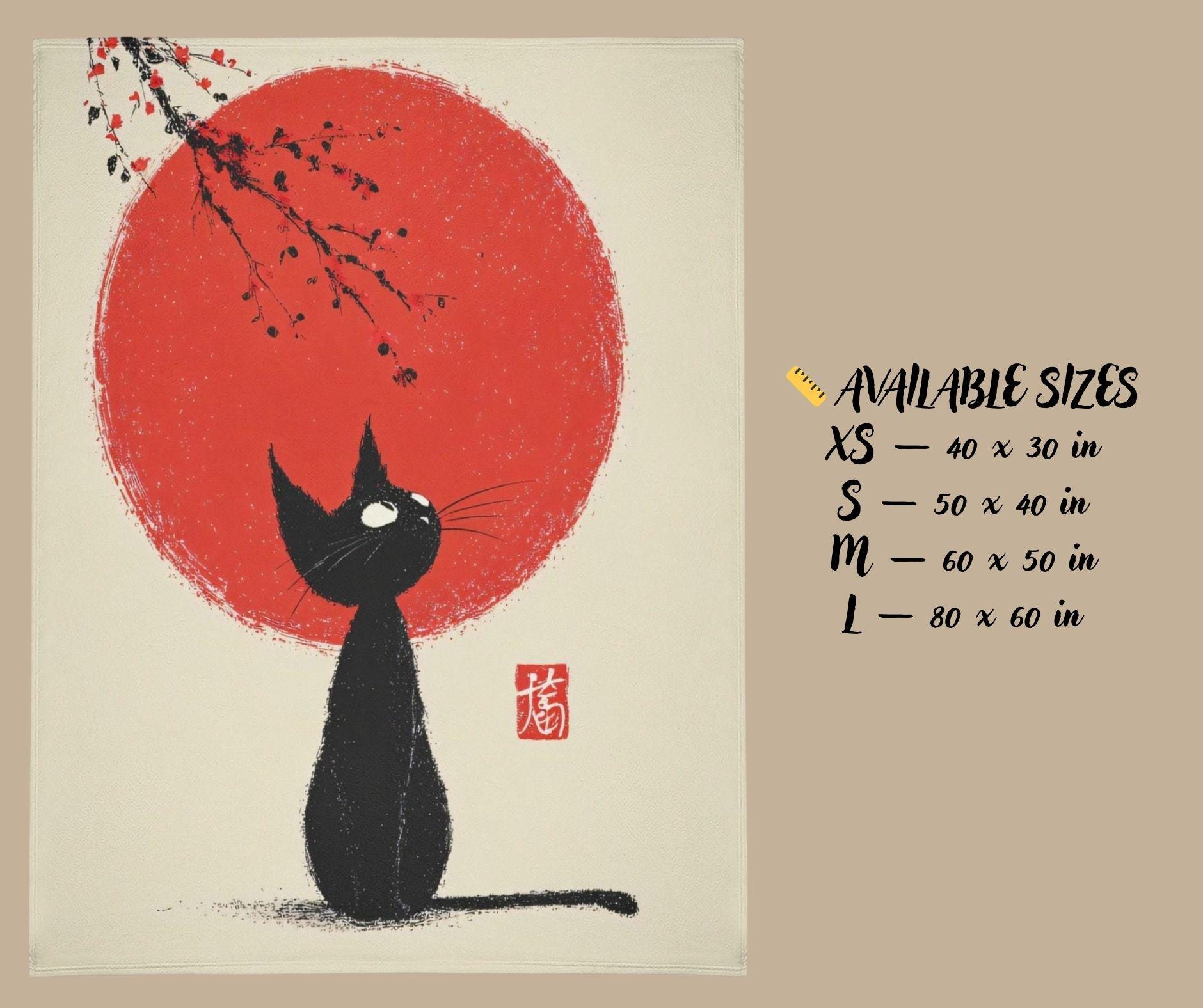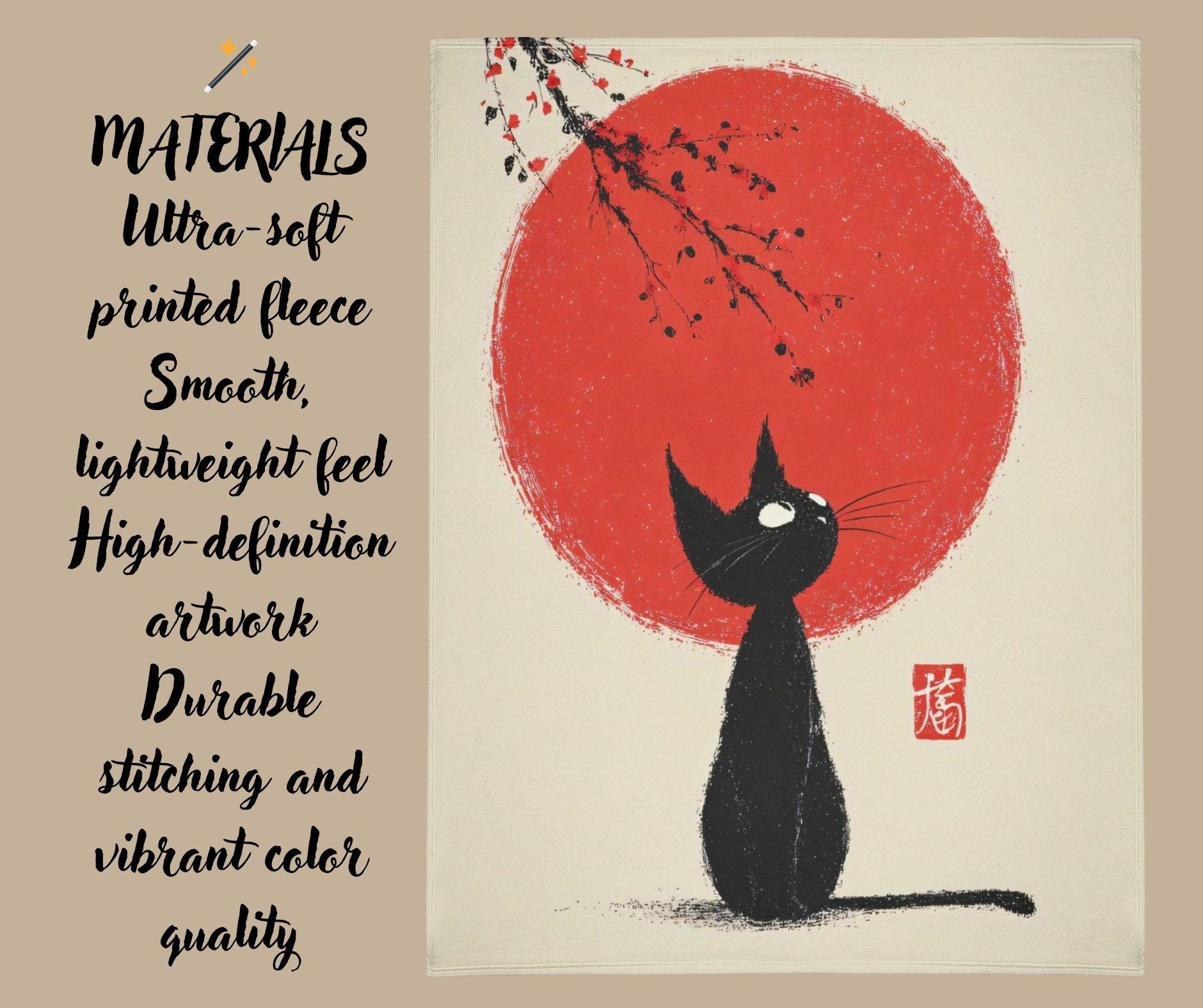 Bring a little magic, mystery, and minimalist beauty into your home with this breathtaking Japanese-inspired black cat blanket. Featuring a striking ink-brush style black cat sitting before a bold red sun and delicate cherry blossom branches, this piece blends traditional Asian art with modern cozy comfort.