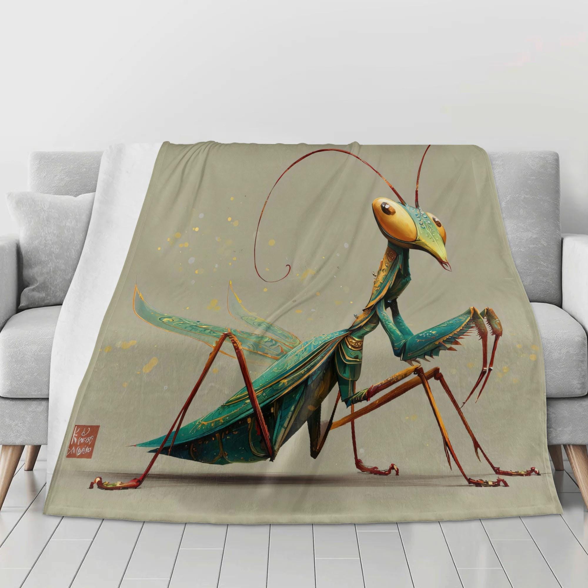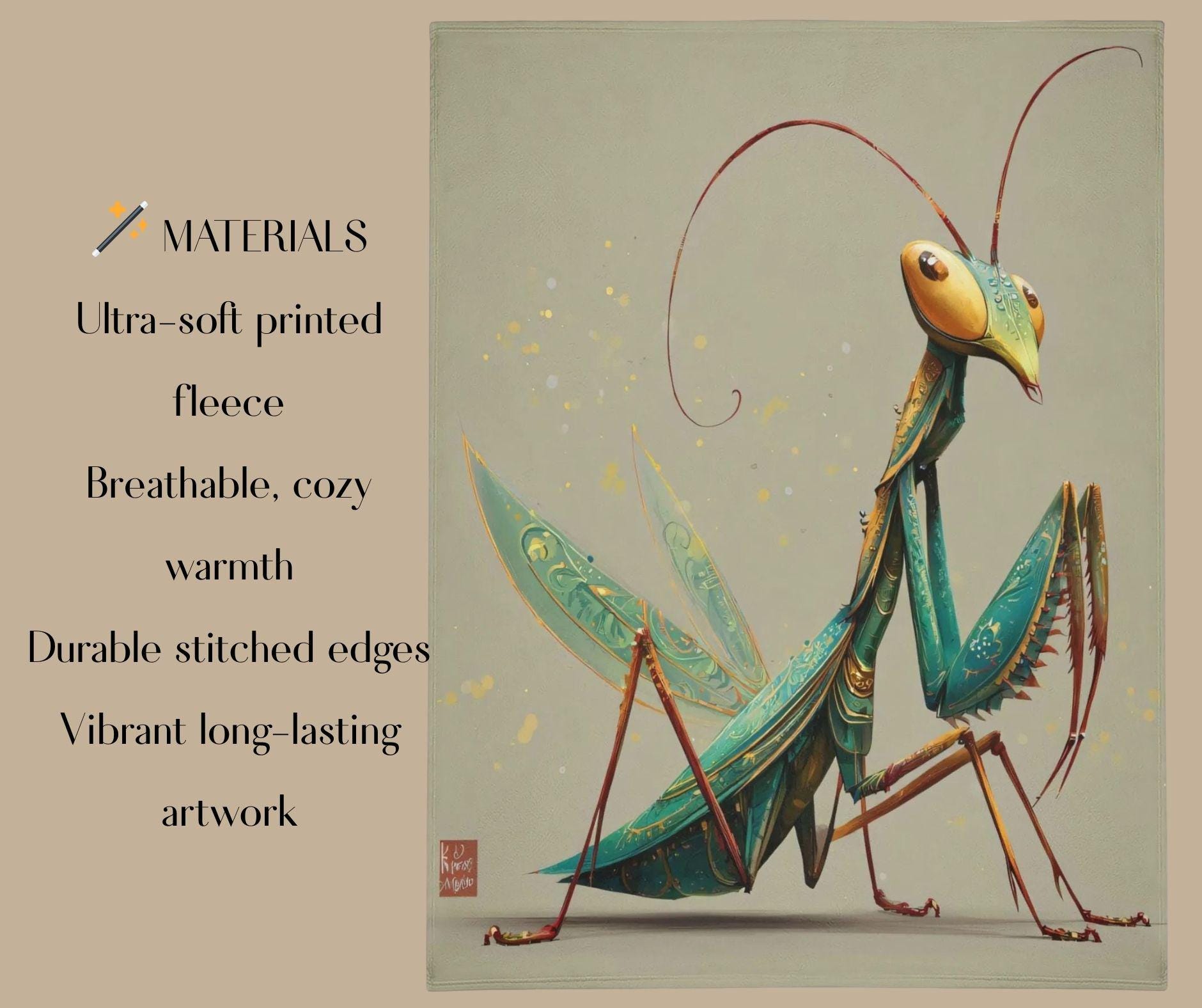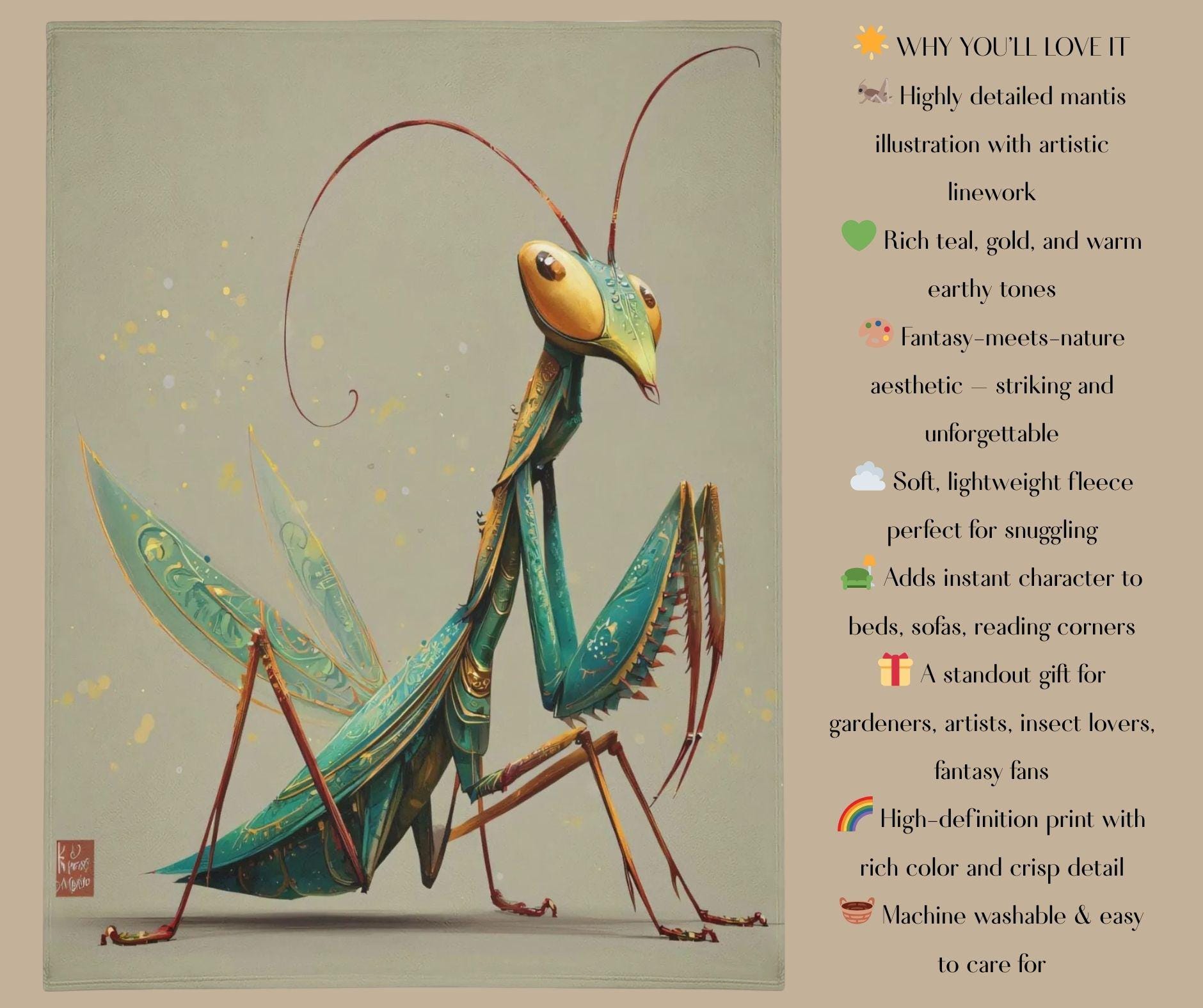 Wrap yourself in art that feels alive. ✨ This stunning fleece throw blanket features a teal-and-gold praying mantis illustrated with exquisite detail, set against a warm neutral backdrop sprinkled with glowing accents. It’s whimsical, elegant, and irresistibly unique — the perfect statement piece for cozy nights, creative spaces, and nature-inspired homes.