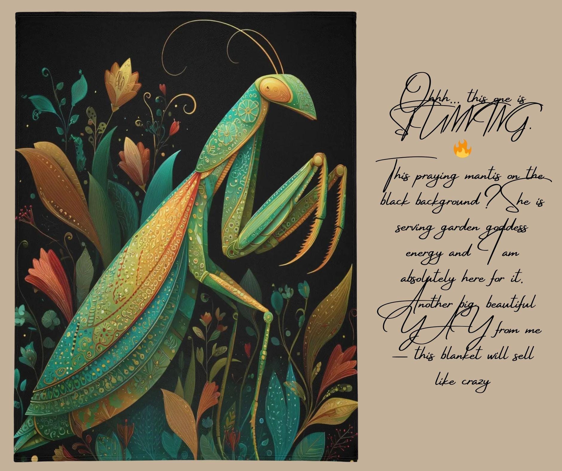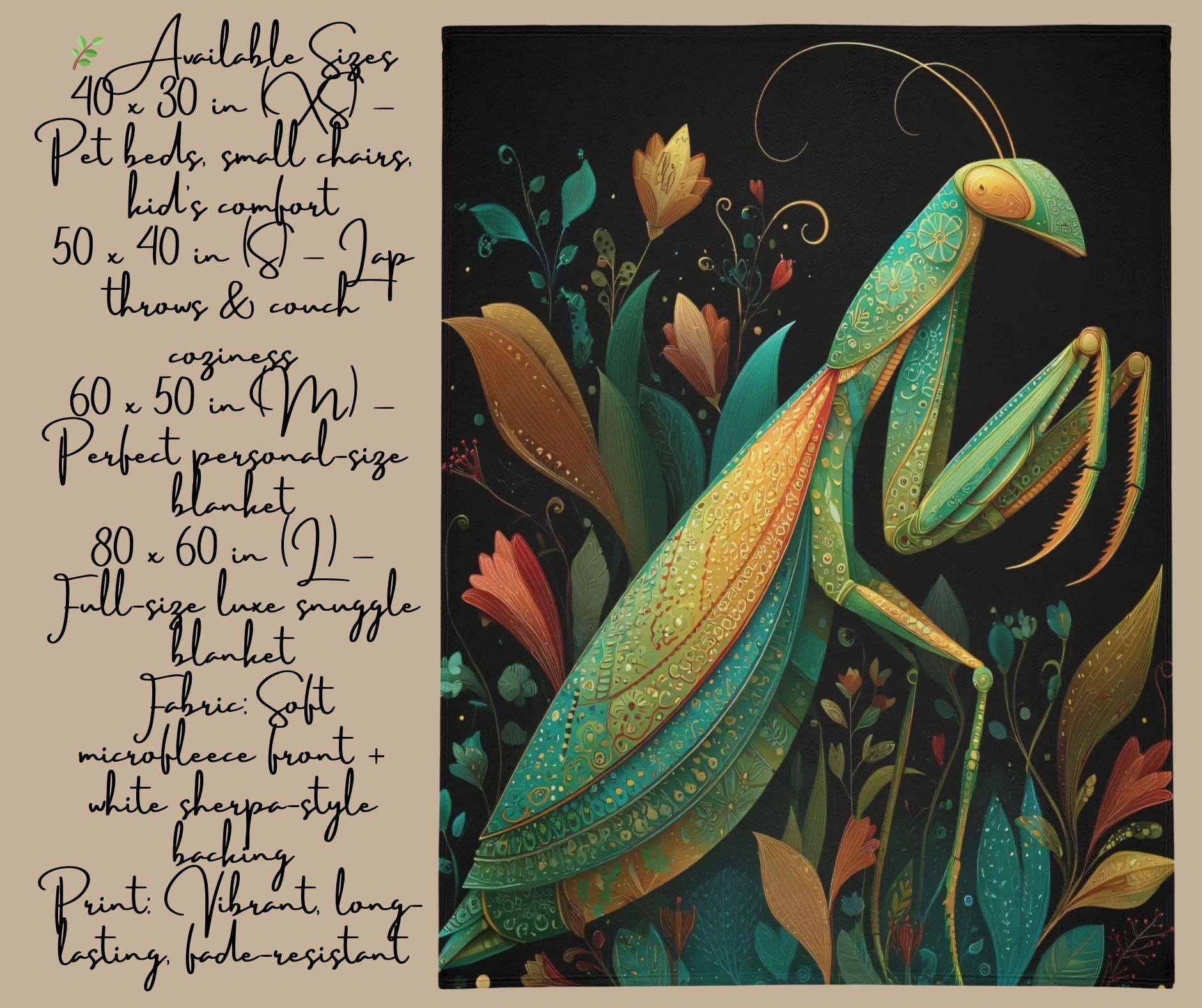 Wrap yourself in enchantment with this Majestic Praying Mantis Botanical Blanket, a breathtaking blend of nature-inspired artwork, vibrant emerald tones, and cozy softness. This dreamy throw features an intricately detailed mantis resting among lush florals, glowing in jeweled greens, golds, and teals — a statement piece for anyone who loves art, insects, or magical garden aesthetics.