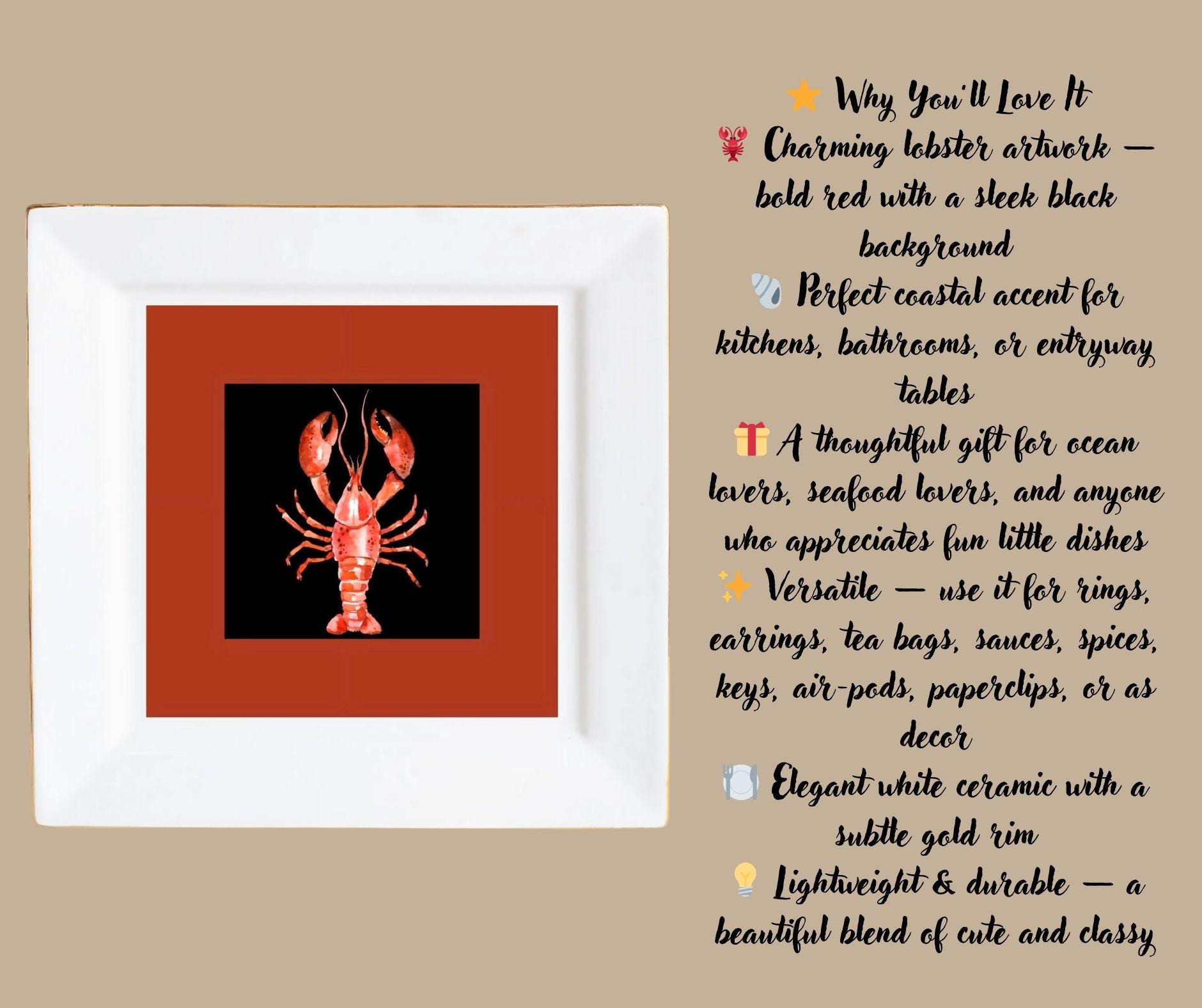 Bring a splash of coastal charm to your table with this bold and beautiful Lobster Square Ceramic Plate — the perfect little pop of nautical style for anyone who loves the sea! The vivid red lobster artwork sits on a dramatic black center with a warm red border, giving it that modern-coastal look that feels fresh, fun, and gift-ready.