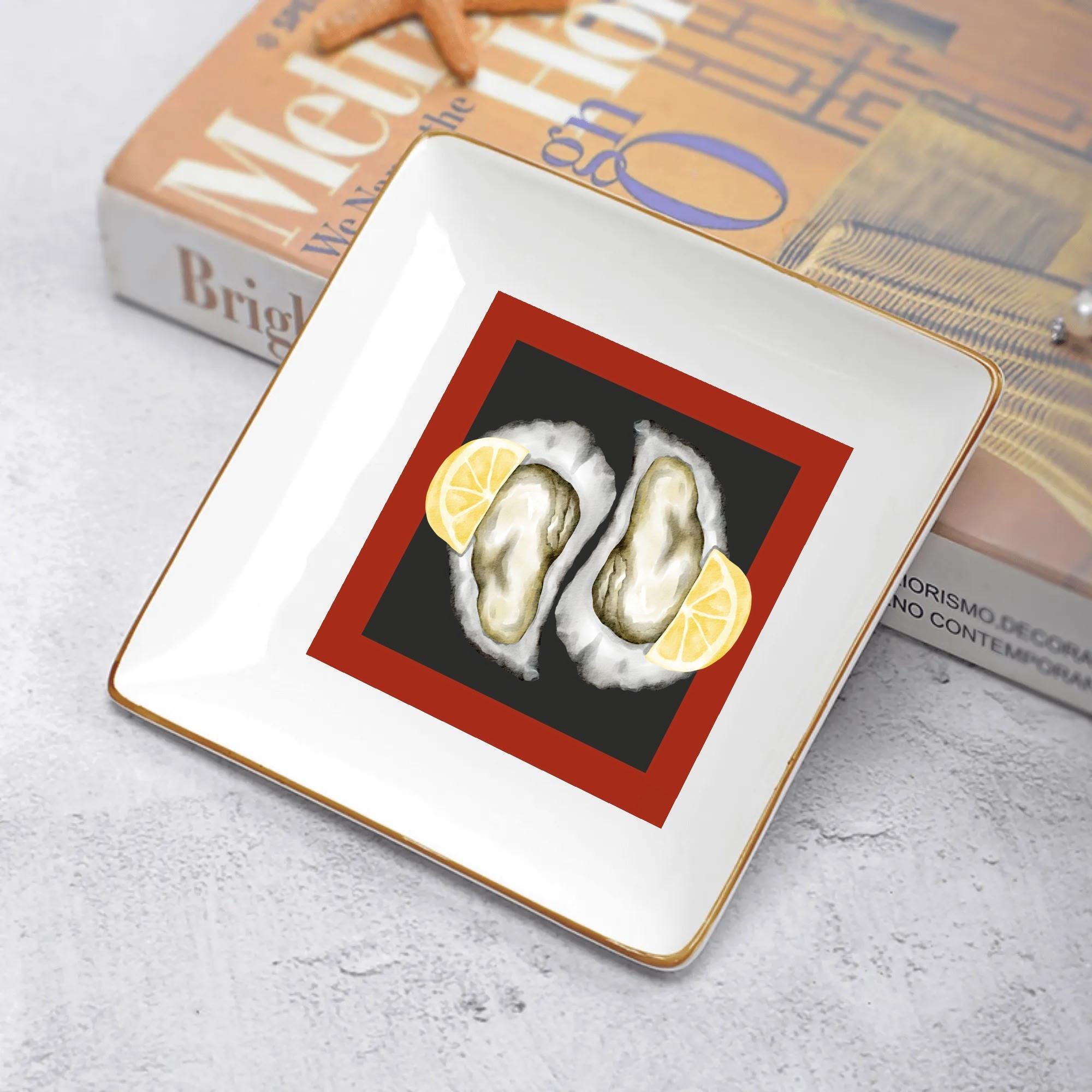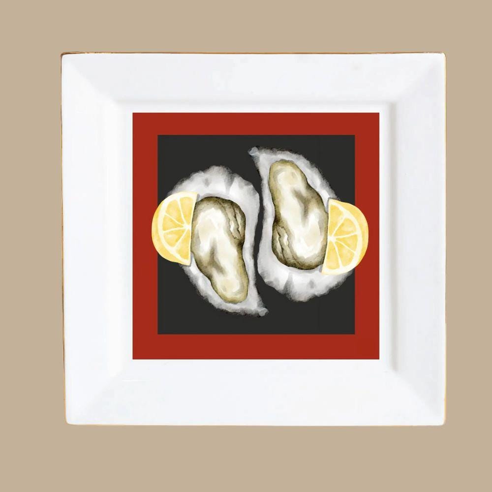 Bring a touch of coastal charm to your table with this modern oyster ceramic plate from the Kind Spirit Collective. Featuring two hand-painted watercolor oysters with bright lemon slices against a bold black background and classic red frame, this artistic dish is perfect for seafood lovers, entertainers, and coastal décor fans alike.