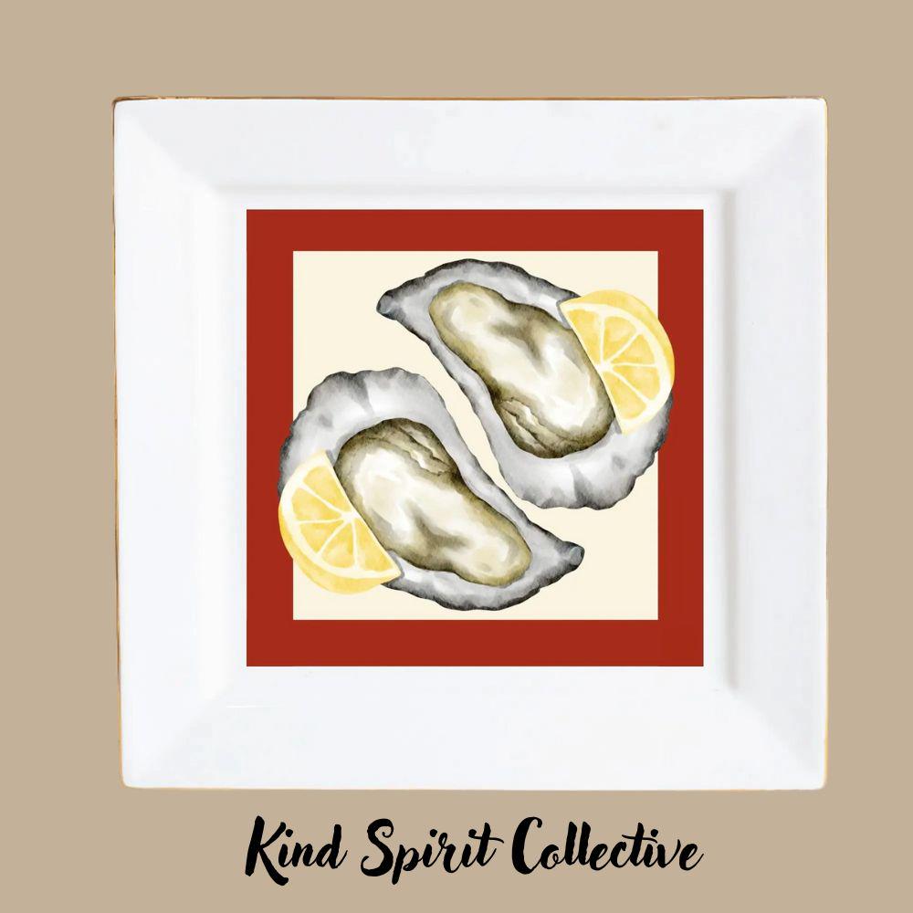 Featuring two beautifully illustrated oysters paired with bright lemon wedges inside a bold red border, this design feels both modern and classic — a perfect fit for seafood lovers, beach homes, oyster bar décor, and anyone who loves a hint of seaside elegance.