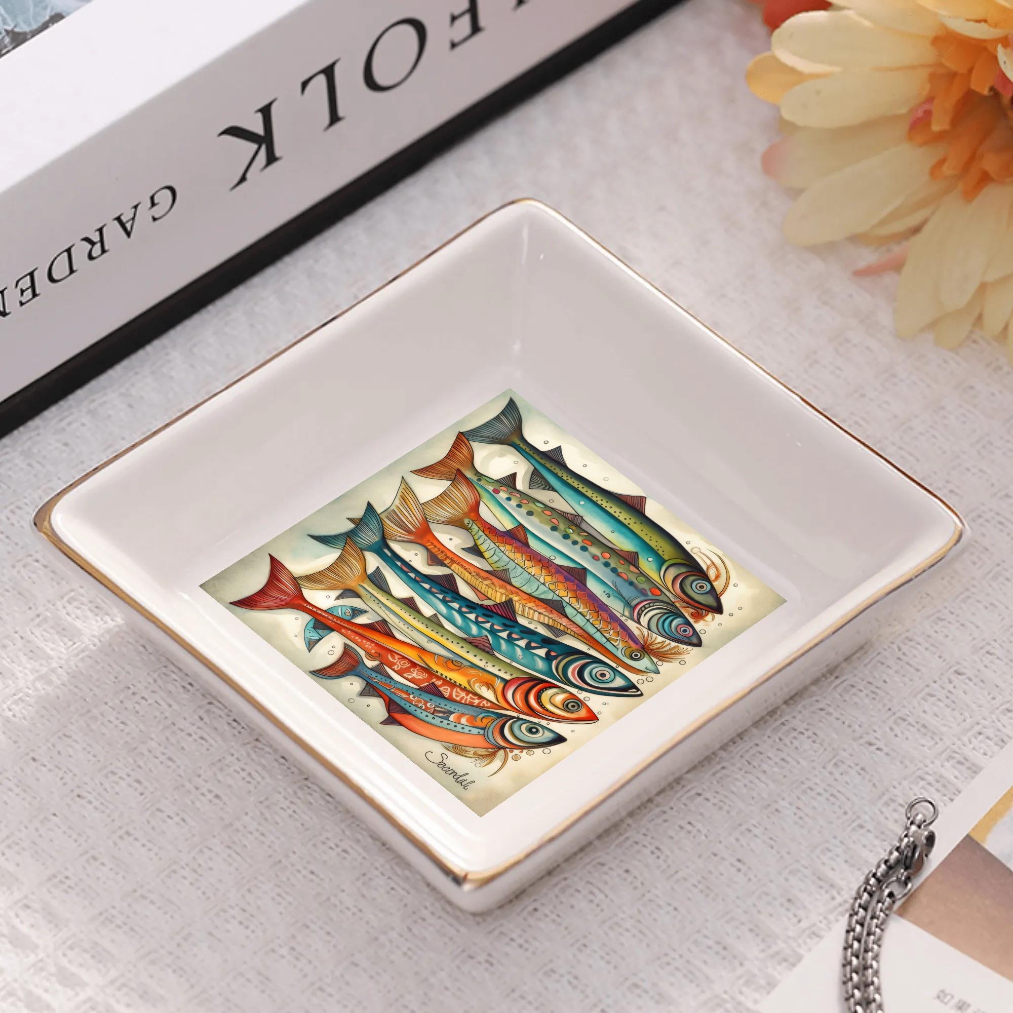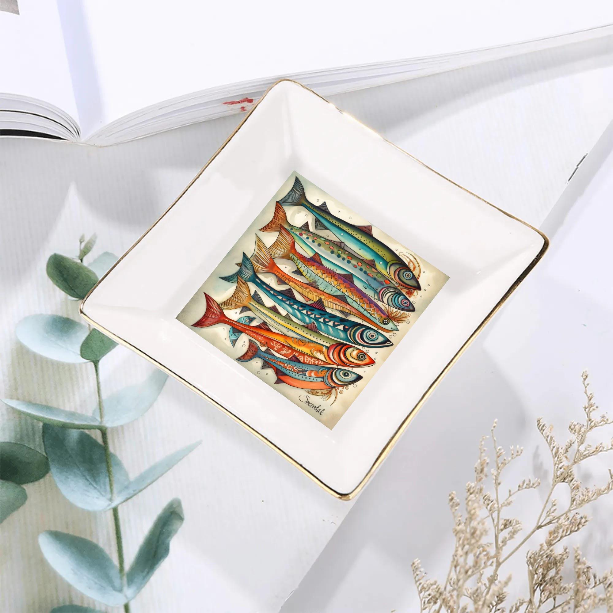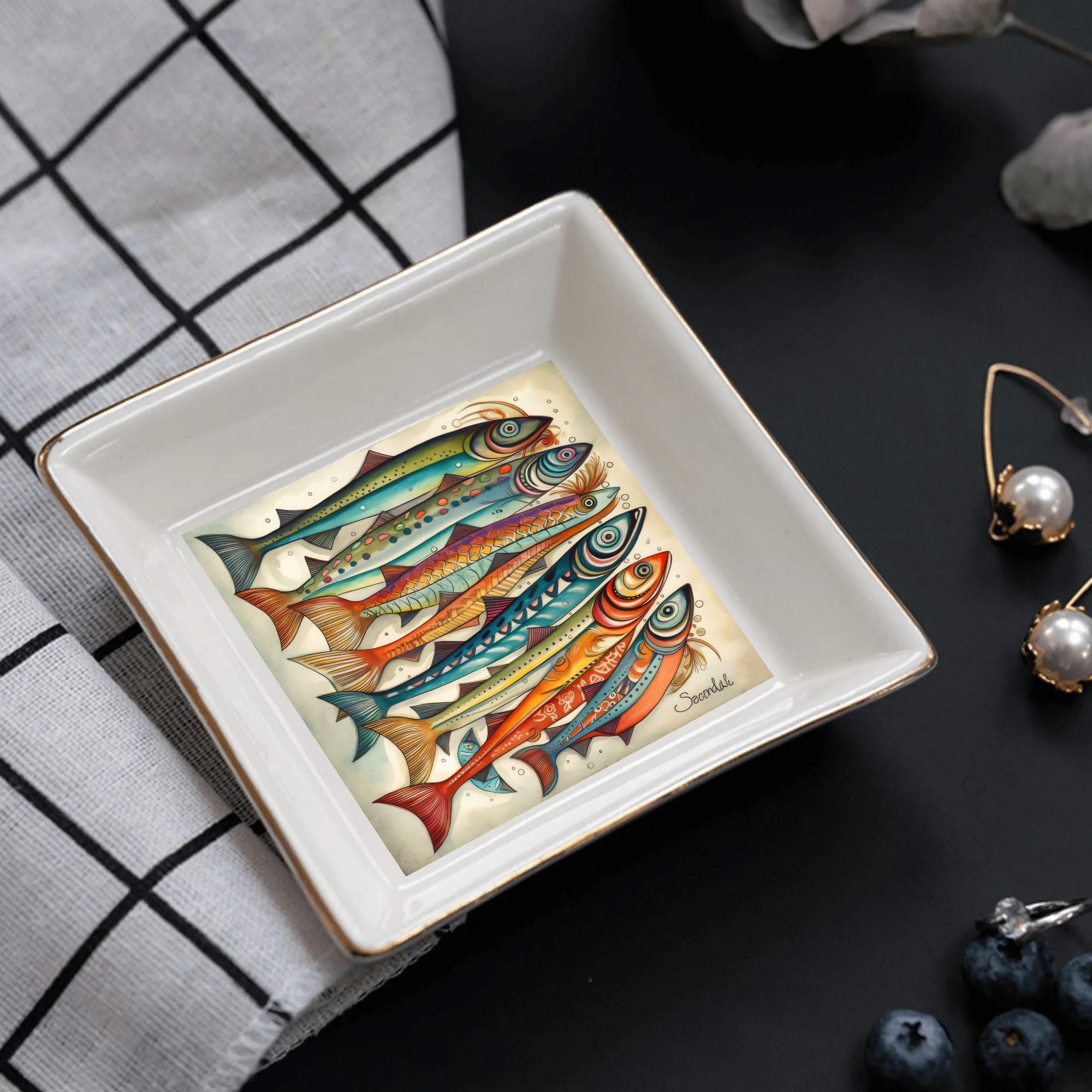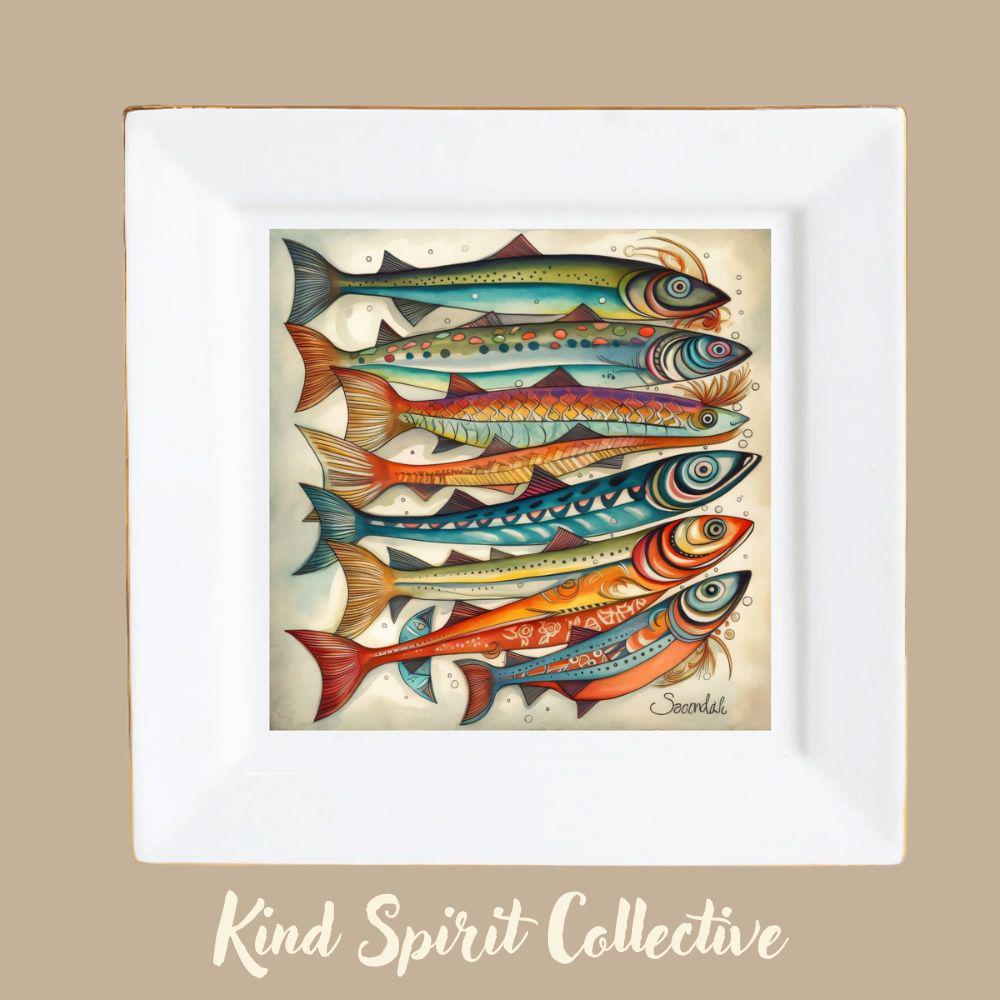Bring a splash of coastal magic into your home with this artistic ceramic square plate, featuring a beautifully illustrated lineup of vibrant, patterned fish. Exclusive to Kind Spirit Collective, this plate transforms everyday tableware into a miniature art gallery.