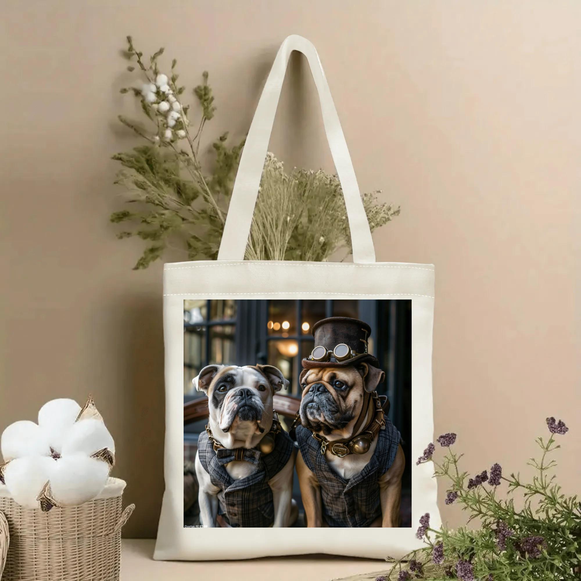 Meet the most distinguished shopping companions you’ll ever own. This charming tote features two impeccably dressed dogs in a whimsical steampunk-inspired portrait—top hats, goggles, and all. Equal parts playful and sophisticated, this bag is guaranteed to spark smiles and conversations wherever you go.