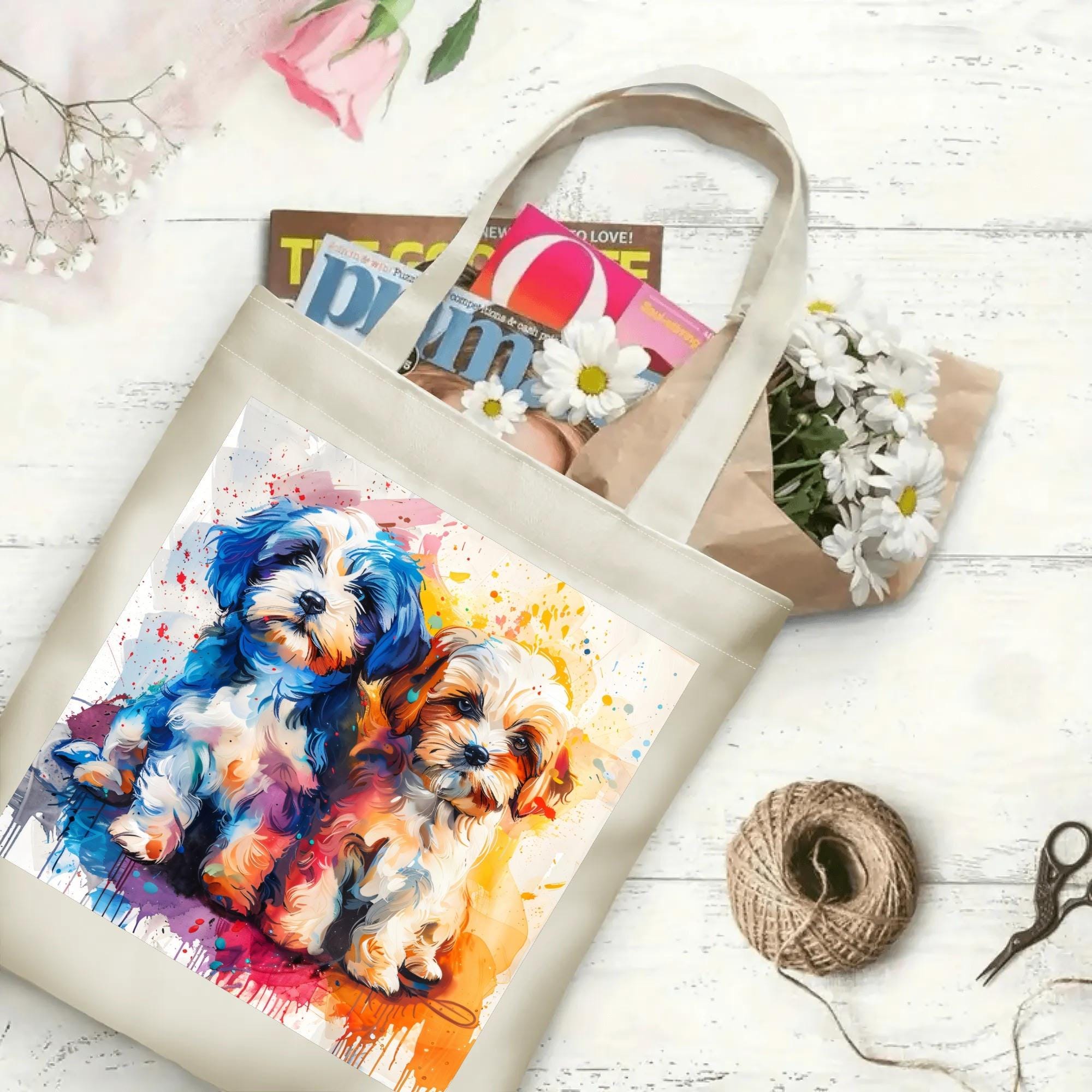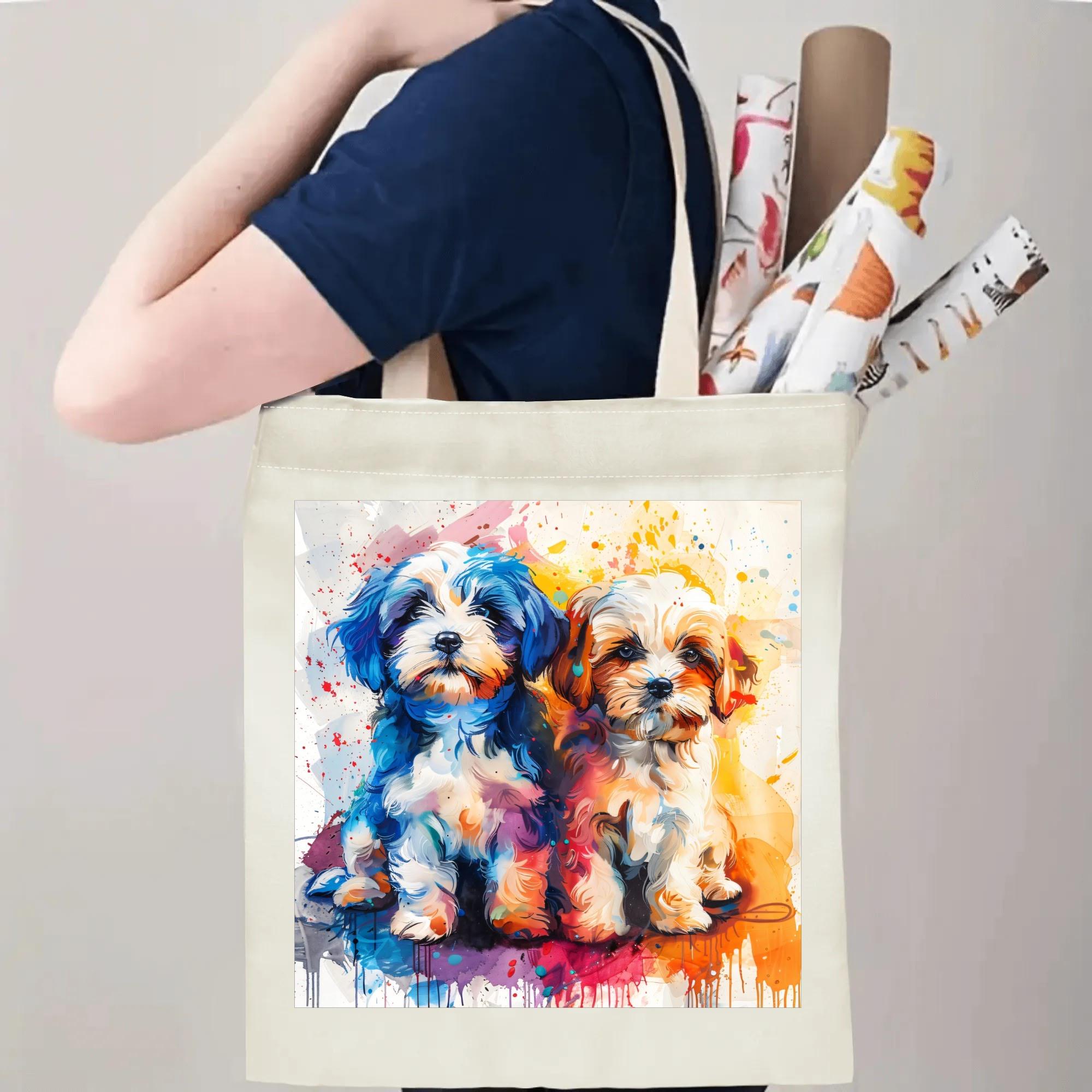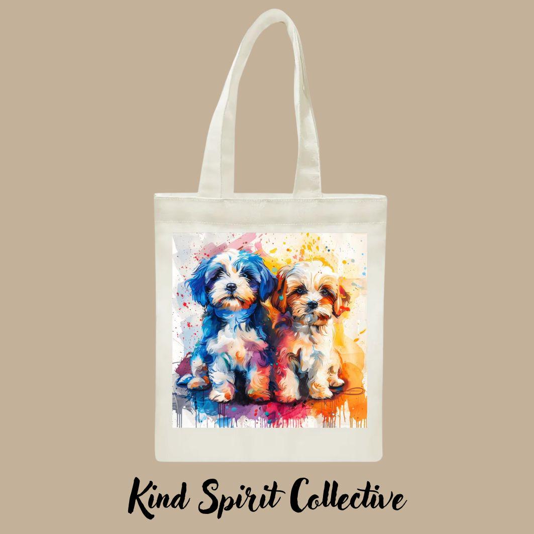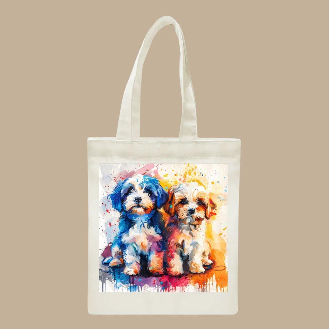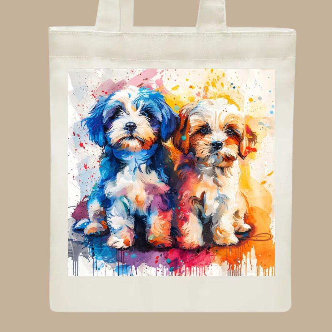 Bring instant joy wherever you go with this vibrant, art-forward tote featuring two irresistibly cute puppies painted in bold, expressive colors. This design is full of personality, movement, and heart—perfect for dog lovers who appreciate playful art with a modern twist.