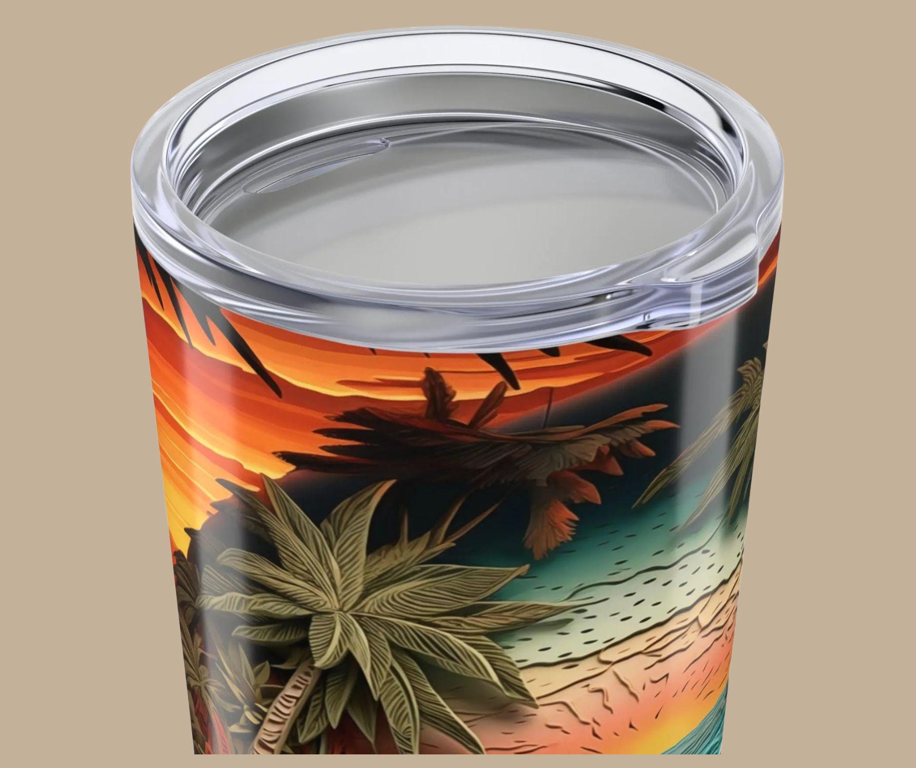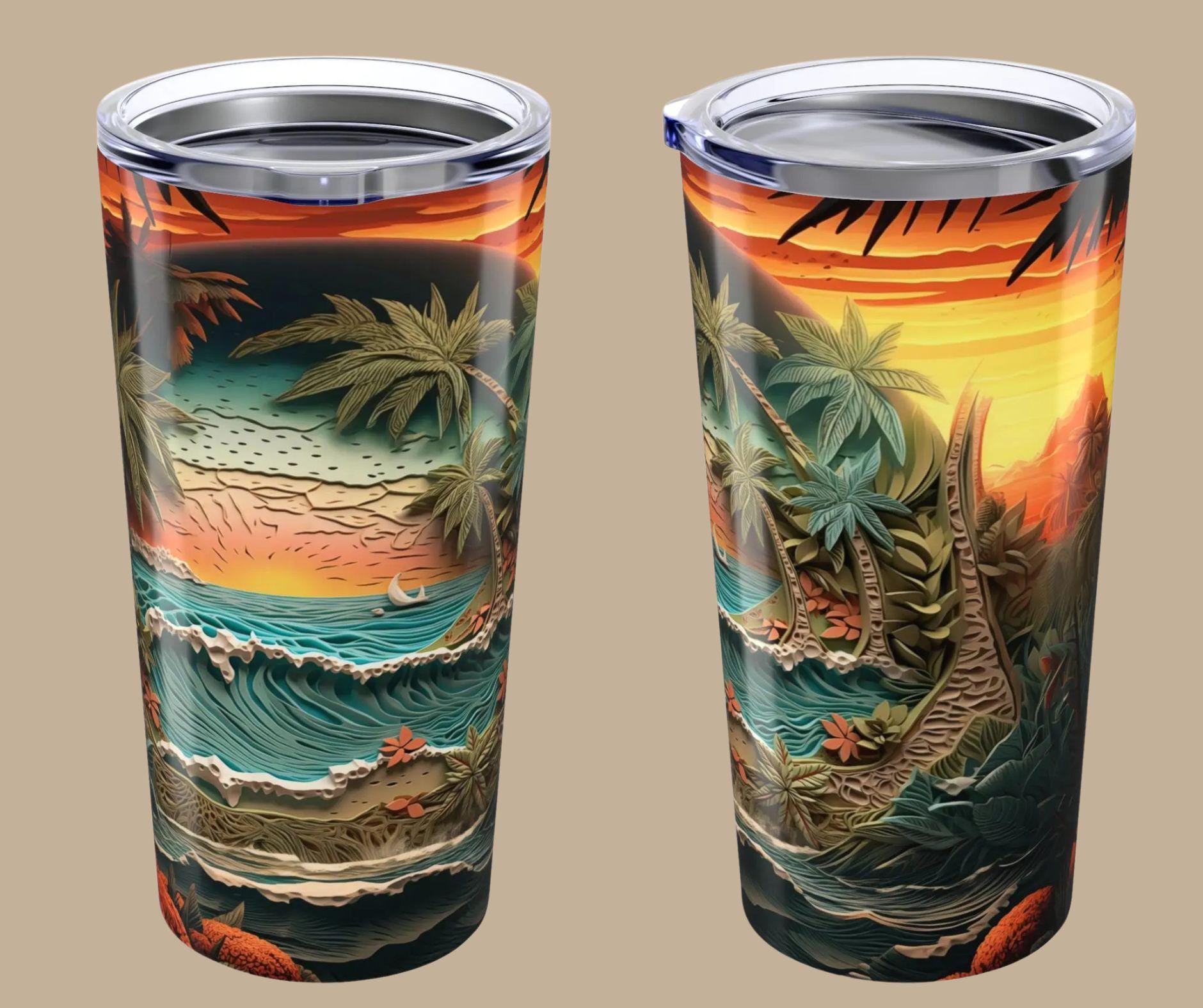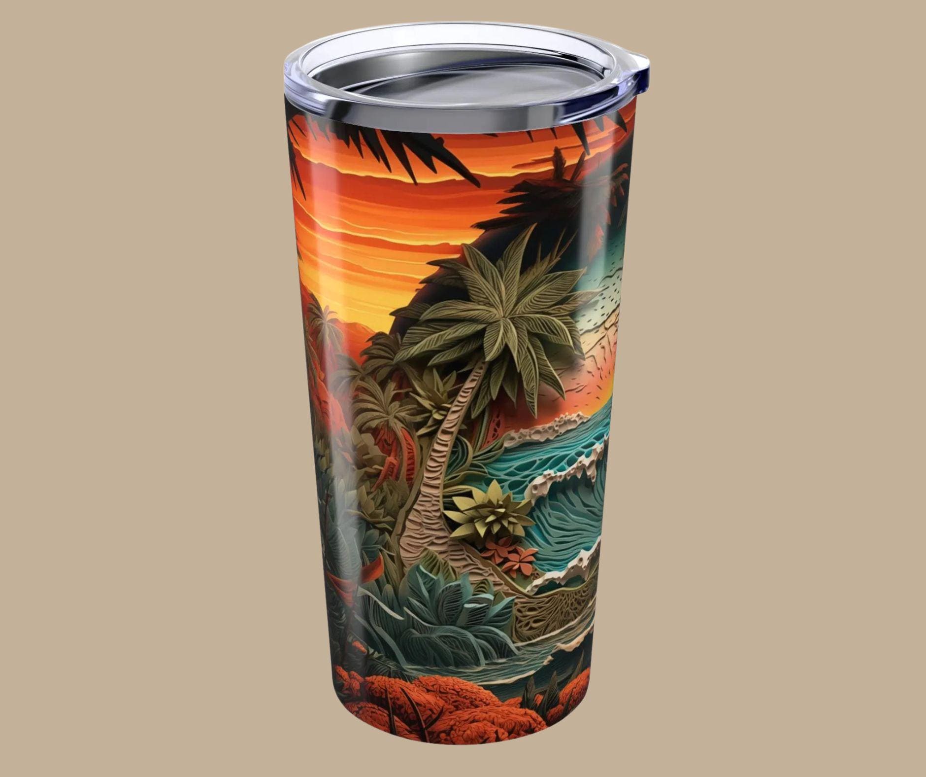 Bring the warmth of a tropical sunset into every sip with this breathtaking Sunset Palms Insulated Tumbler. Featuring a richly detailed coastal scene with glowing skies, rolling ocean waves, and silhouetted palm trees, this tumbler captures the feeling of golden hour by the sea.