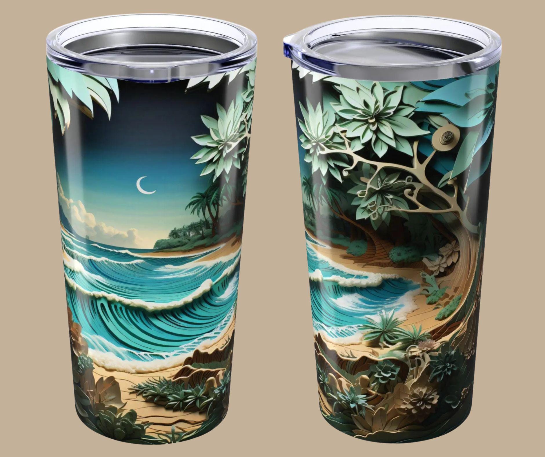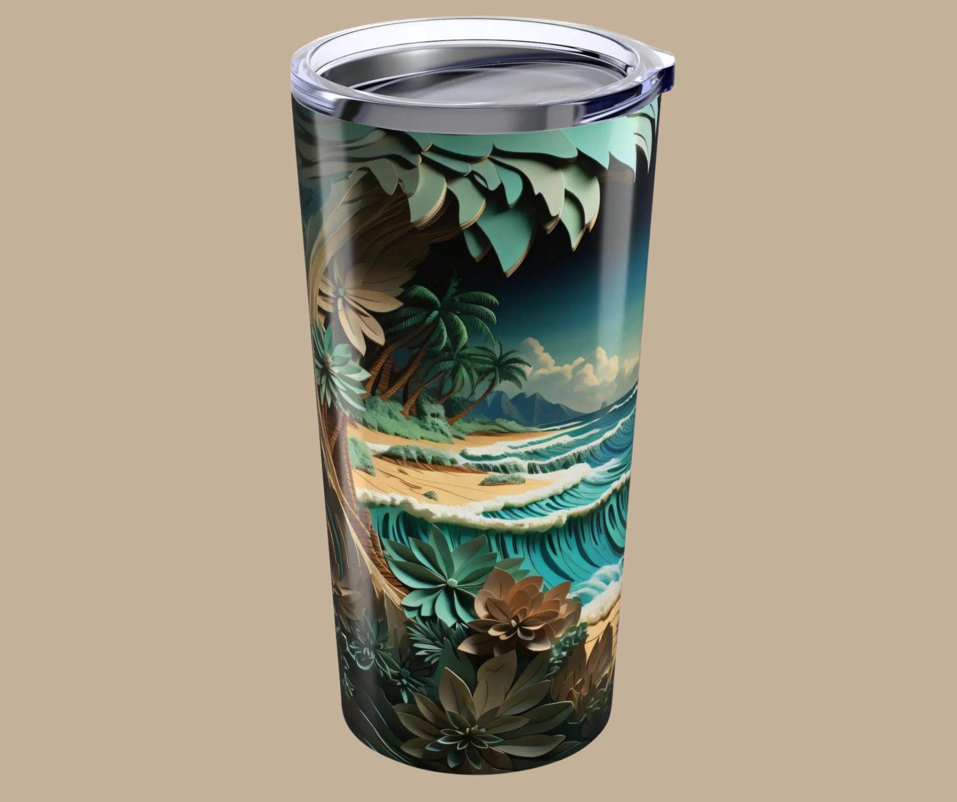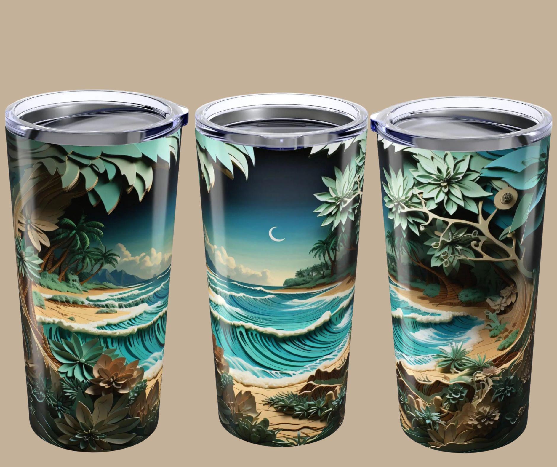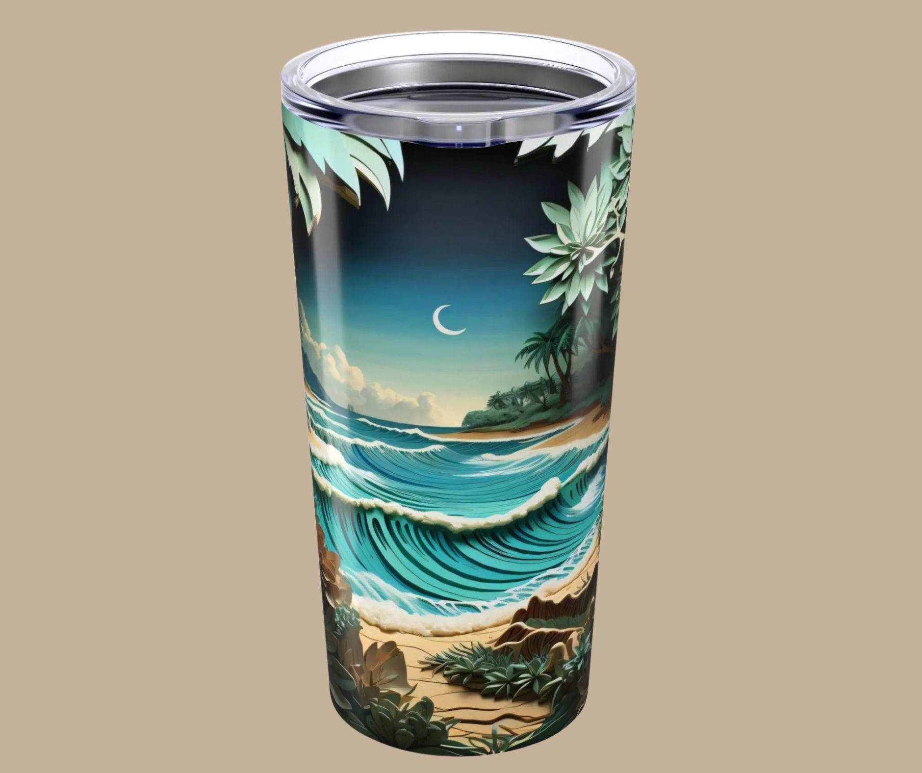 A 20oz stainless steel tumbler that carries a quiet coastal evening wherever you go. The wraparound glossy print shows moonlit waves rolling onto a tucked-away beach, framed by lush tropical foliage. It feels like a slow, reflective walk along the shore after sunset — warm hands around a hot drink or cool condensation from iced tea. Built to live in backpacks, car cup holders, and morning routines, the tumbler keeps drinks at the right temperature while the artwork sparks a small moment of calm between errands, surf sessions, or late-night studio work.