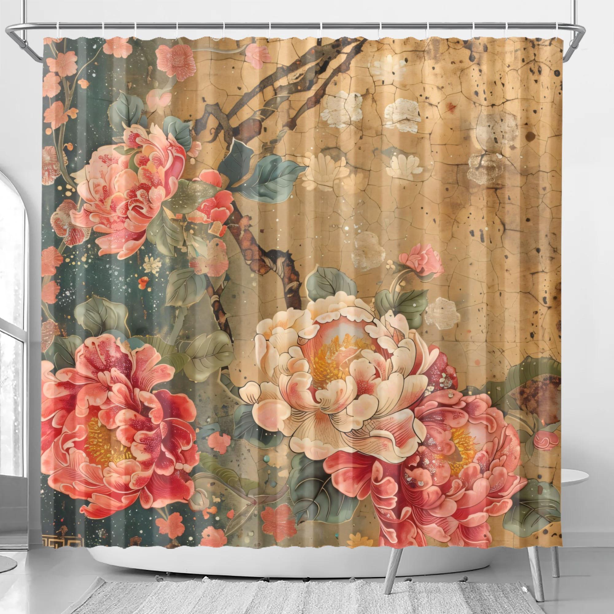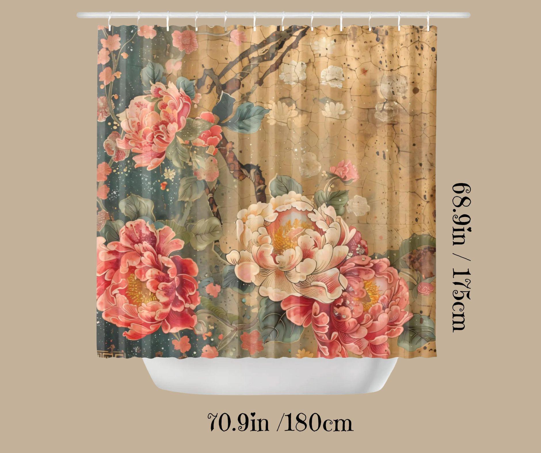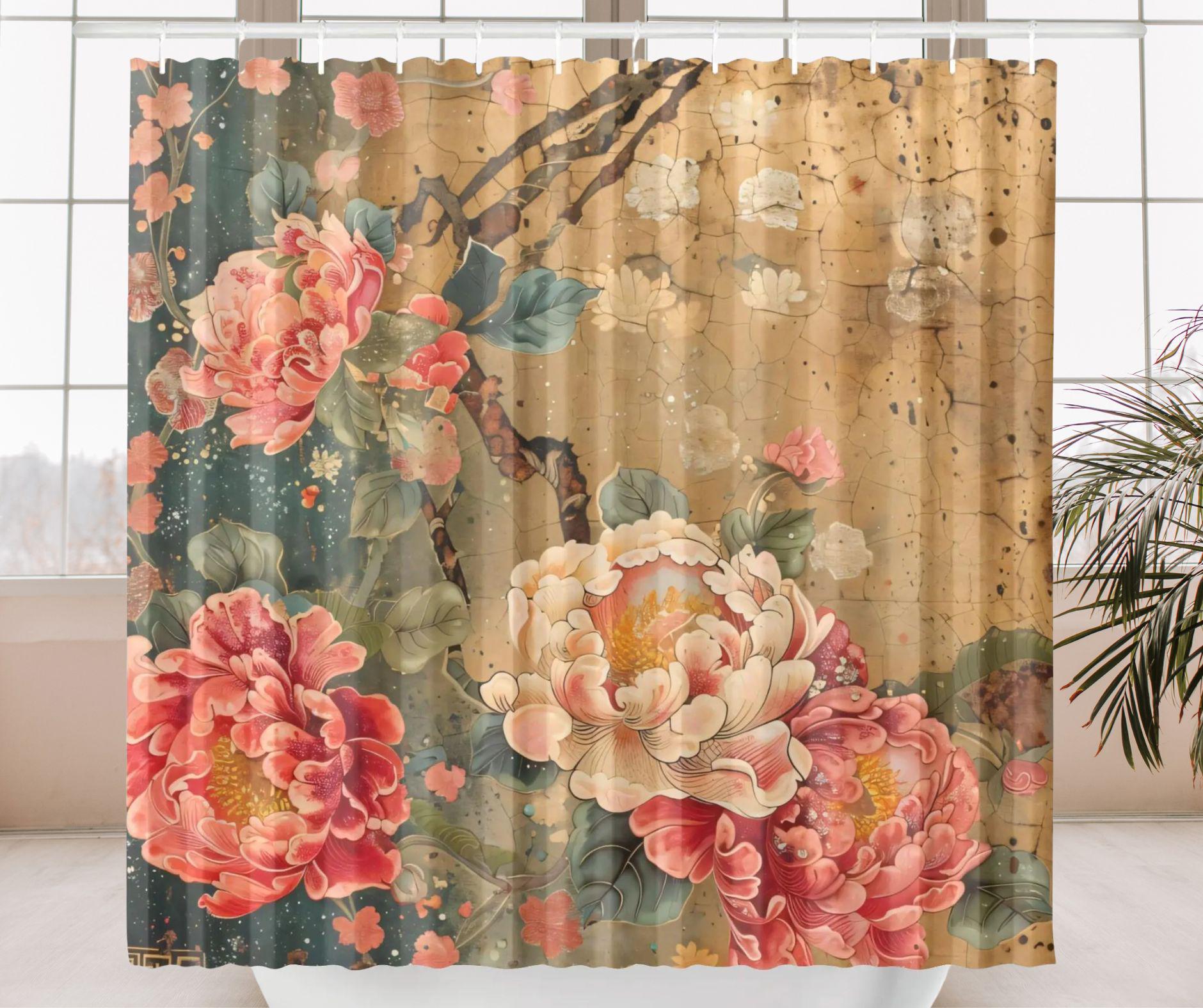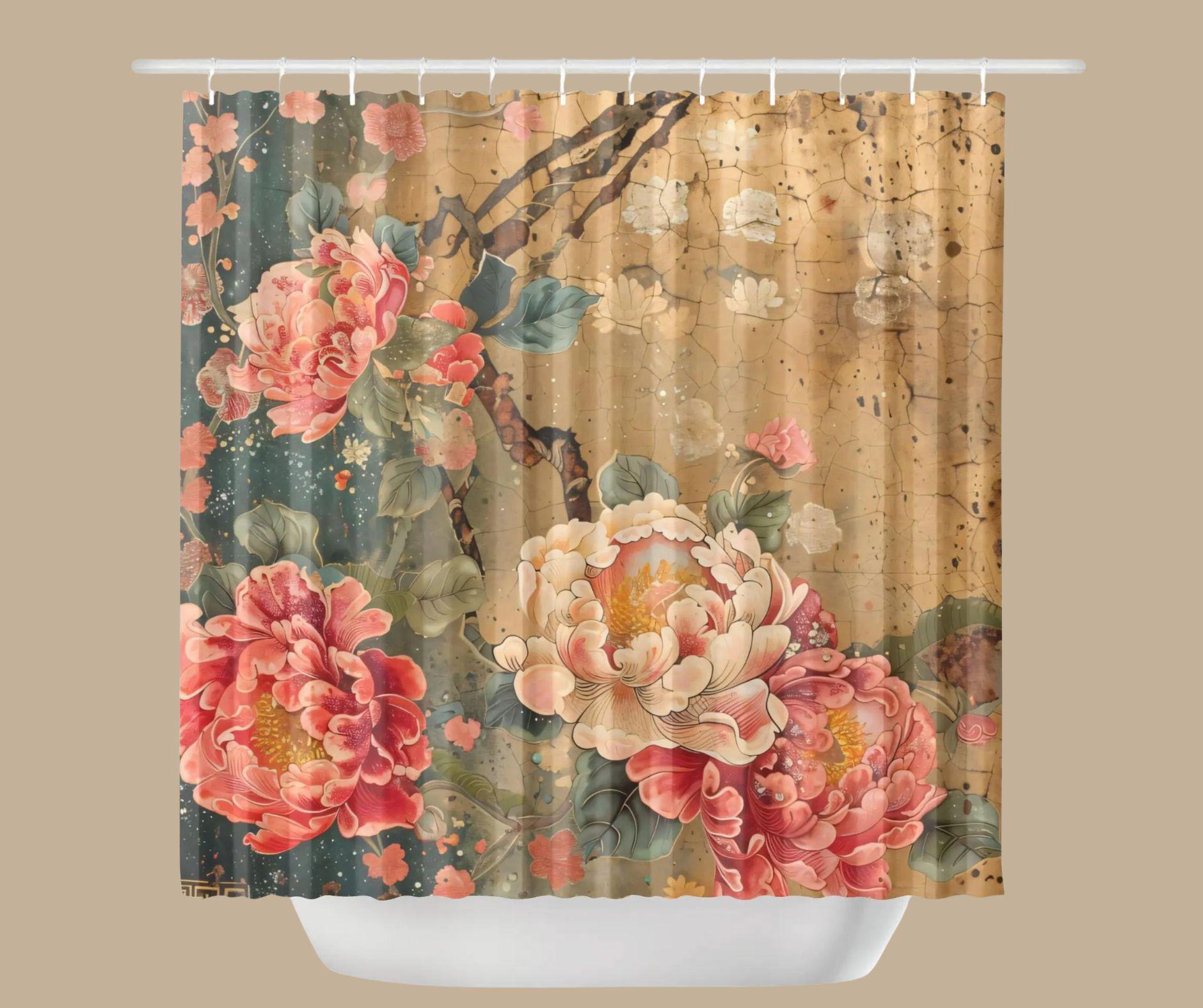 This exquisite shower curtain features lush peony-style florals in soft coral, blush, and cream tones layered over a warm, antique-inspired background. The design has a beautifully aged, painterly feel—like a treasured piece of botanical art passed down through generations.