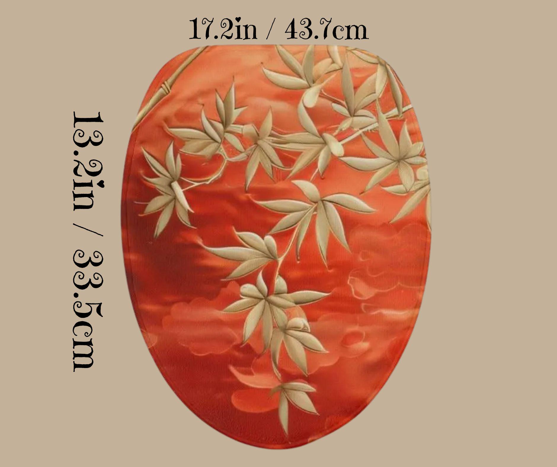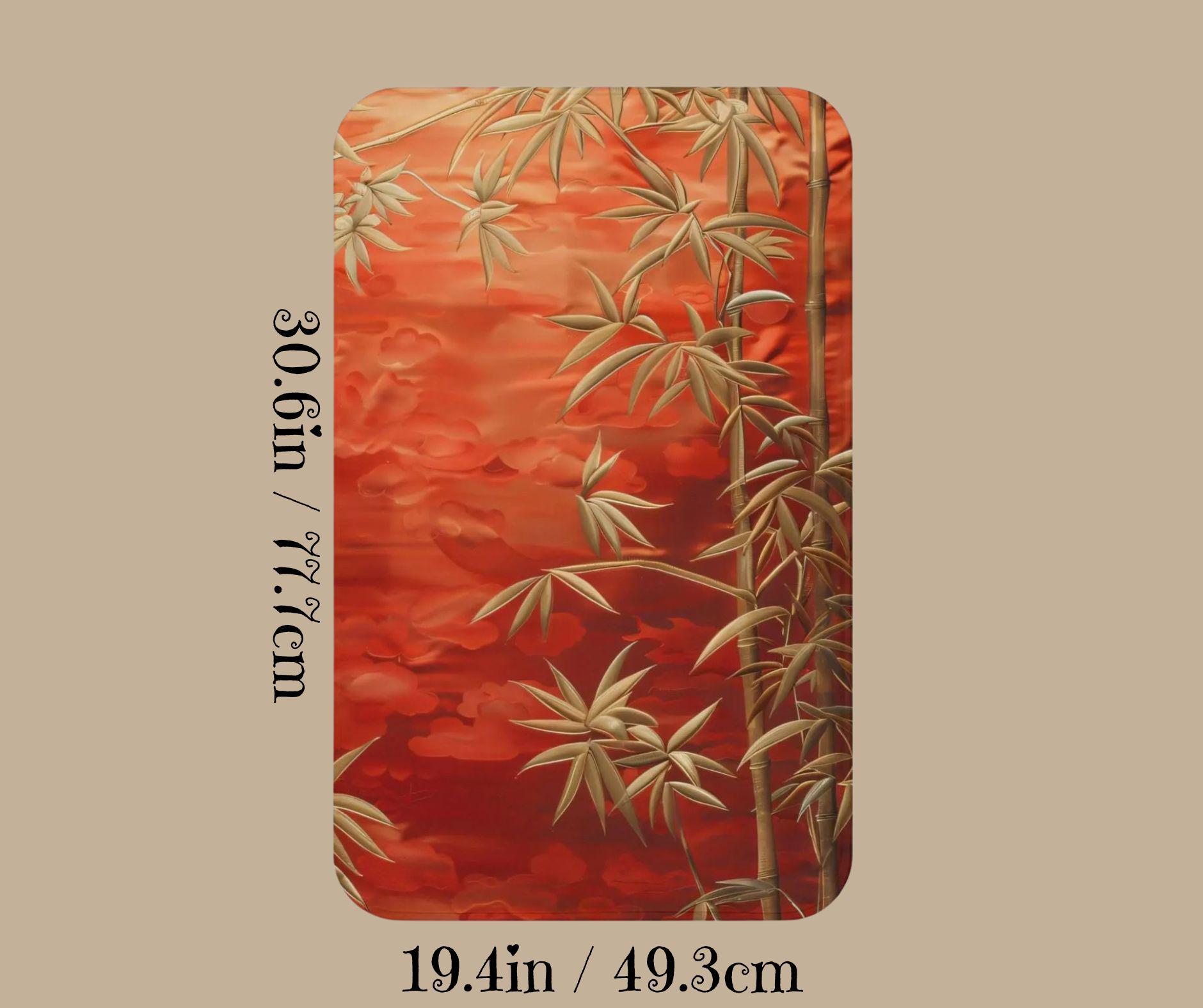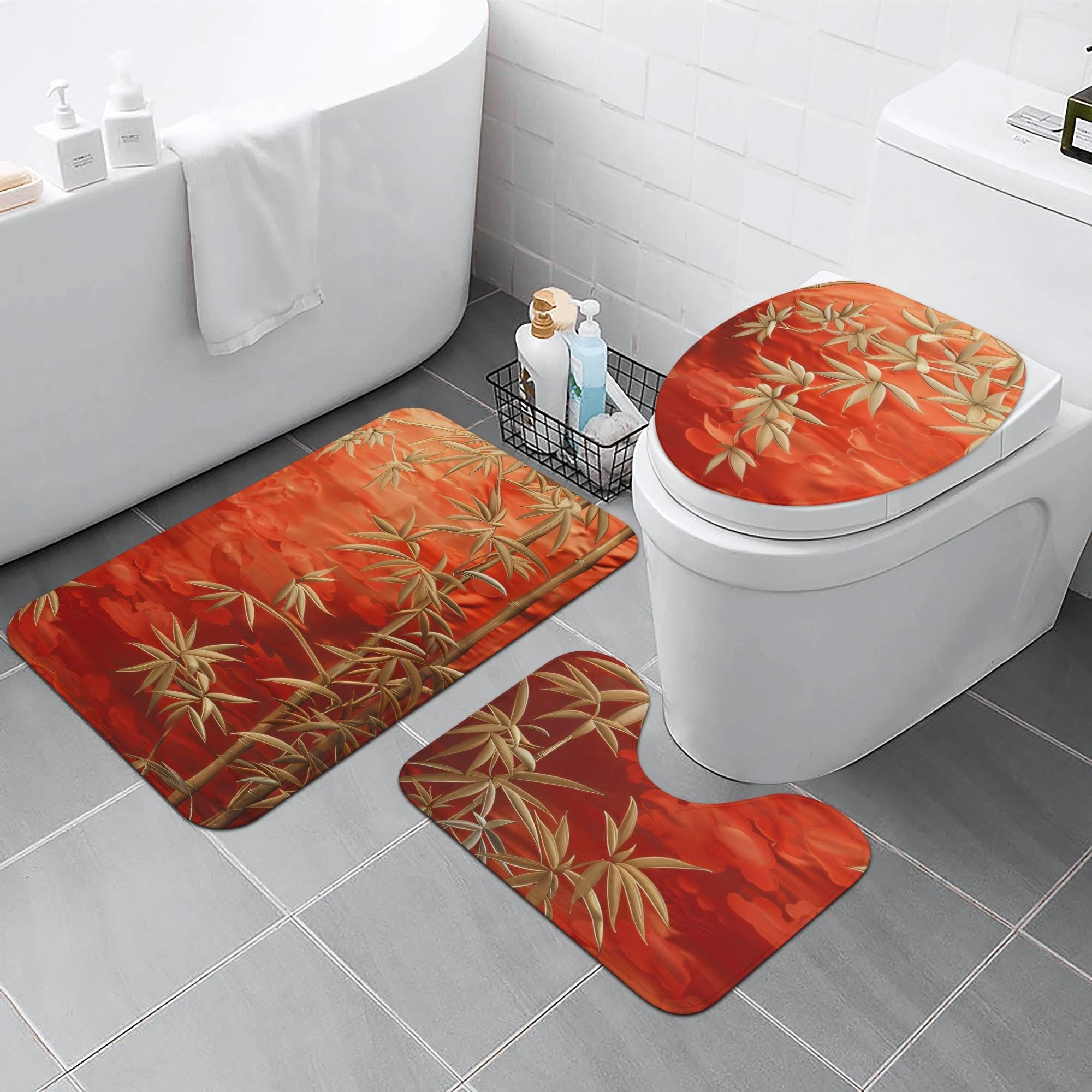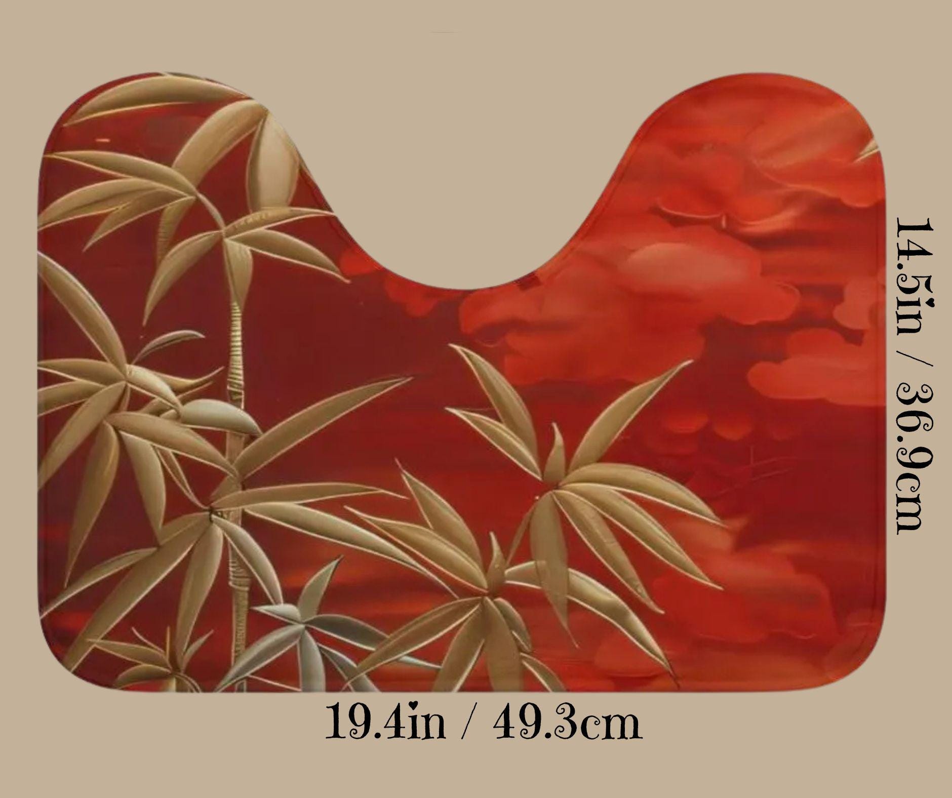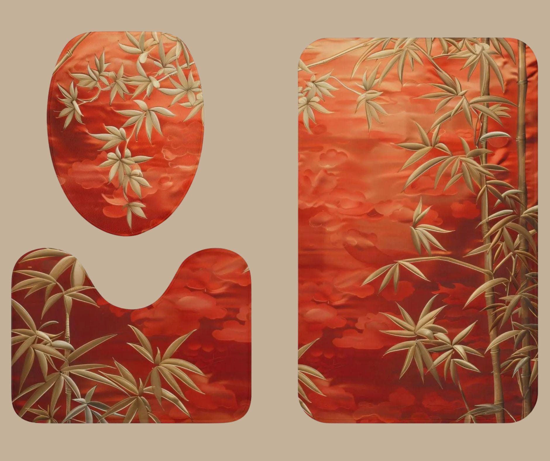 This elegant 3-piece bath rug set features graceful bamboo branches in soft gold tones set against a rich, sunset-red background. Inspired by Asian botanical art, the design blends calm, balance, and natural beauty with a bold, spa-like presence.