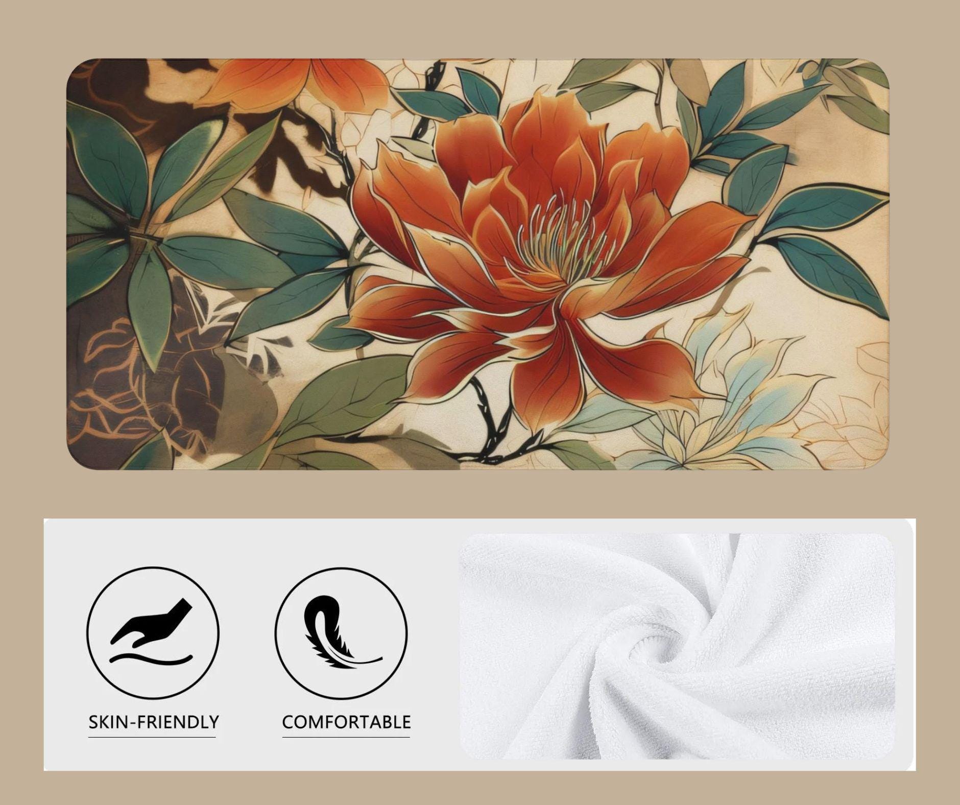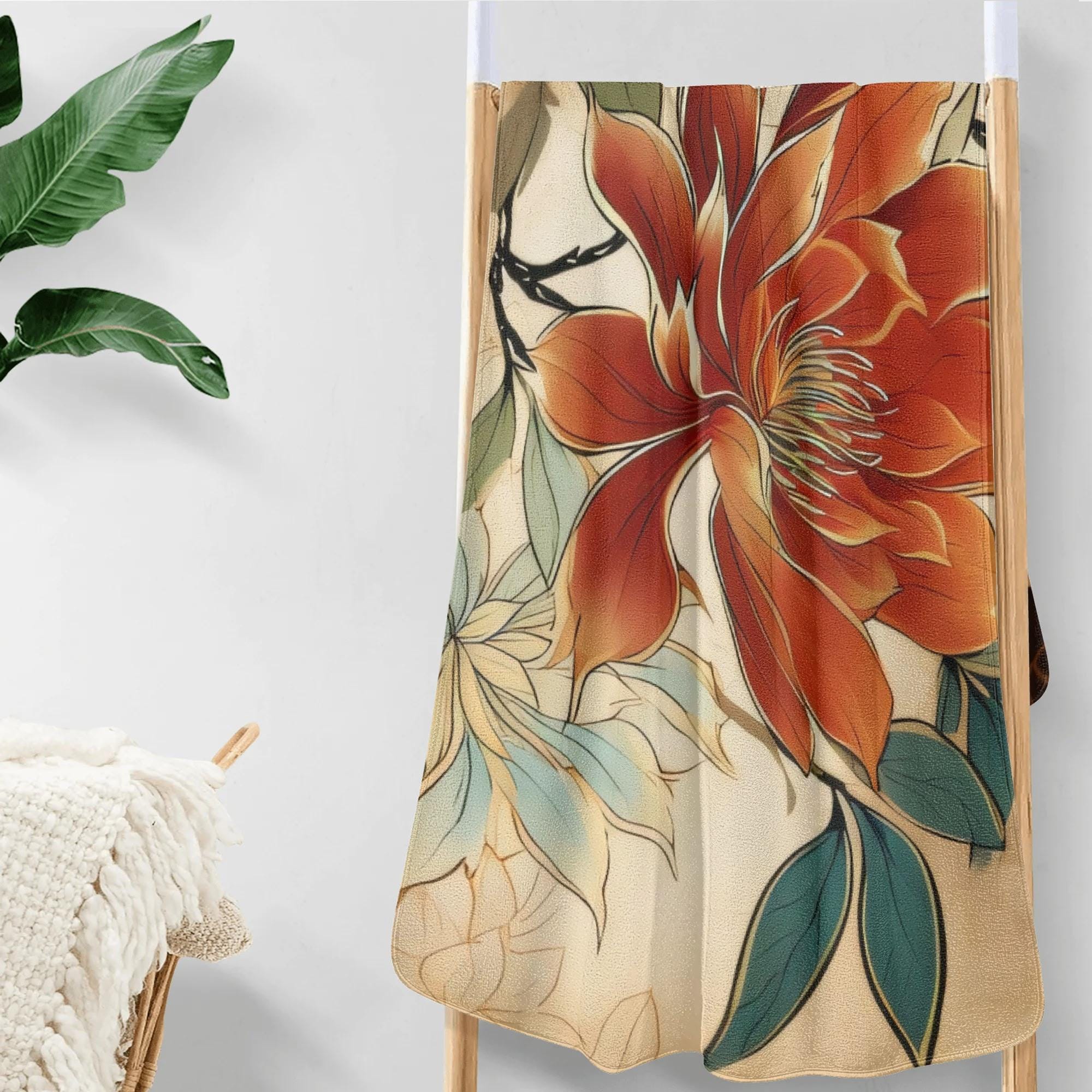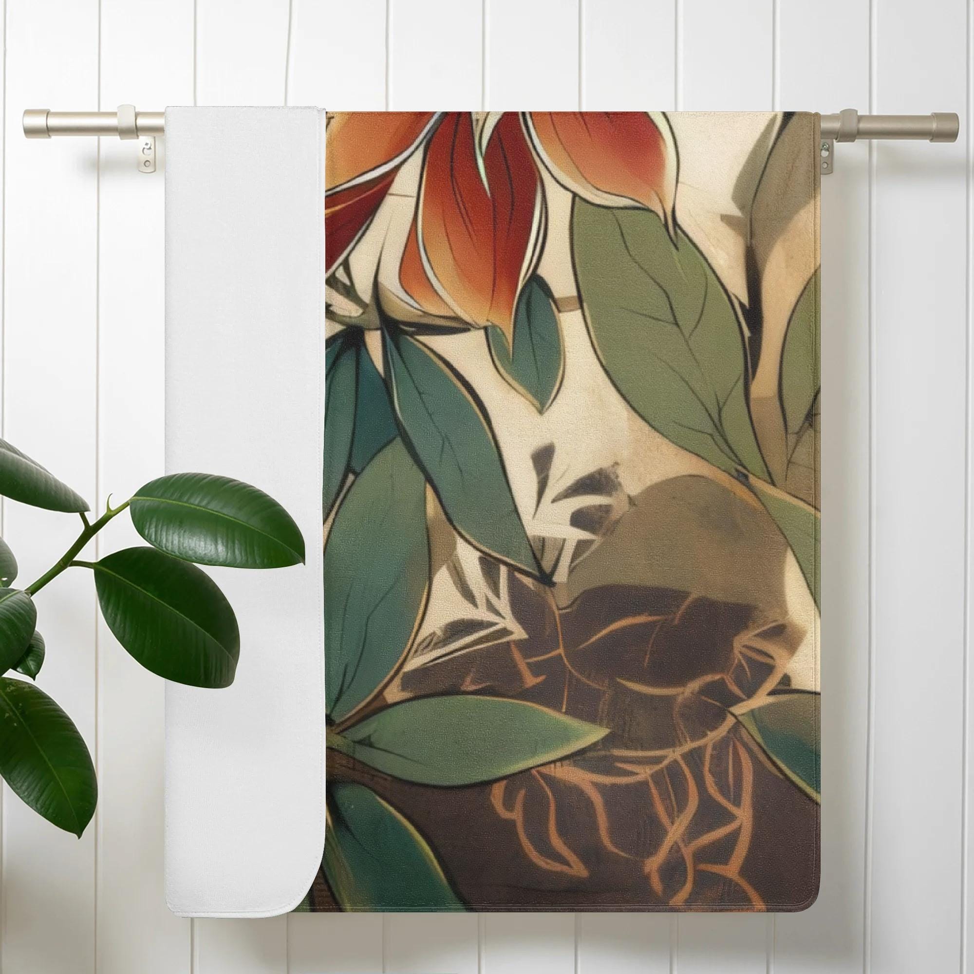 This beautifully designed bath towel features layered botanical leaves in soft olive green, sage, warm tan, and muted terracotta tones. The artwork has a refined, painterly quality that feels both modern and organic—bringing spa-level serenity and natural warmth into your bathroom.