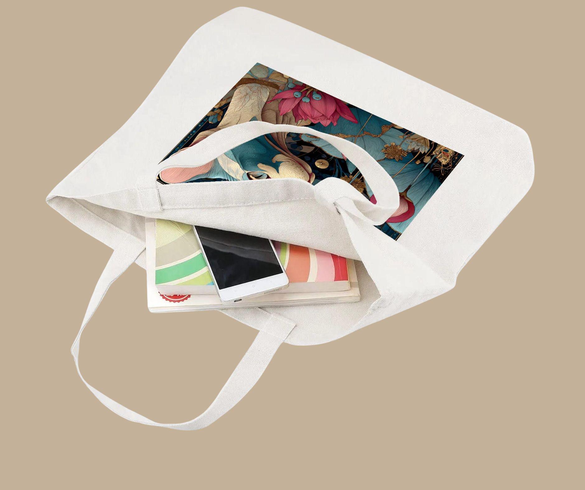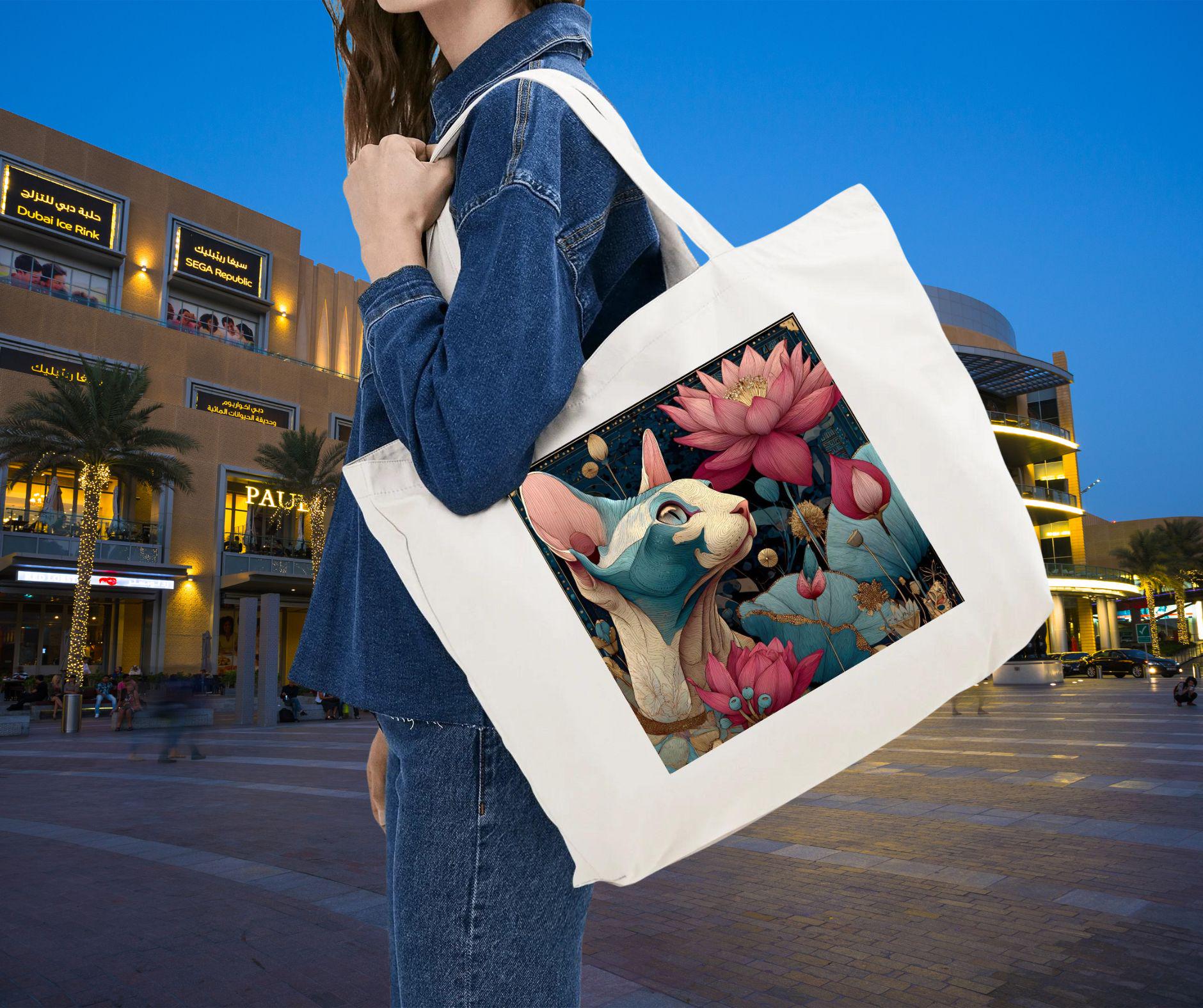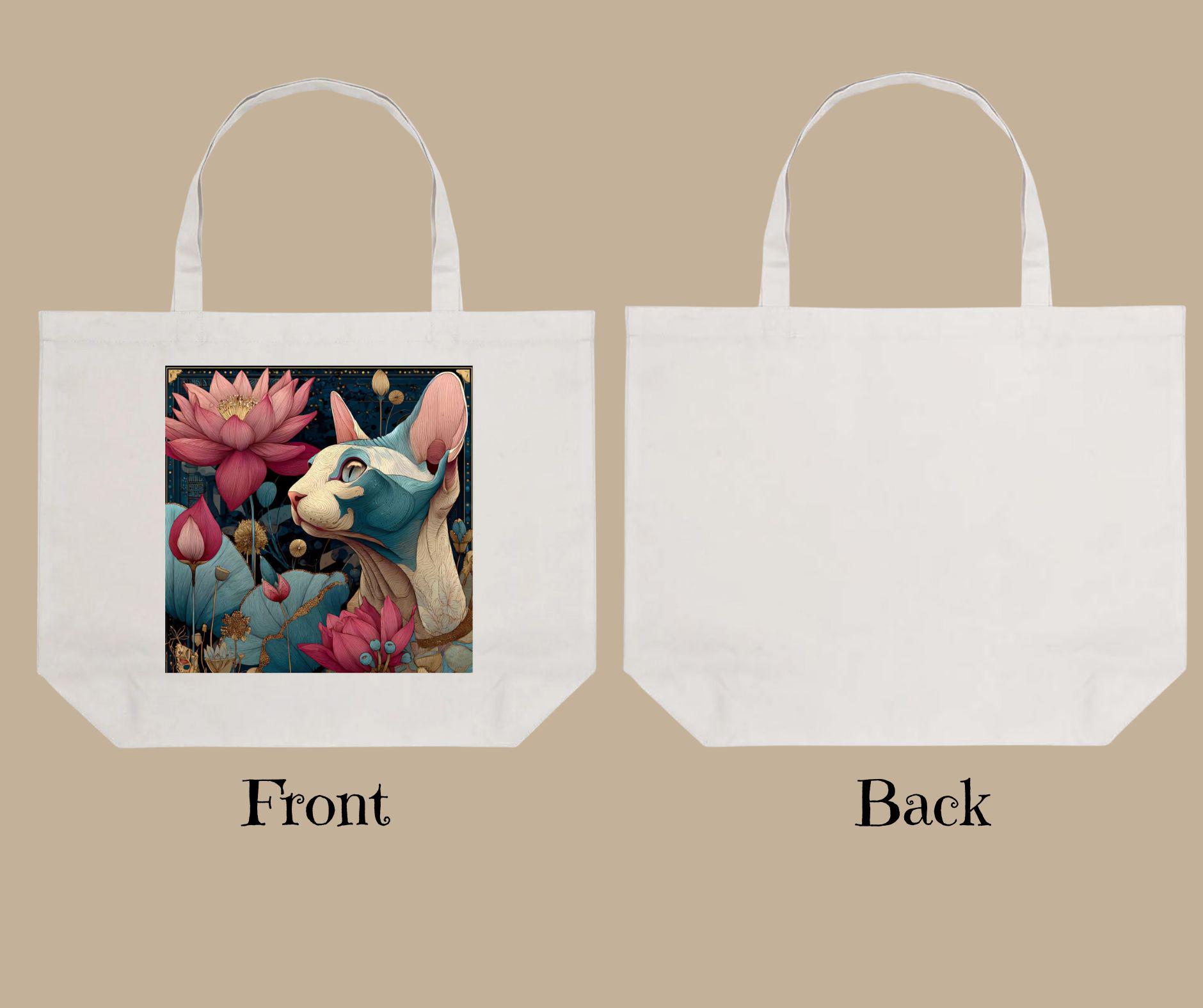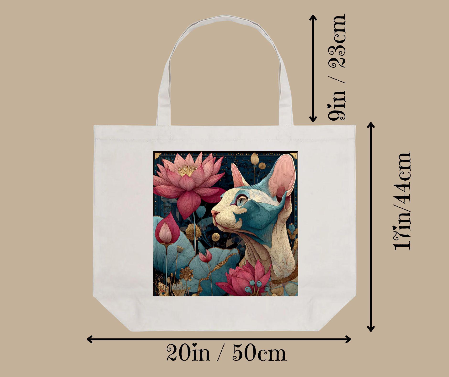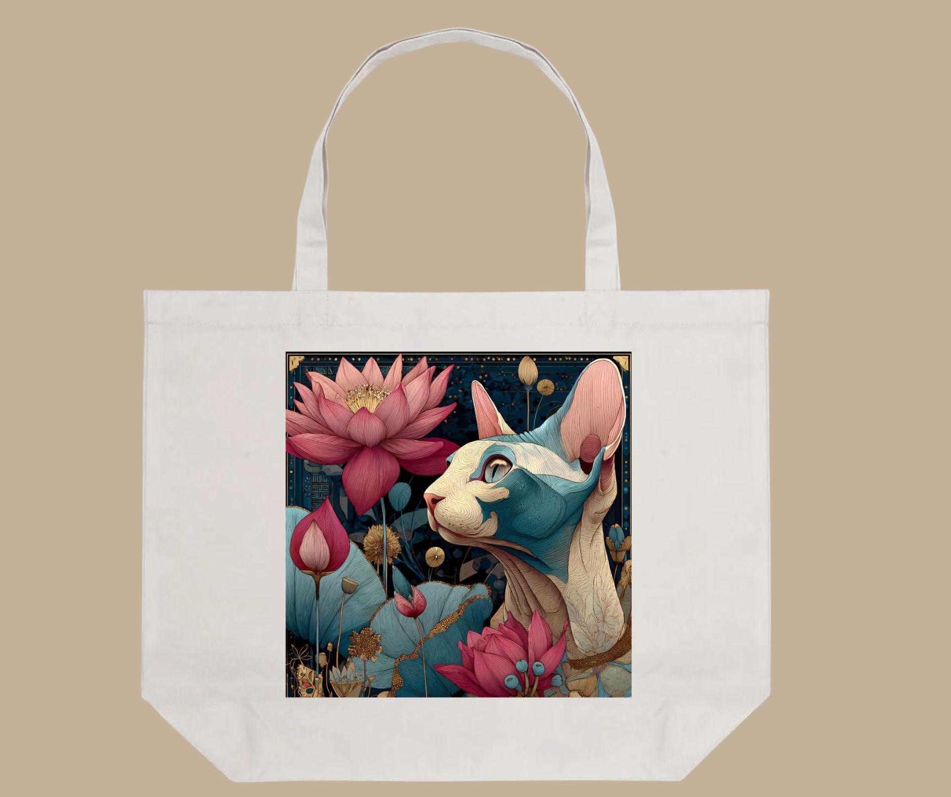 This tote bag features a beautifully illustrated sphynx cat surrounded by blooming lotus flowers, symbolizing resilience, beauty, and inner calm. The rich yet balanced color palette and painterly detail give this piece a timeless, almost spiritual feel—perfect for cat lovers who appreciate art with meaning.