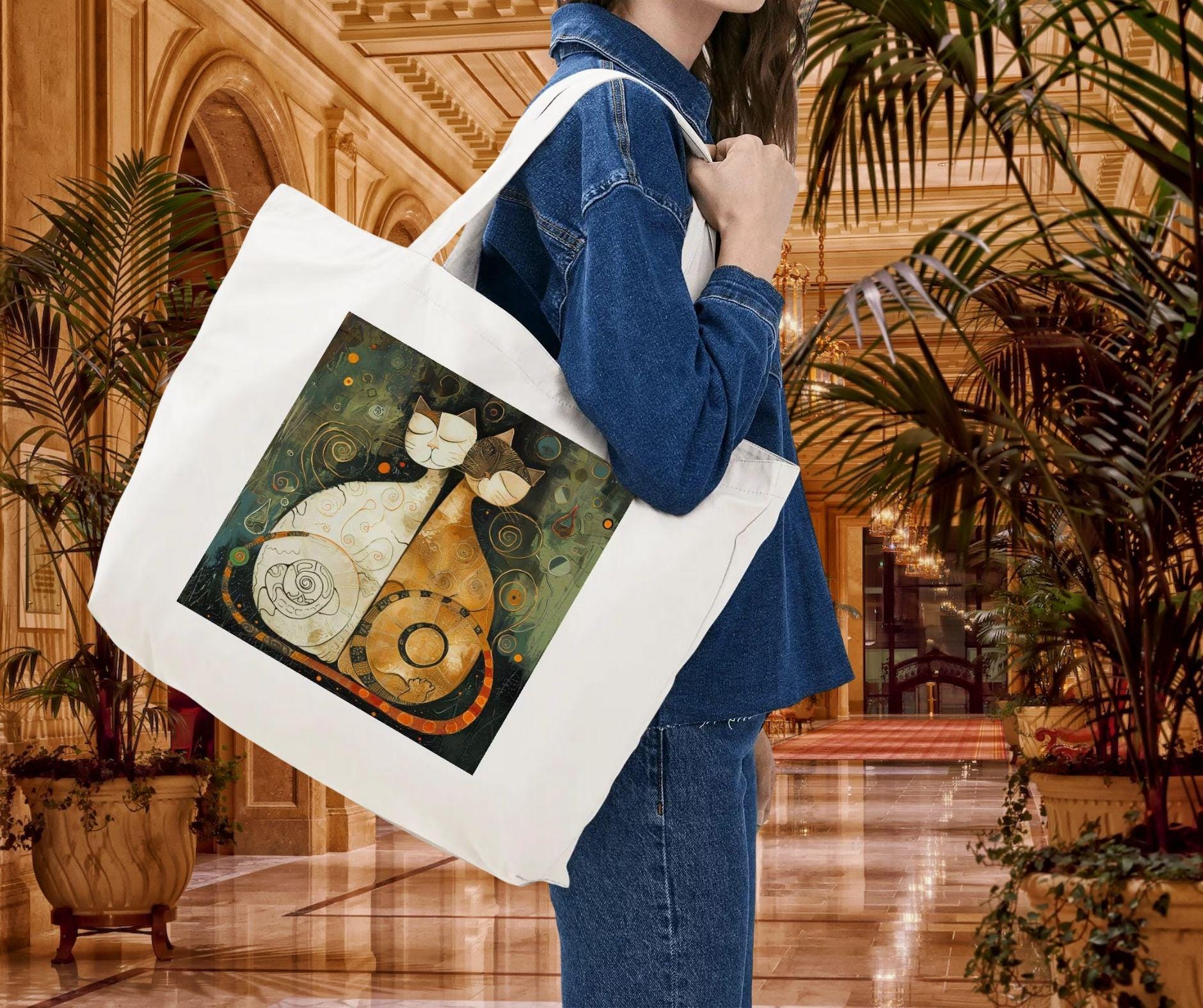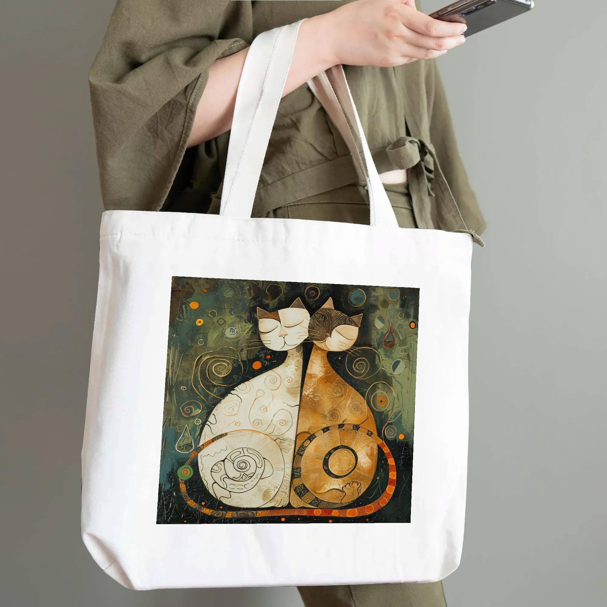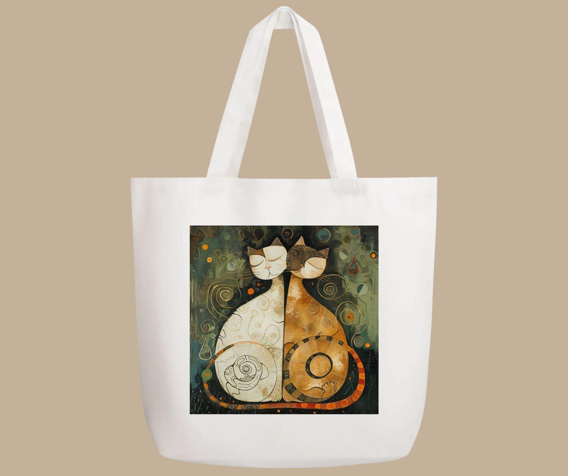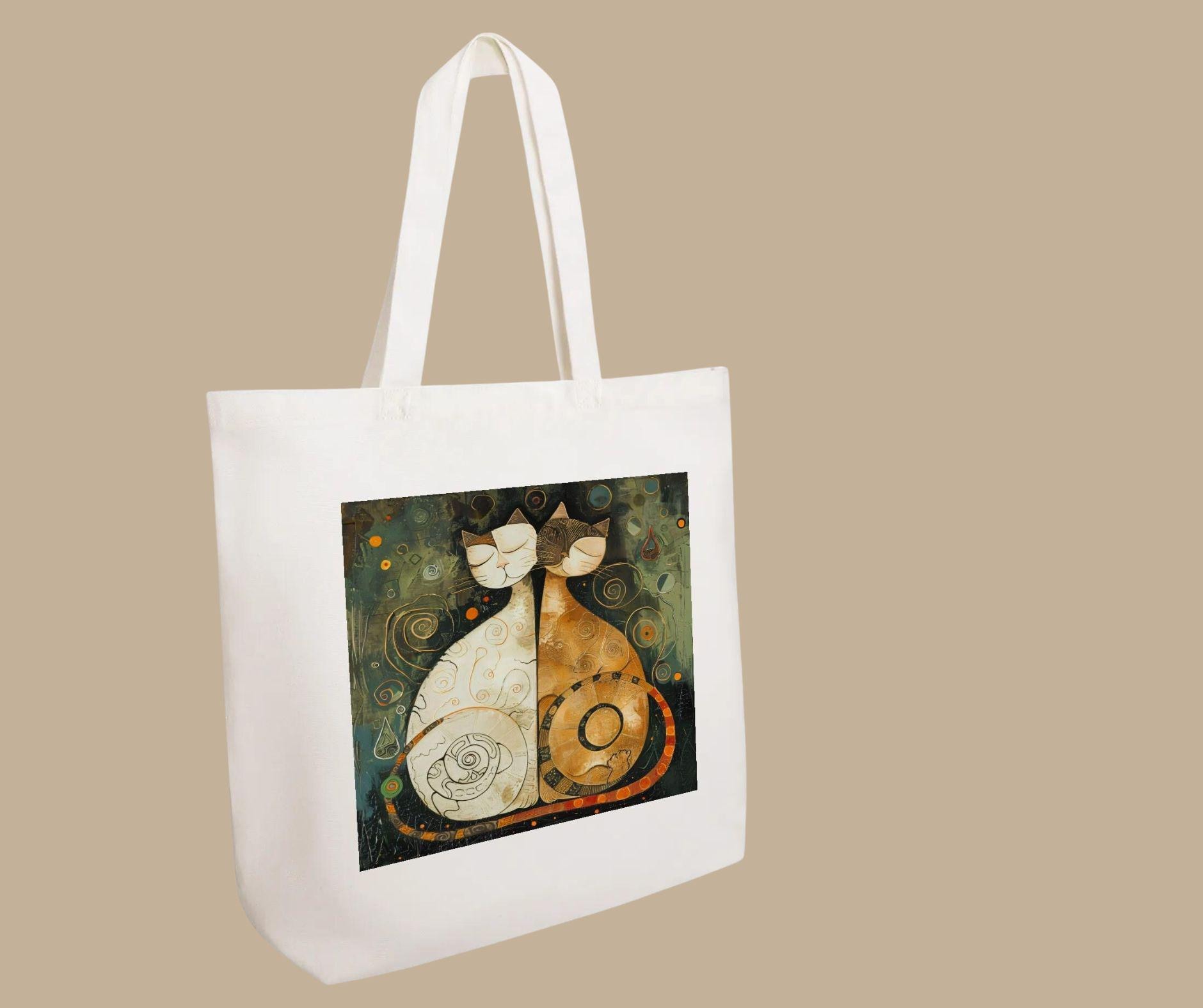 This artistic tote features two stylized cats sitting side by side, eyes gently closed, wrapped in swirling patterns and warm, earthy tones. The artwork evokes balance, companionship, and quiet understanding—making this tote as meaningful as it is beautiful.
