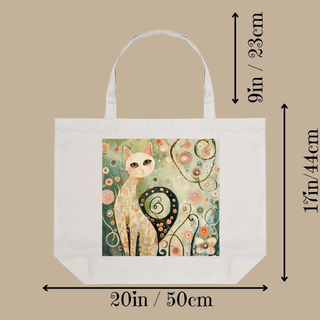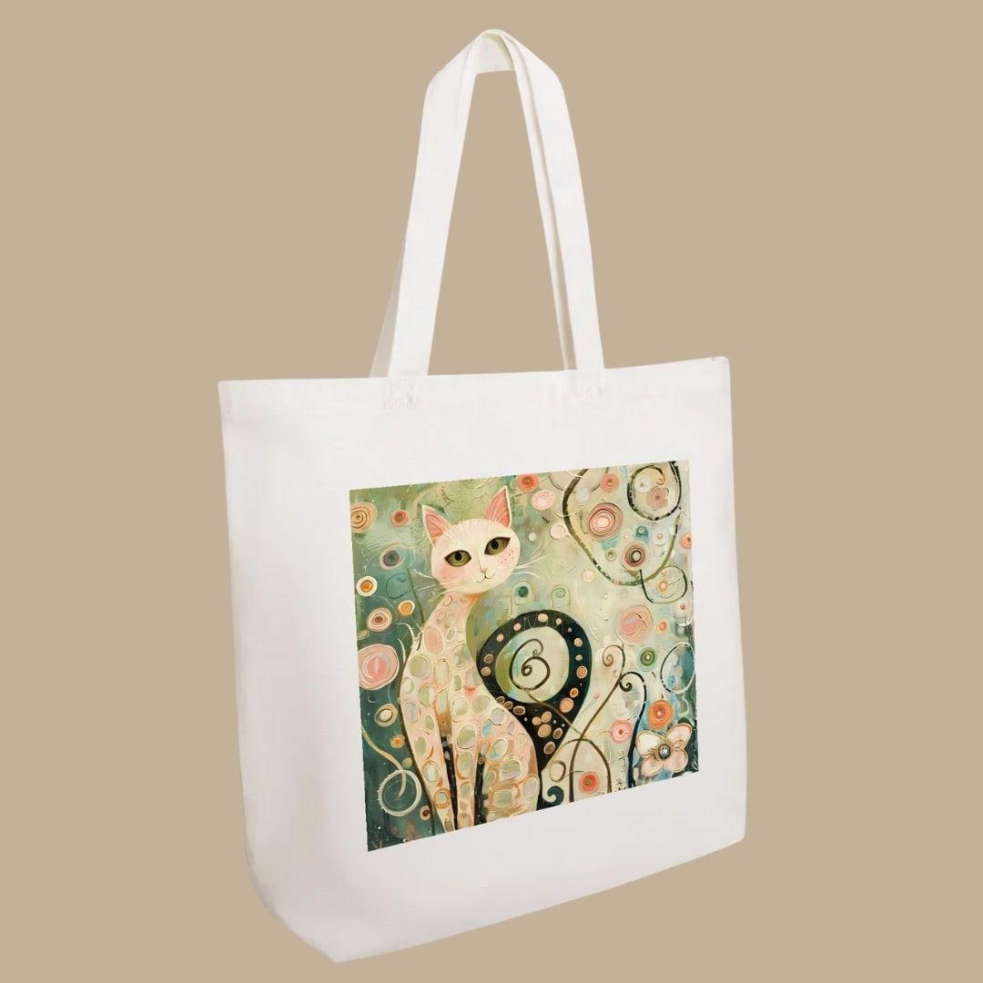 White Cat Art Tote Bag: Whimsical Boho Reusable Canvas