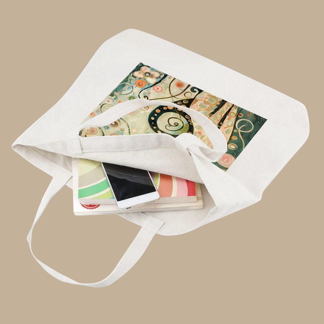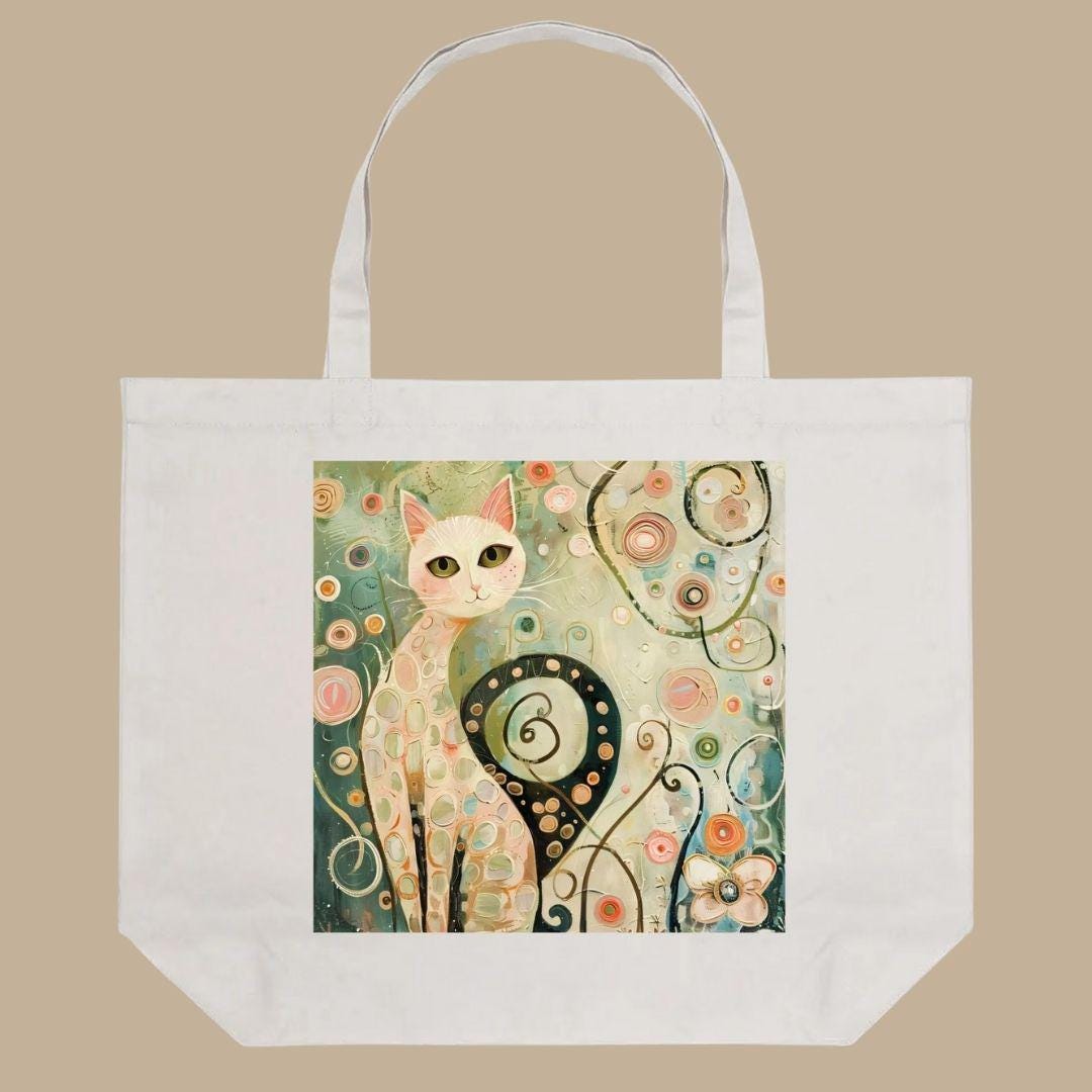 The dreamy illustration features a delicate white cat surrounded by swirling botanical motifs, gentle textures, and whimsical details that feel part storybook, part modern folk art. The palette is soothing and elevated, making this tote just as perfect for everyday errands as it is for art lovers who adore subtle statement pieces.
