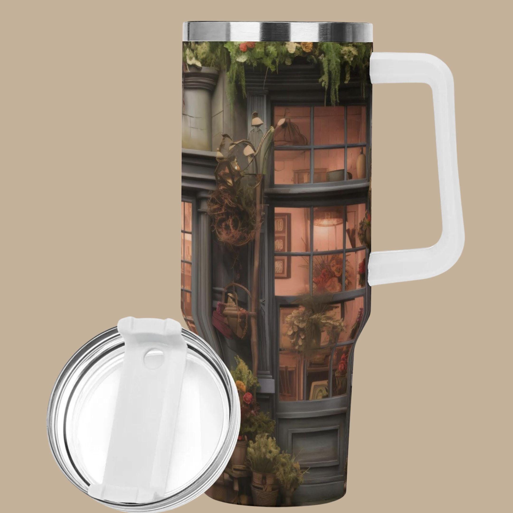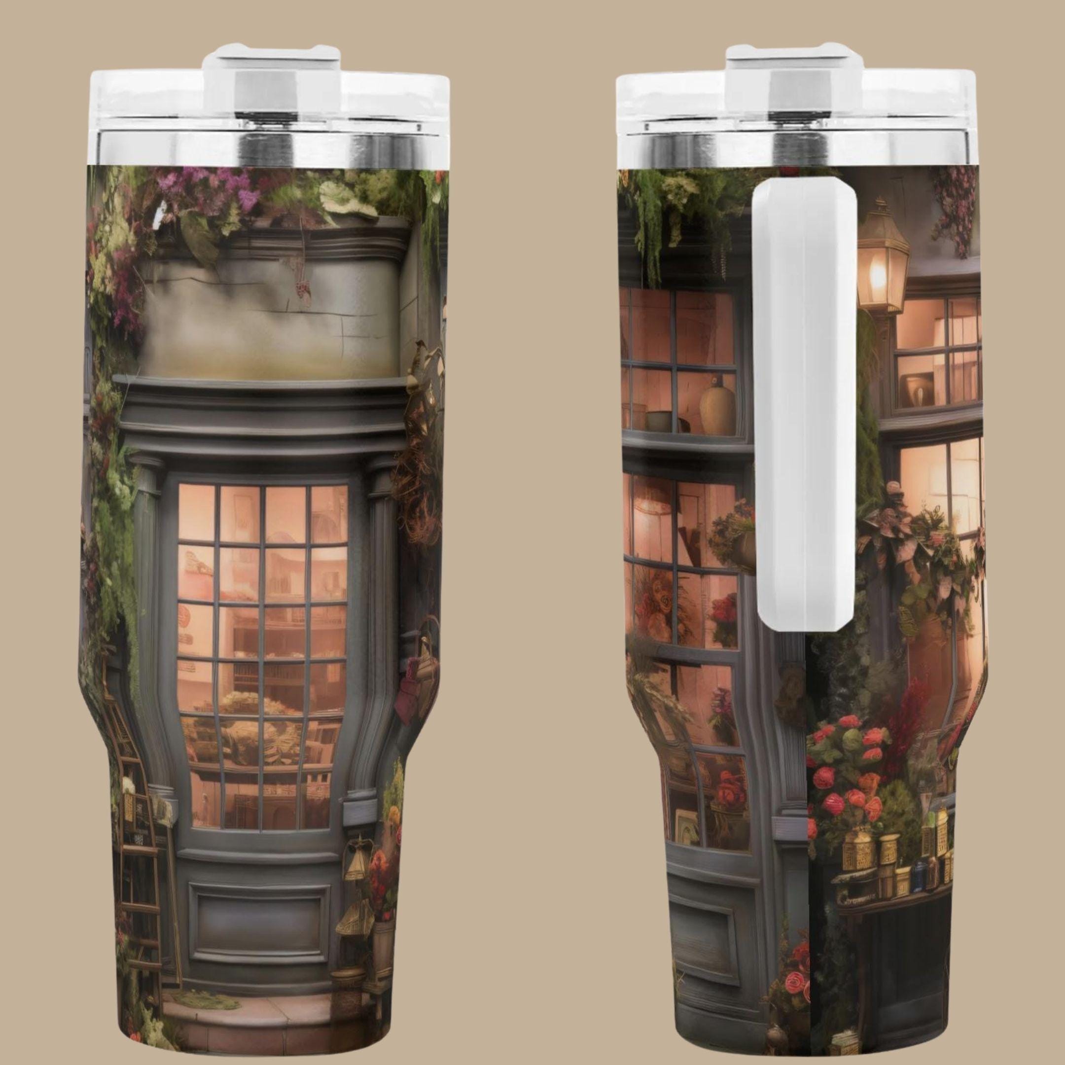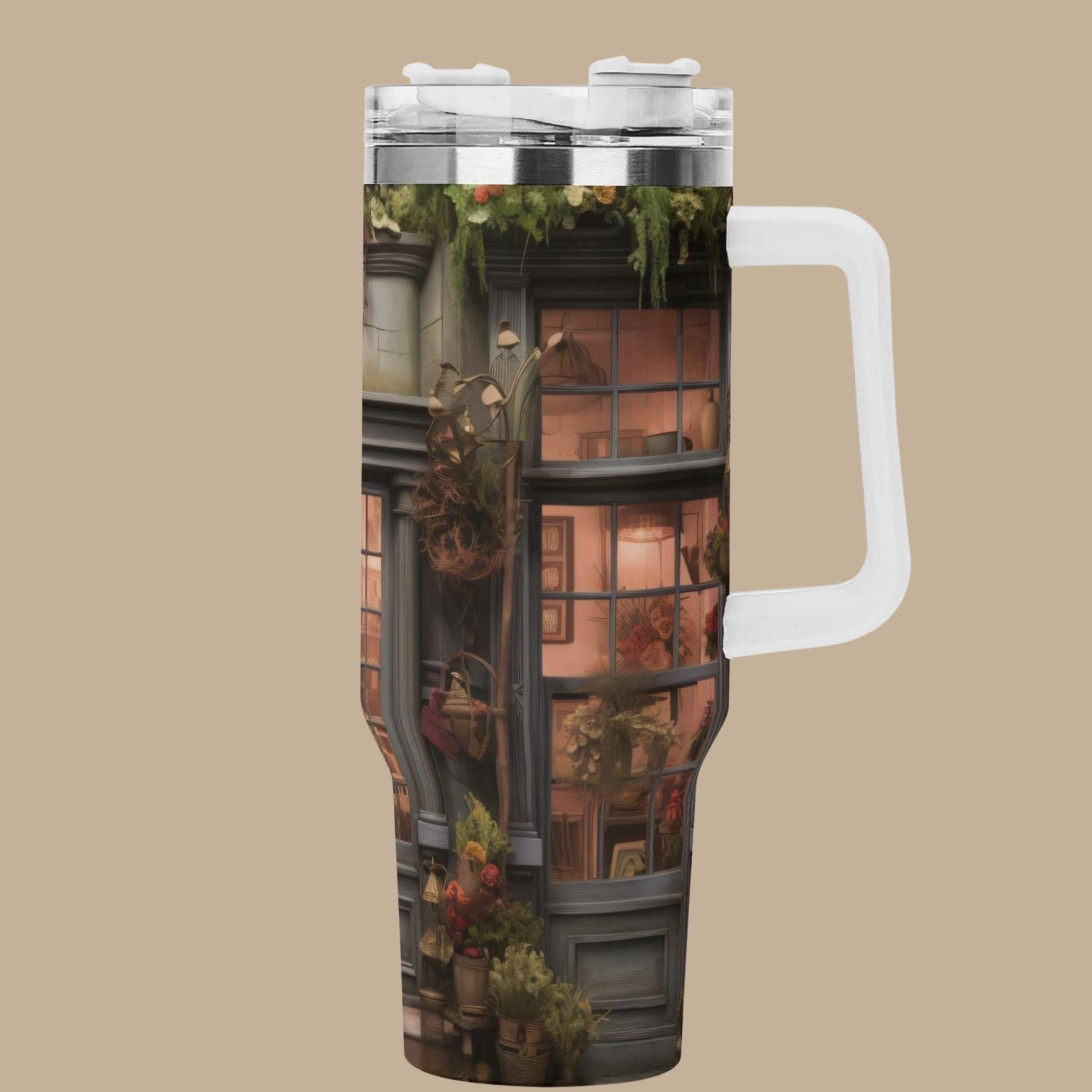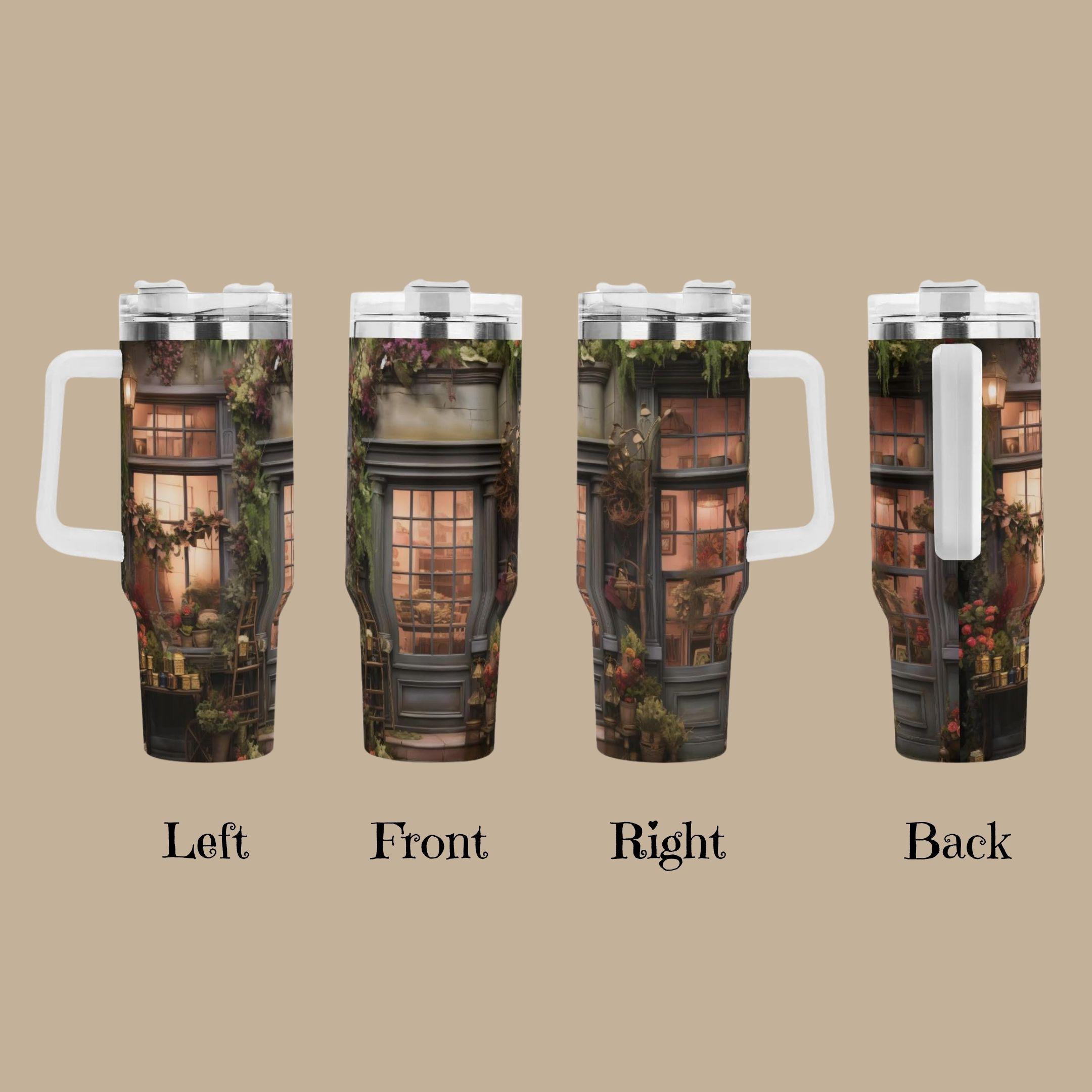 Step into a quiet corner of a storybook street every time you take a sip. This whimsical tumbler features a dreamy café façade glowing with warm light, climbing florals, and cozy details that feel straight out of a fairytale bookshop.