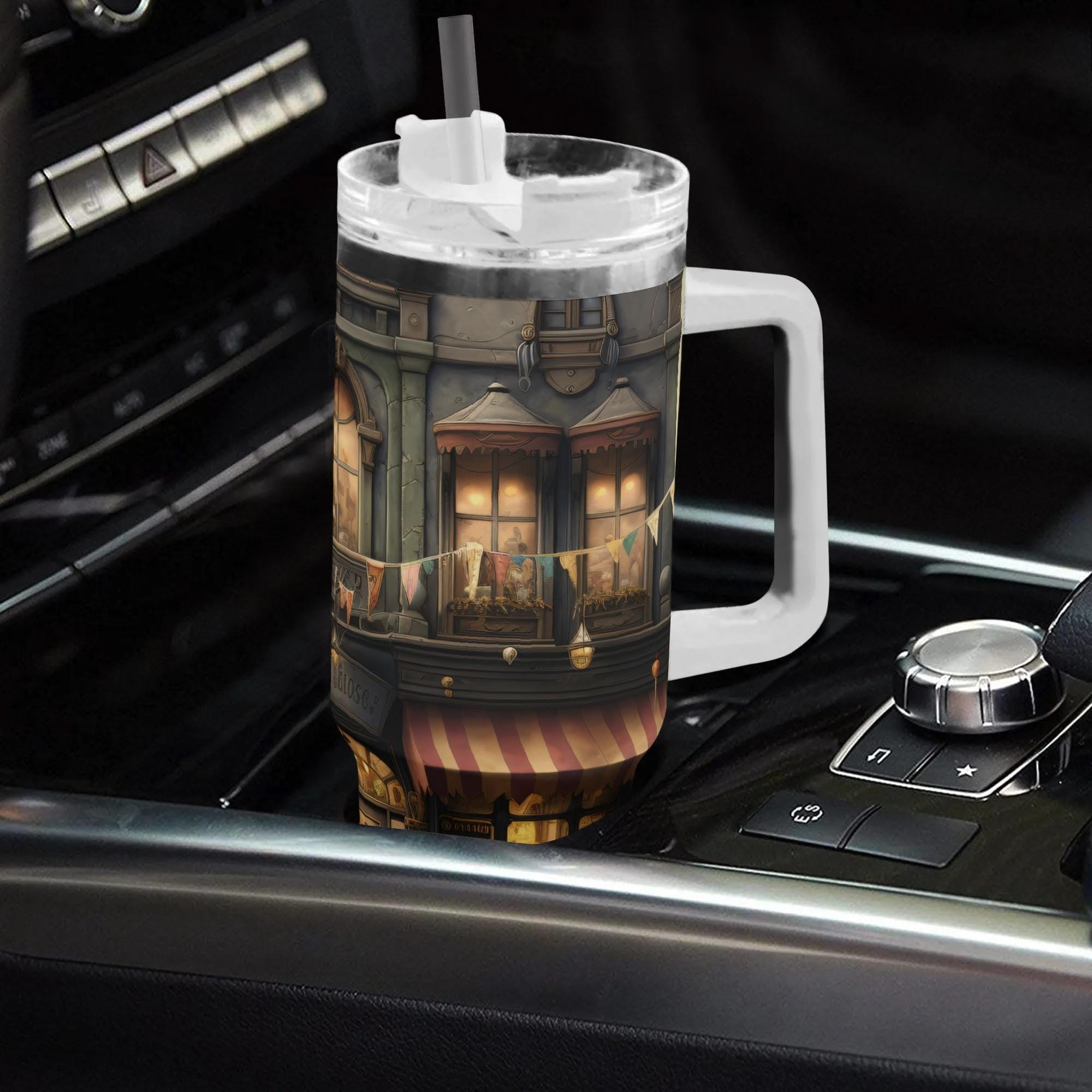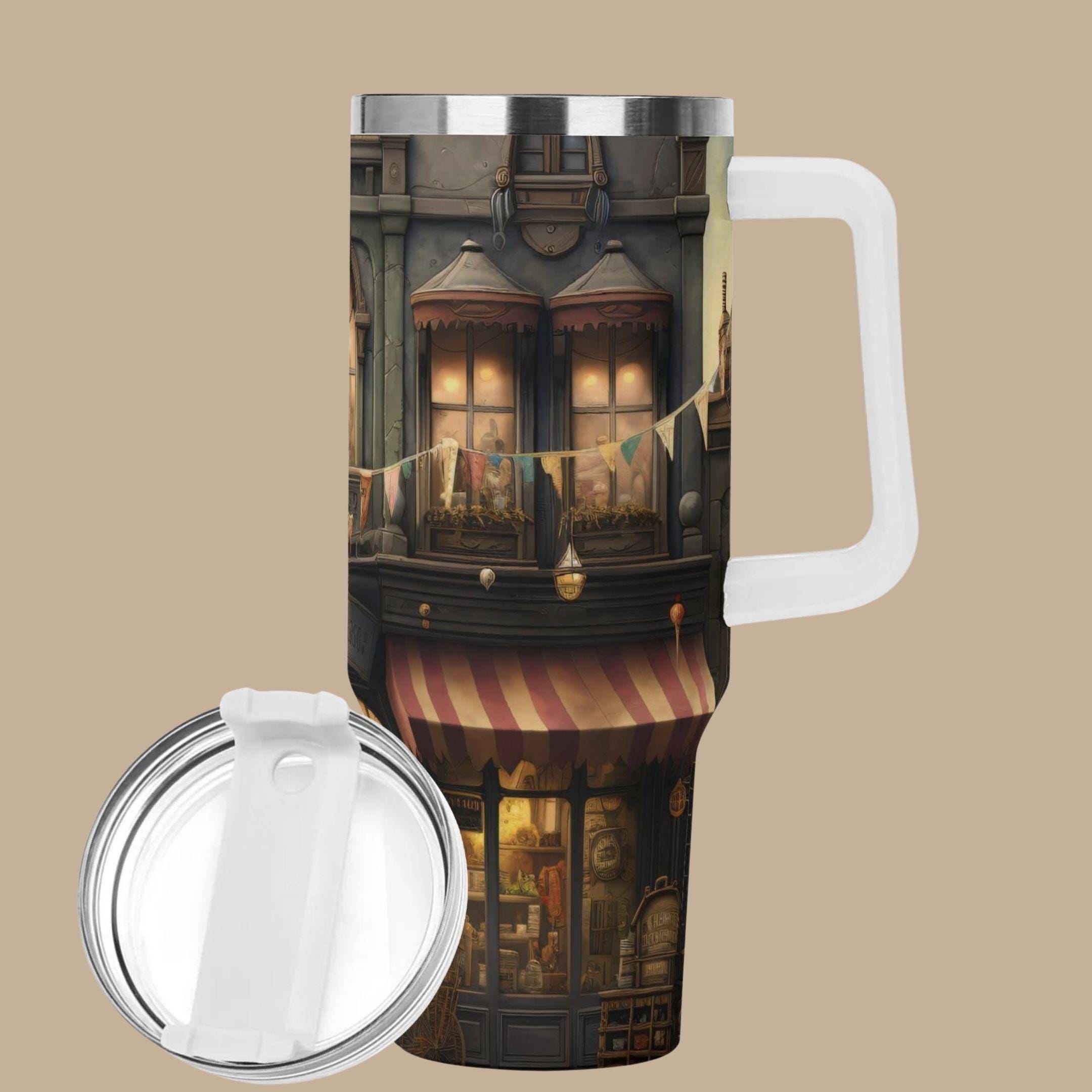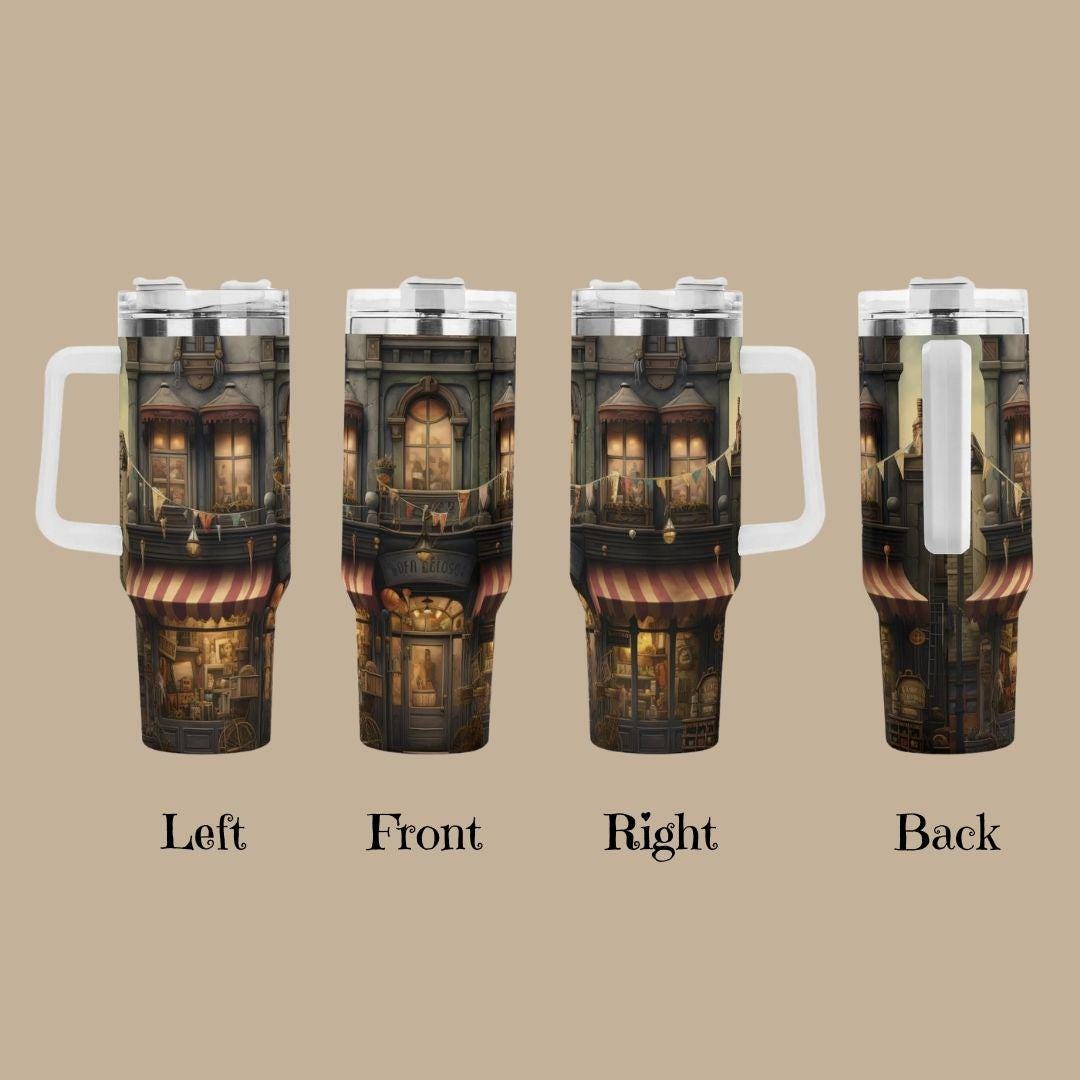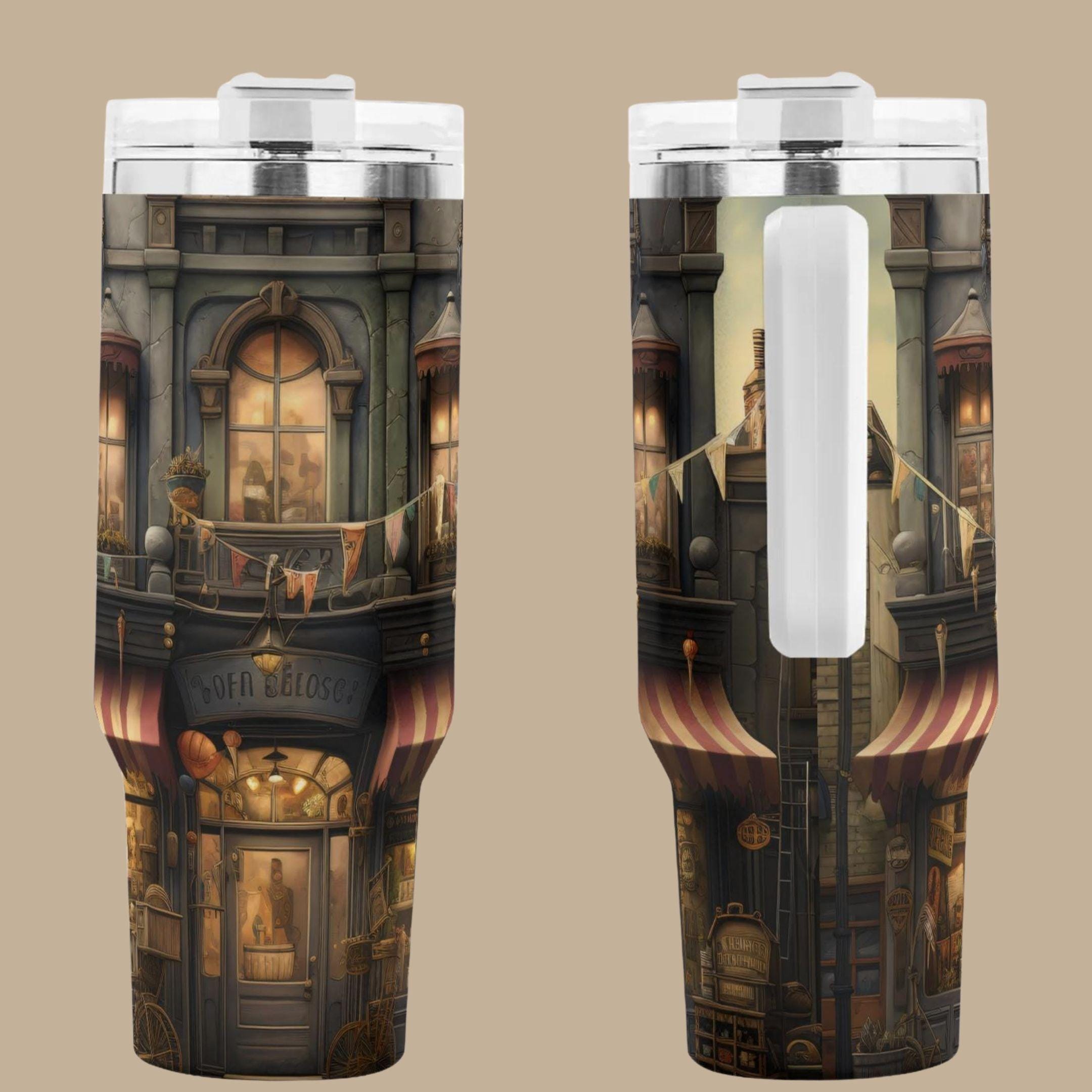 Step into a storybook street where warm lights glow, windows whisper secrets, and time slows just enough for one more sip. ☕📚 This 40oz insulated travel tumbler features a richly detailed, old-world bookshop scene that wraps around the cup—perfect for cozy mornings, long errands, and imaginative souls who carry a little magic everywhere they go.