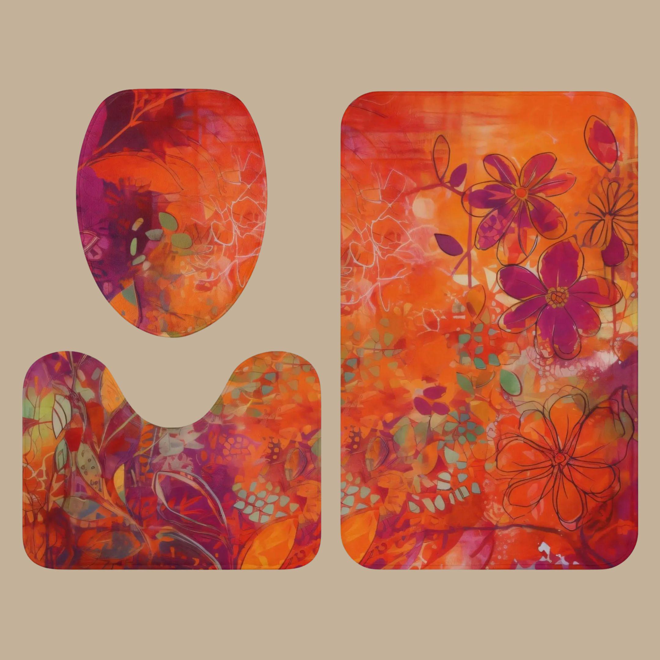 Transform your bathroom into a vibrant, gallery-worthy space with this bold abstract floral 3-piece bathroom rug set. Featuring rich oranges, deep magentas, and layered botanical textures, this set brings warmth, personality, and modern artistry into your daily routine.