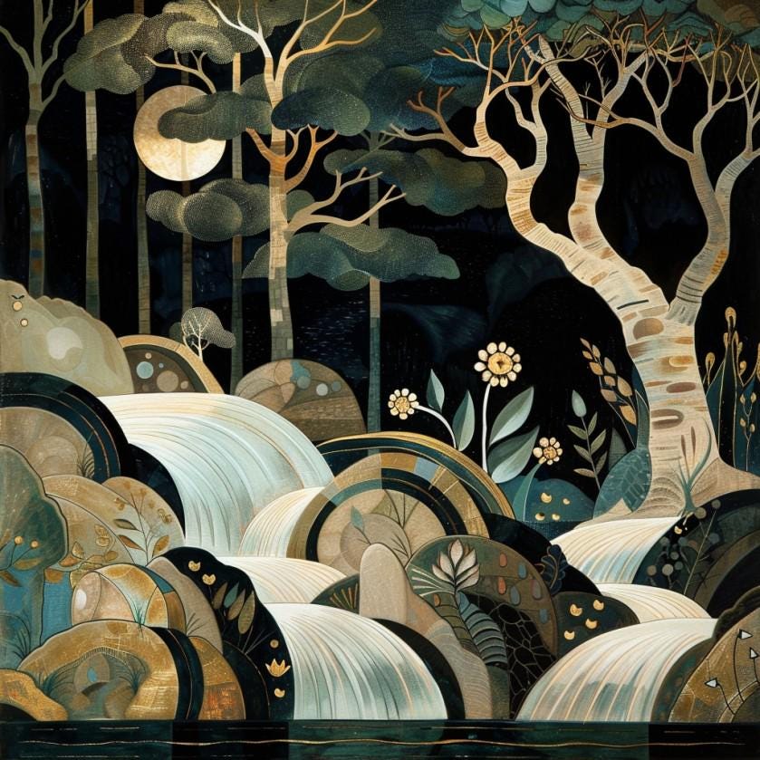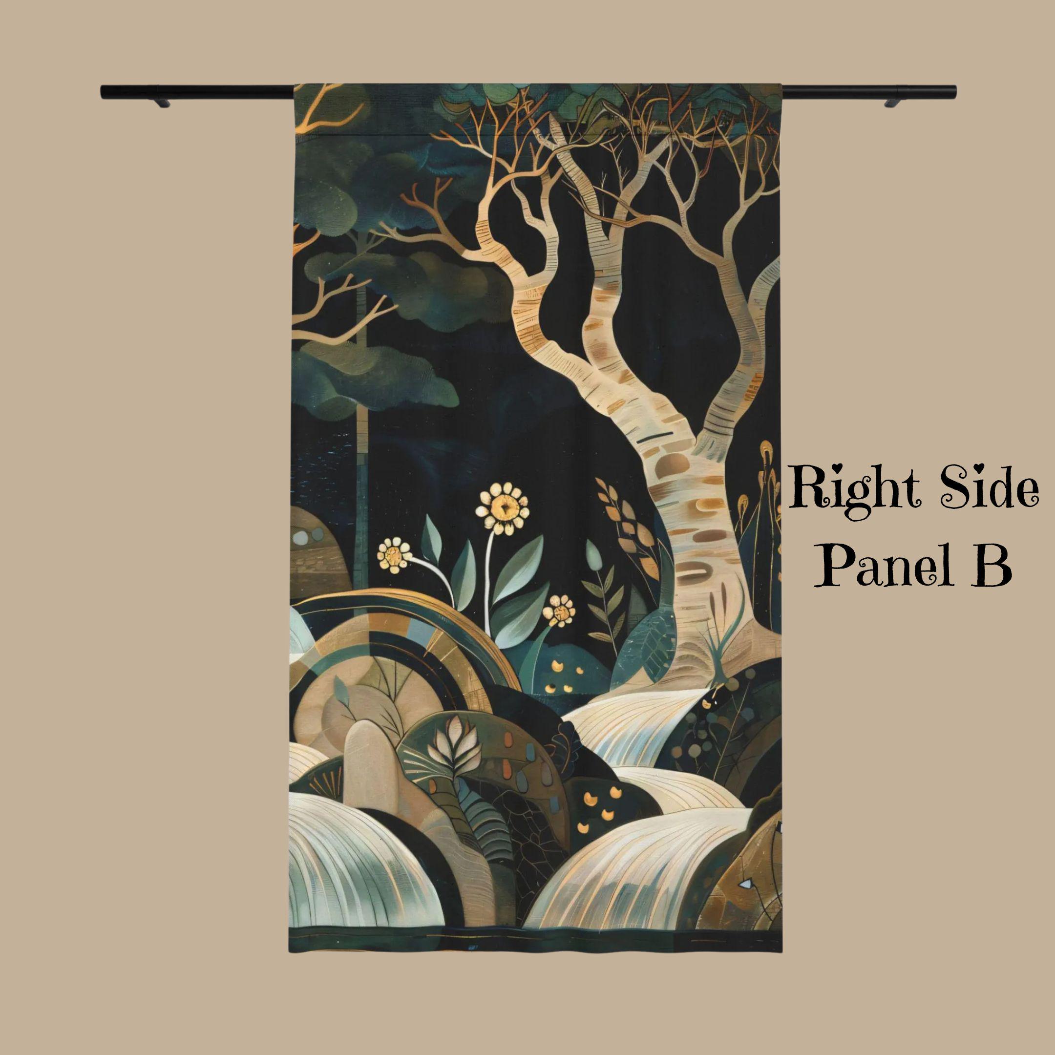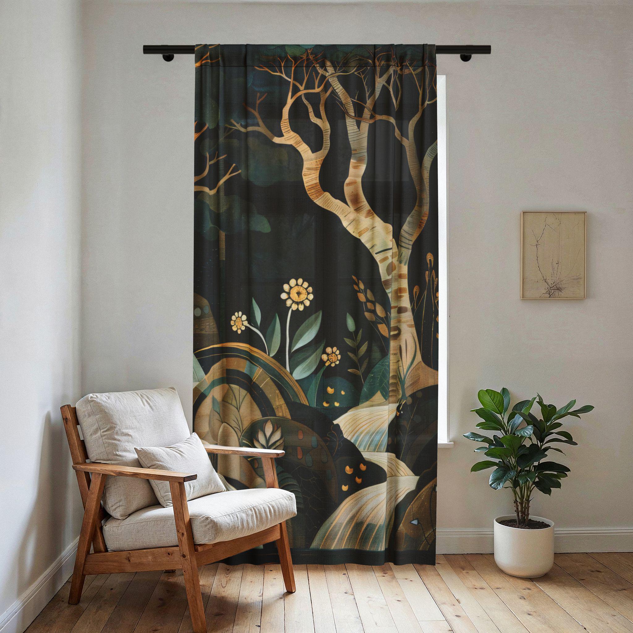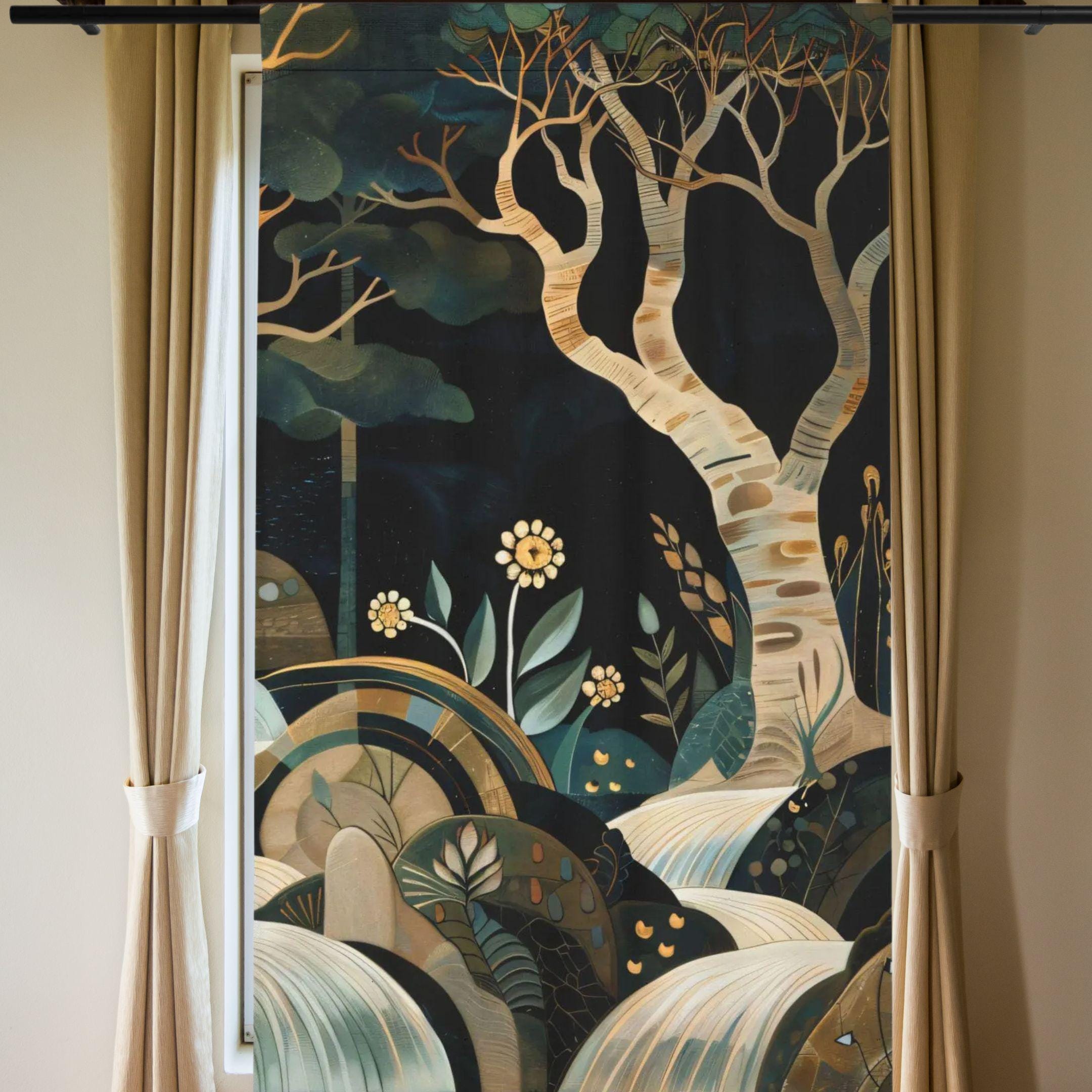 A soft, dreamlike window panel that brings a quiet woodland into your room. Murky greens, warm ochres and gentle ivory waves form a stylized forest scene that filters daylight into a warm, moody glow. Hang it where you read, sip tea, or want a moment of calm — the lightweight weave moves slightly with a breeze, adding subtle motion and a hand-painted feel. The single-sided print keeps the artwork vivid on the room-facing side while keeping the reverse neutral. It’s for people who favor layered, nature-inspired interiors and little scenes that feel like a memory of evening walk under birch trees. This is Panel B of this set.