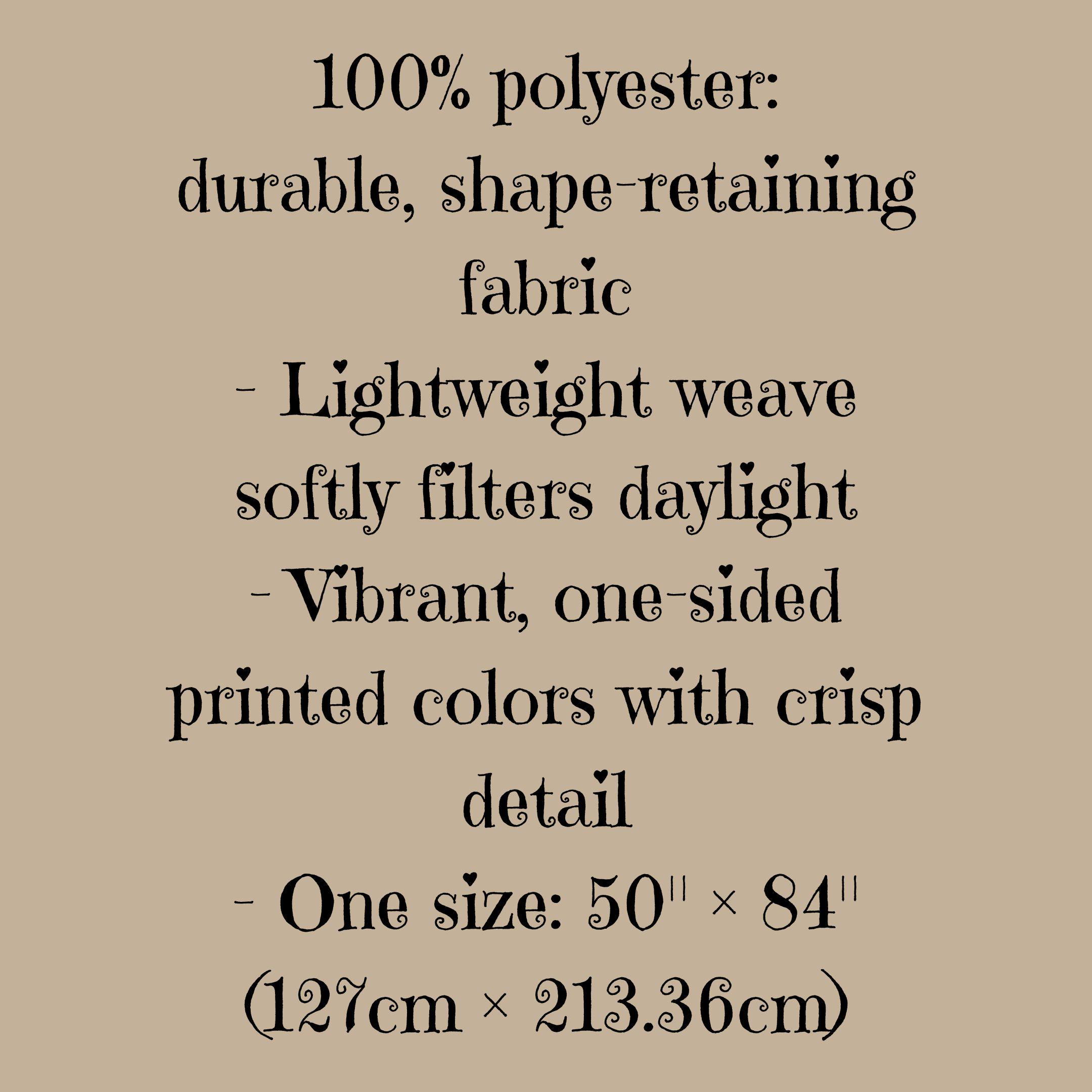 Product features - 100% polyester: durable, shape-retaining fabric - Lightweight weave softly filters daylight - Vibrant, one-sided printed colors with crisp detail - One size: 50" × 84" (127cm × 213.36cm) - Blank product sourced from China; adult use