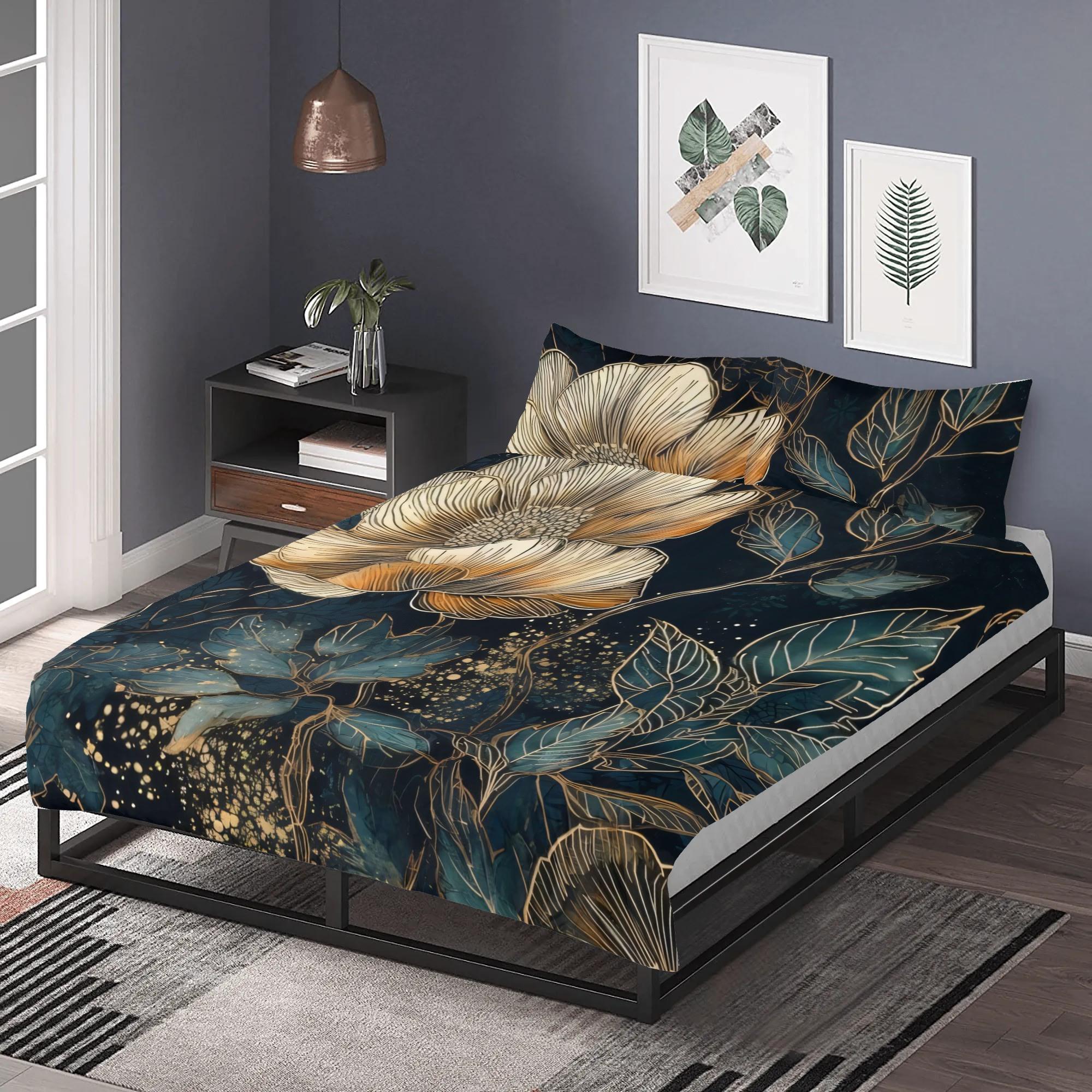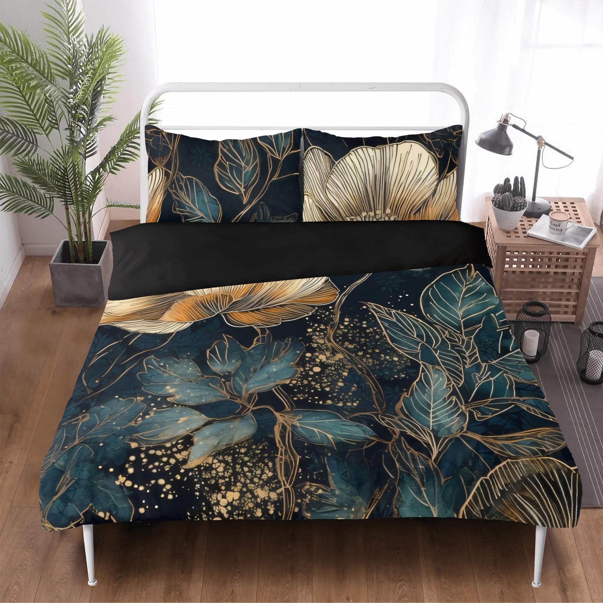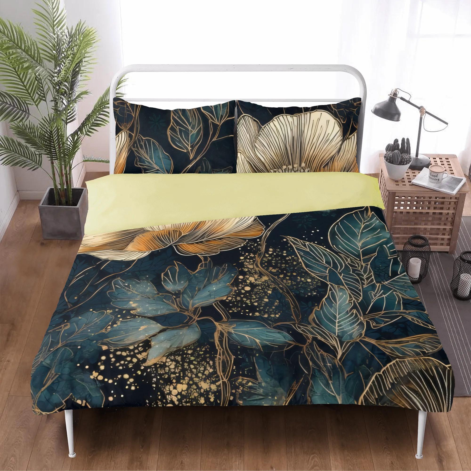 Turn your bedroom into a sanctuary of elegance with this breathtaking floral duvet cover. A luminous ivory bloom unfolds across a deep teal background, surrounded by delicately illustrated leaves and flowing botanical lines in warm gold tones. Subtle splashes of gold add depth and movement, creating a rich, painterly effect that feels both modern and timeless.