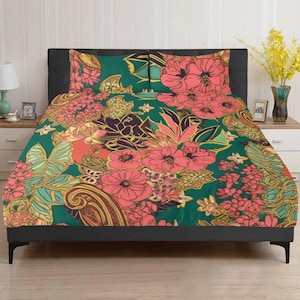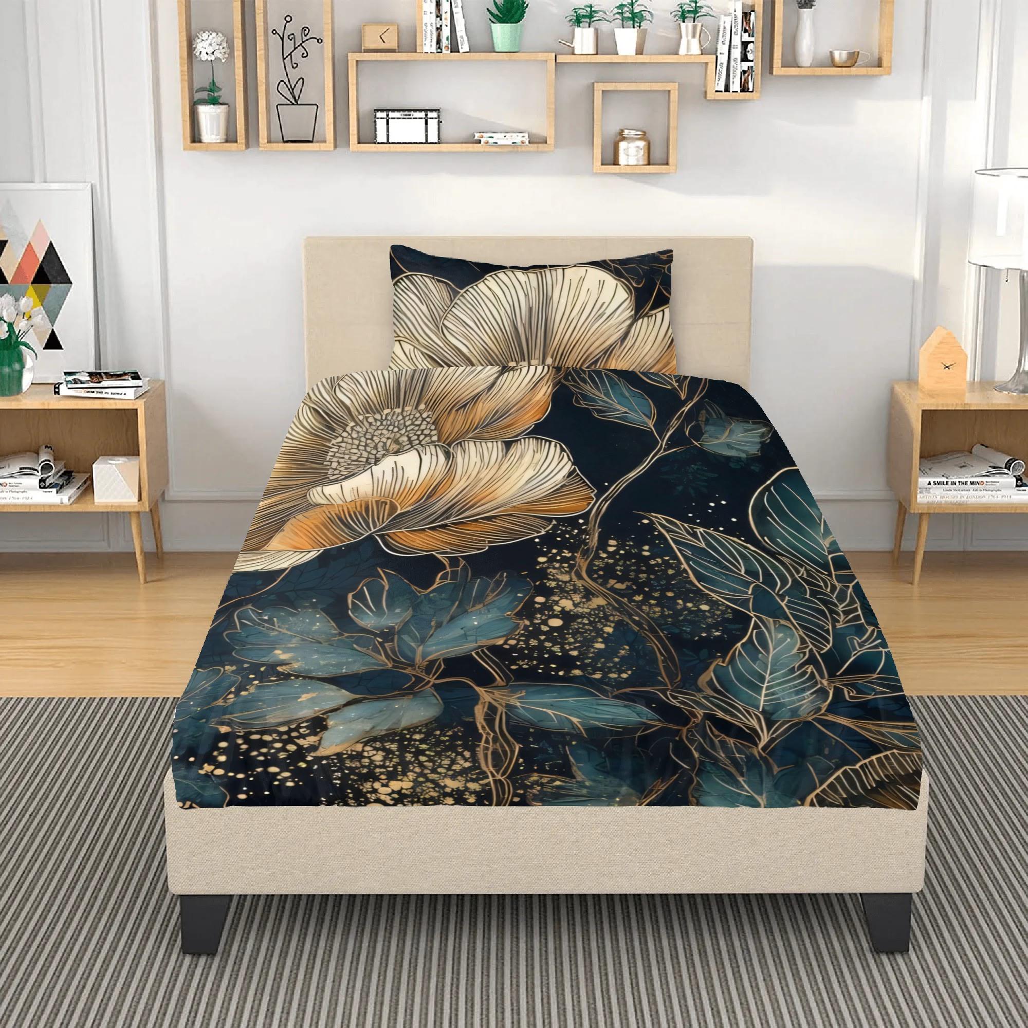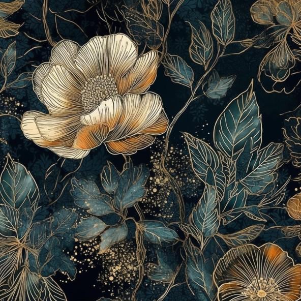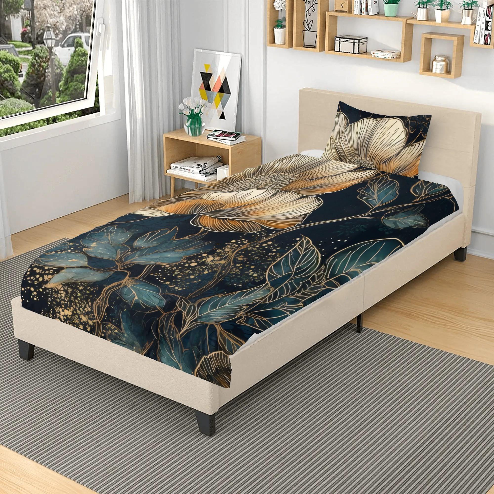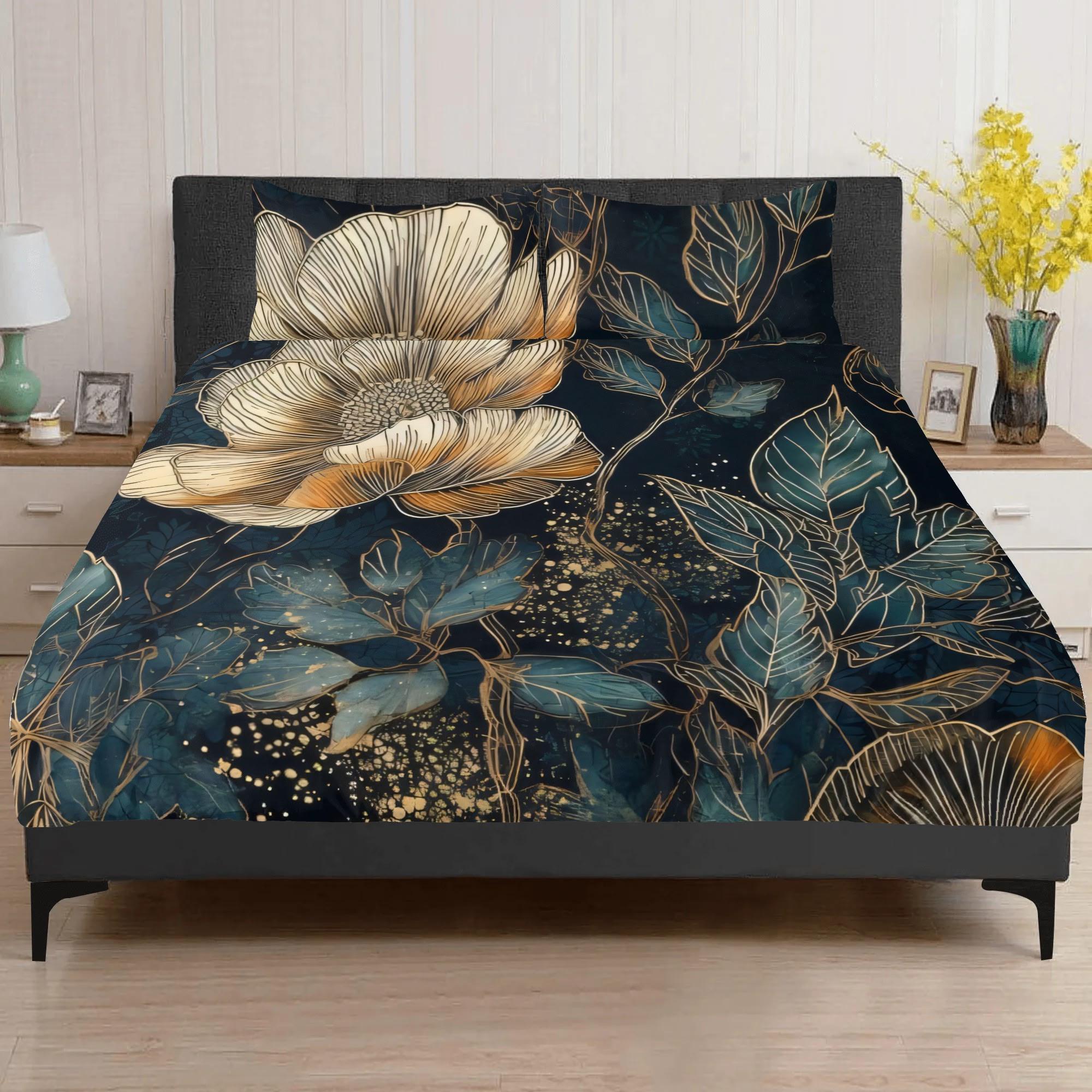 Turn your bedroom into a sanctuary of elegance with this breathtaking floral duvet cover. A luminous ivory bloom unfolds across a deep teal background, surrounded by delicately illustrated leaves and flowing botanical lines in warm gold tones. Subtle splashes of gold add depth and movement, creating a rich, painterly effect that feels both modern and timeless.