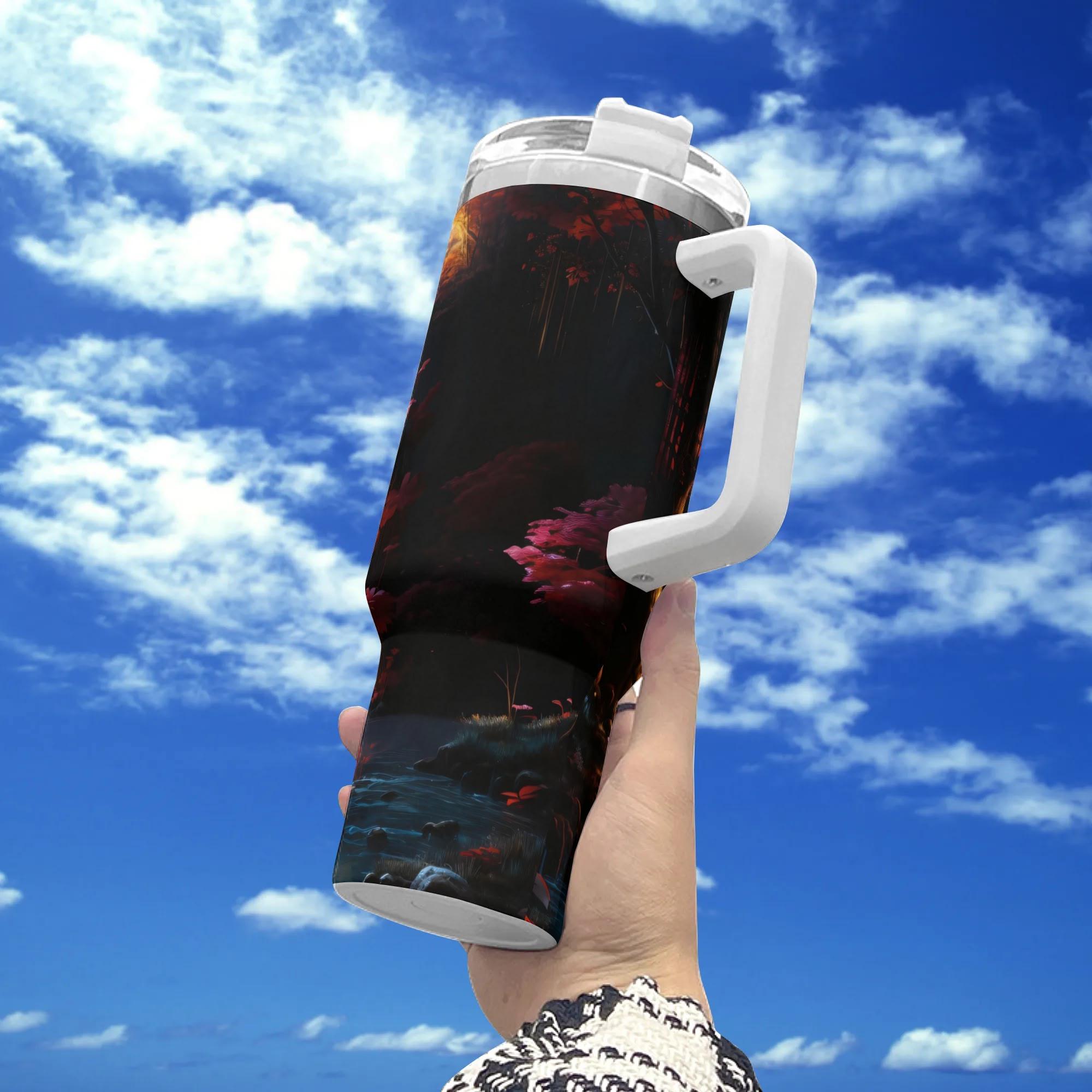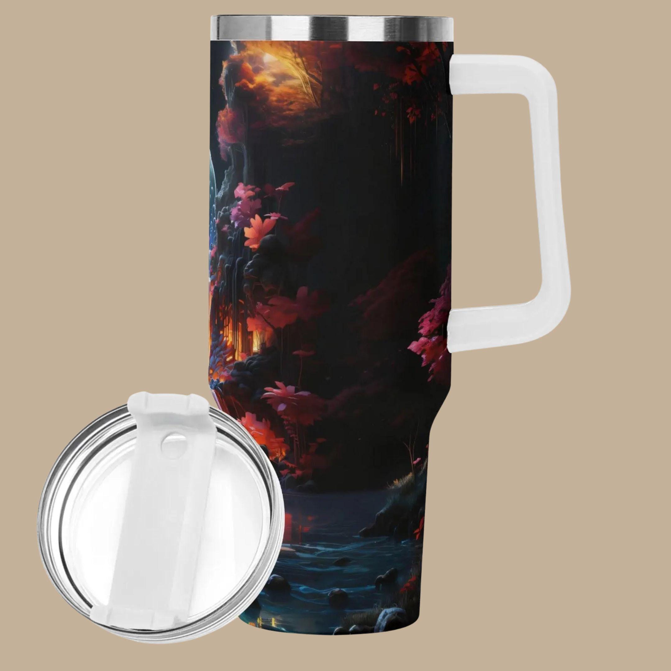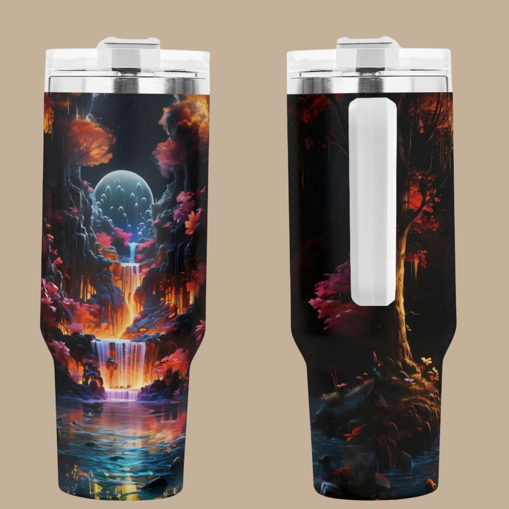 Step into a dreamscape every time you take a sip. This stunning insulated tumbler features a glowing moonlit waterfall nestled deep within an enchanted forest, where cascading water meets fiery autumn tones and luminous twilight skies. The artwork wraps seamlessly around the cup, revealing new magical details from every angle—like carrying a storybook world in your hands.