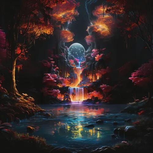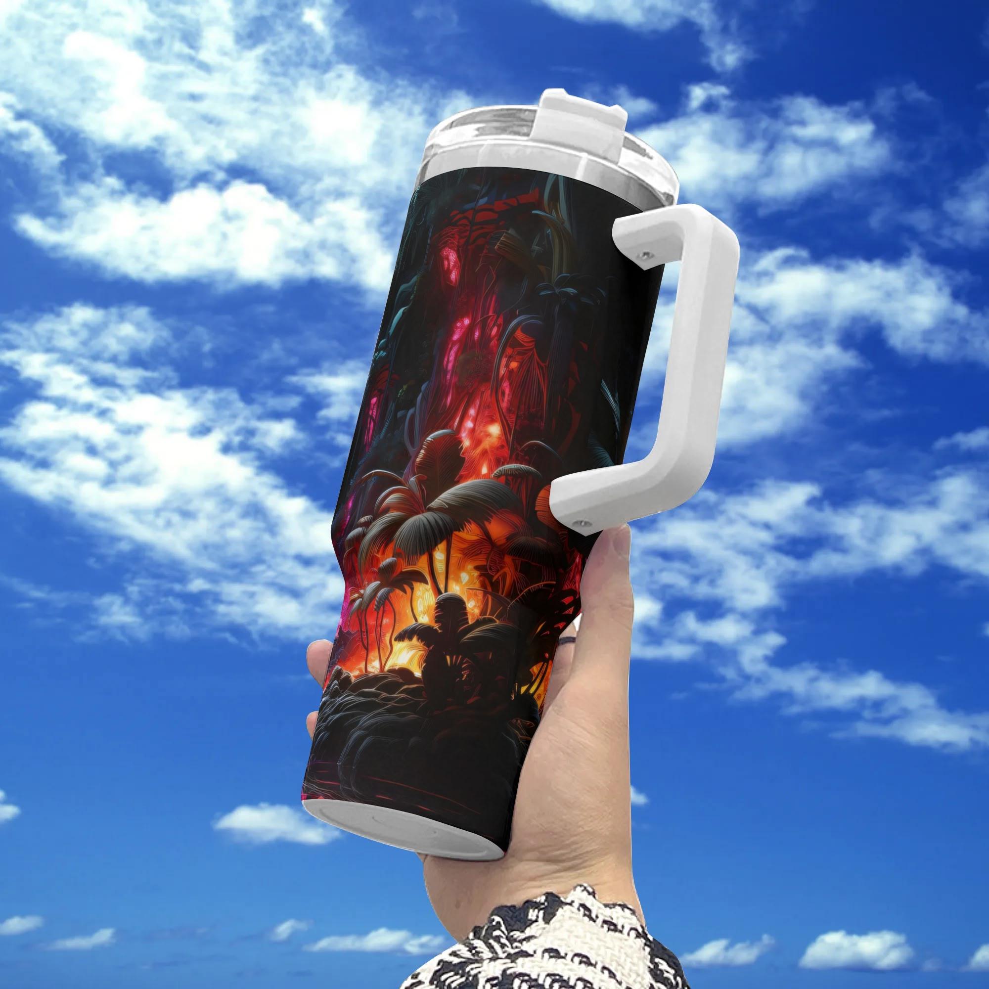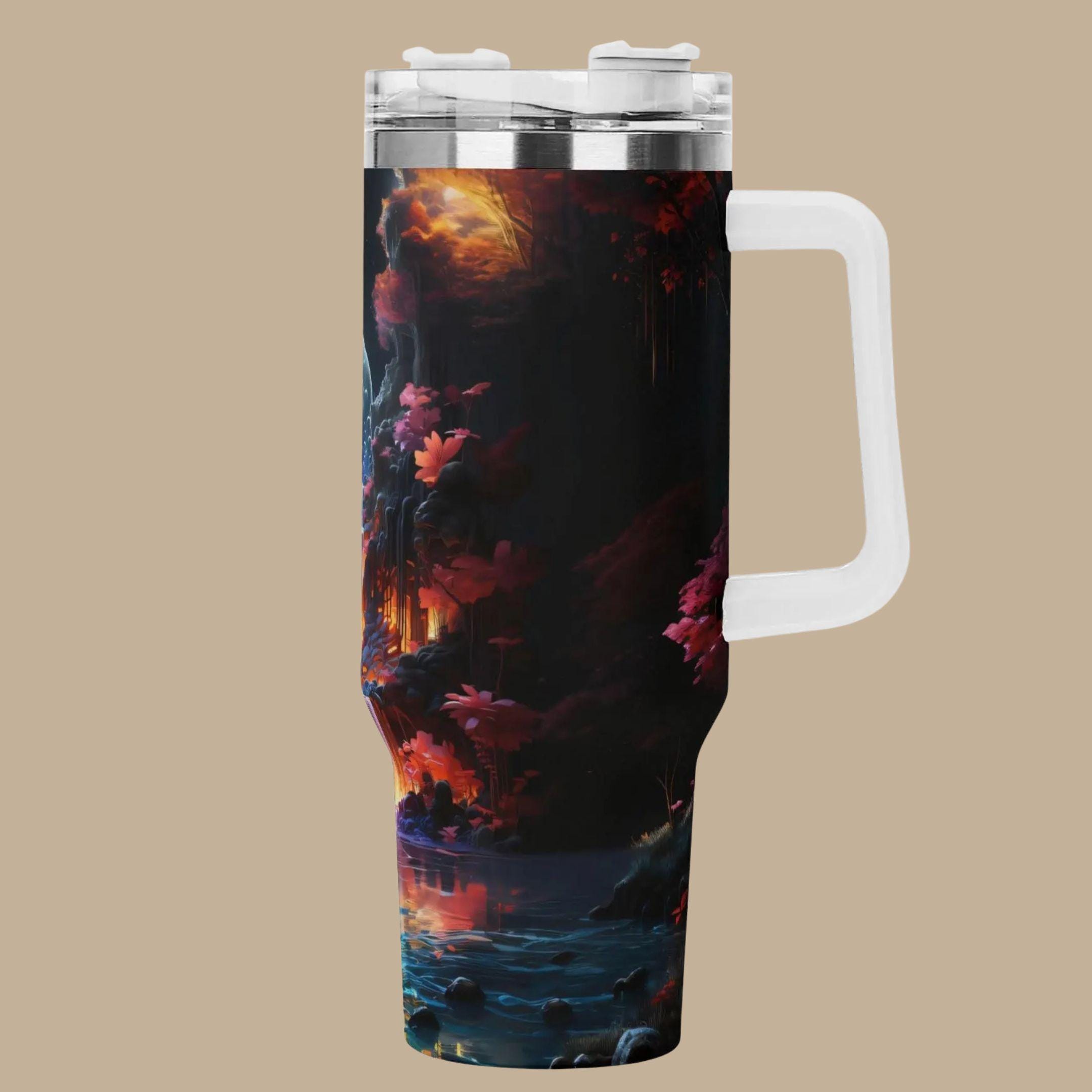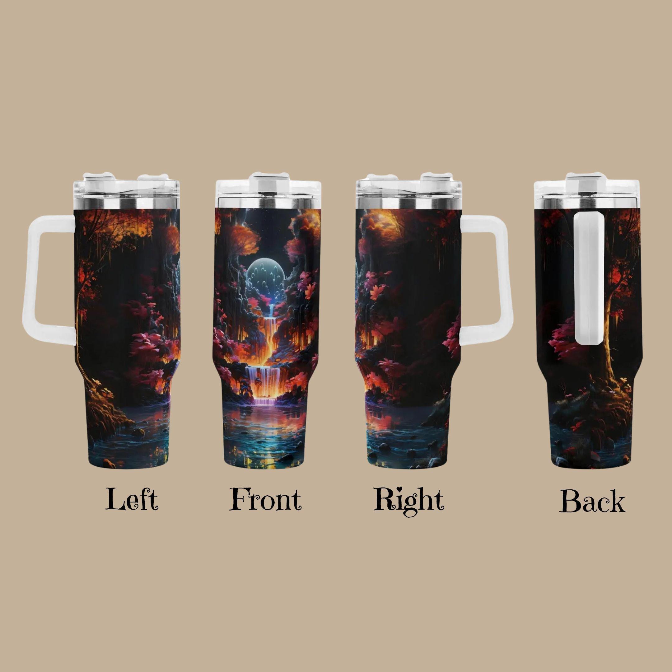 Lose yourself in a glowing night jungle where a luminous waterfall pours through shadowy cliffs lit with electric magenta, ember orange, and deep teal blues. This bold fantasy artwork wraps fully around the tumbler, creating a dramatic, immersive scene that feels equal parts mystical and cinematic.