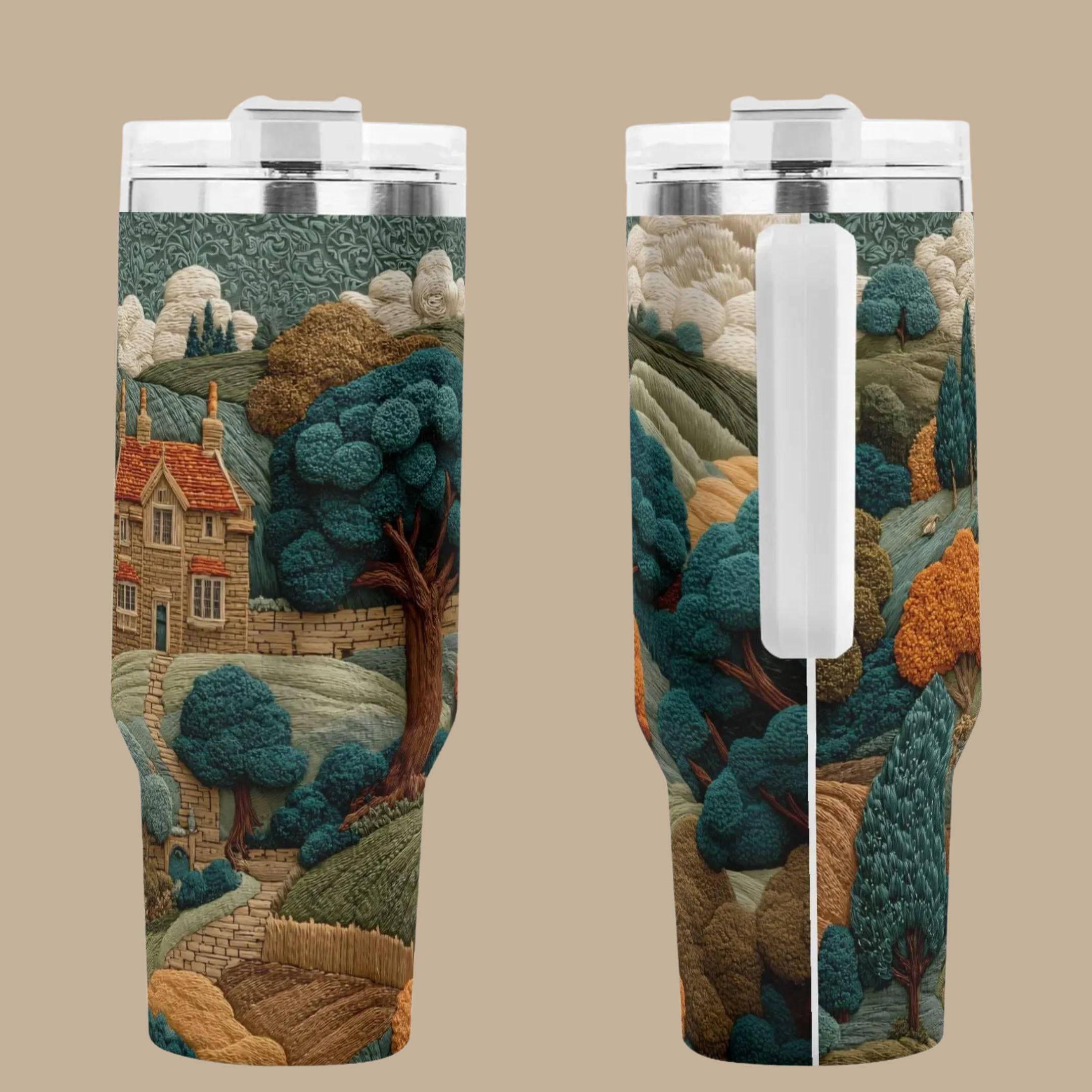 Like a quiet walk through a storybook village, this beautifully illustrated countryside tumbler wraps your drink in calm, comfort, and charm. Rolling hills, winding paths, and a cozy stone cottage nestled among textured trees create a scene that feels warm, nostalgic, and timeless. 🌲🏡
