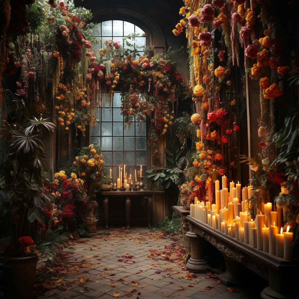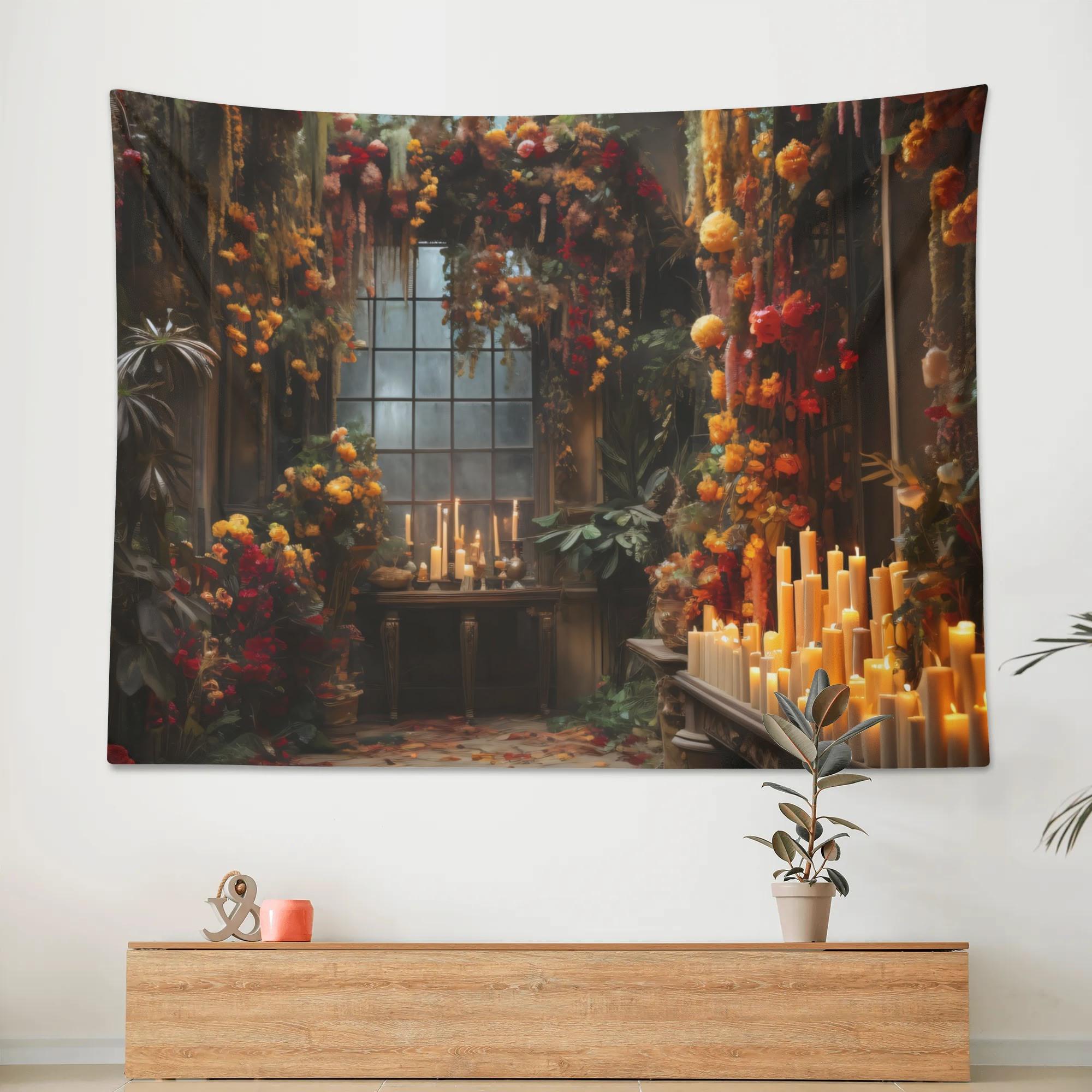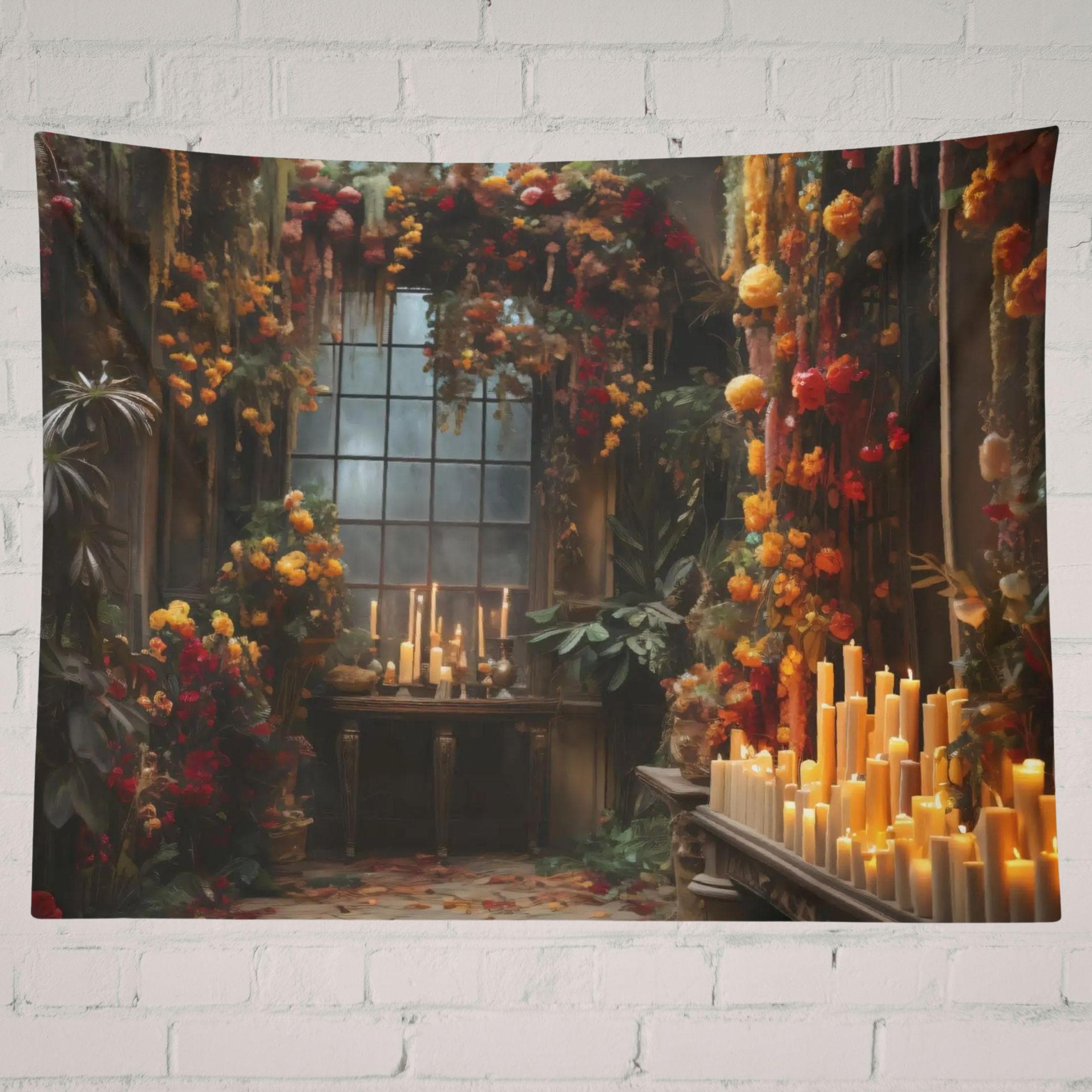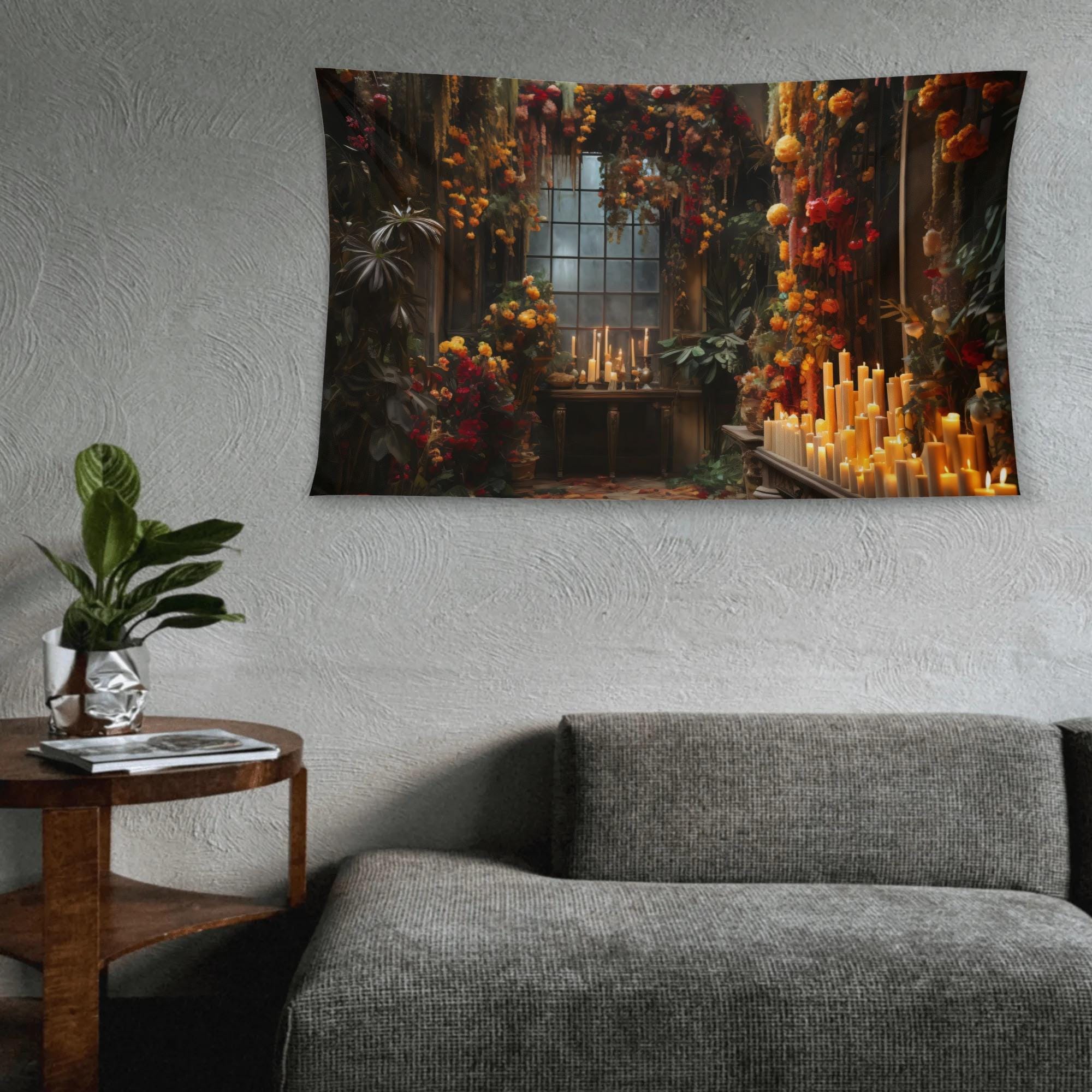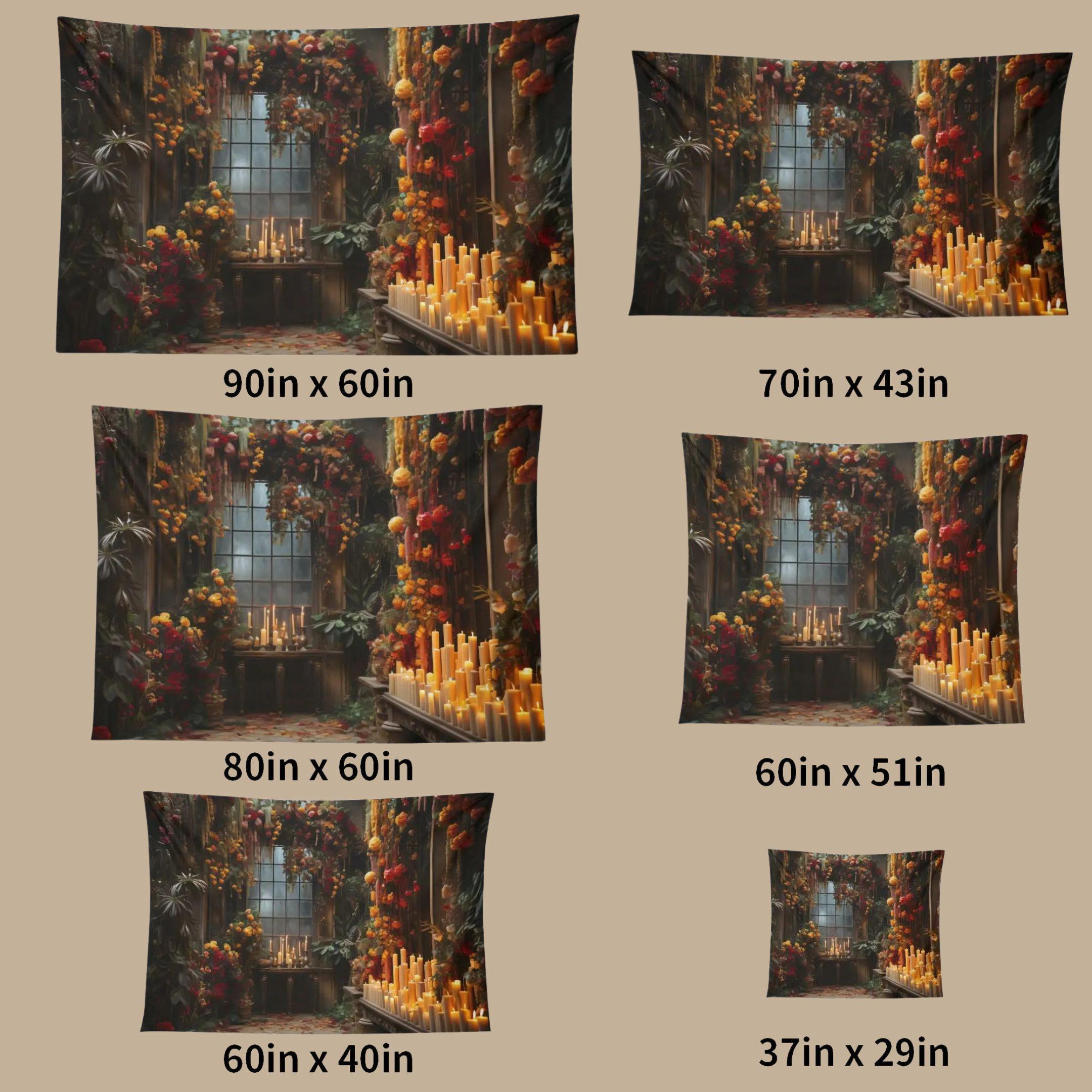 Step into a glowing sanctuary where candlelight dances among cascading florals and rich autumn foliage. This enchanting tapestry transforms any space into a cozy, romantic retreat—perfect for lovers of cottagecore, moody botanicals, and warm seasonal décor.