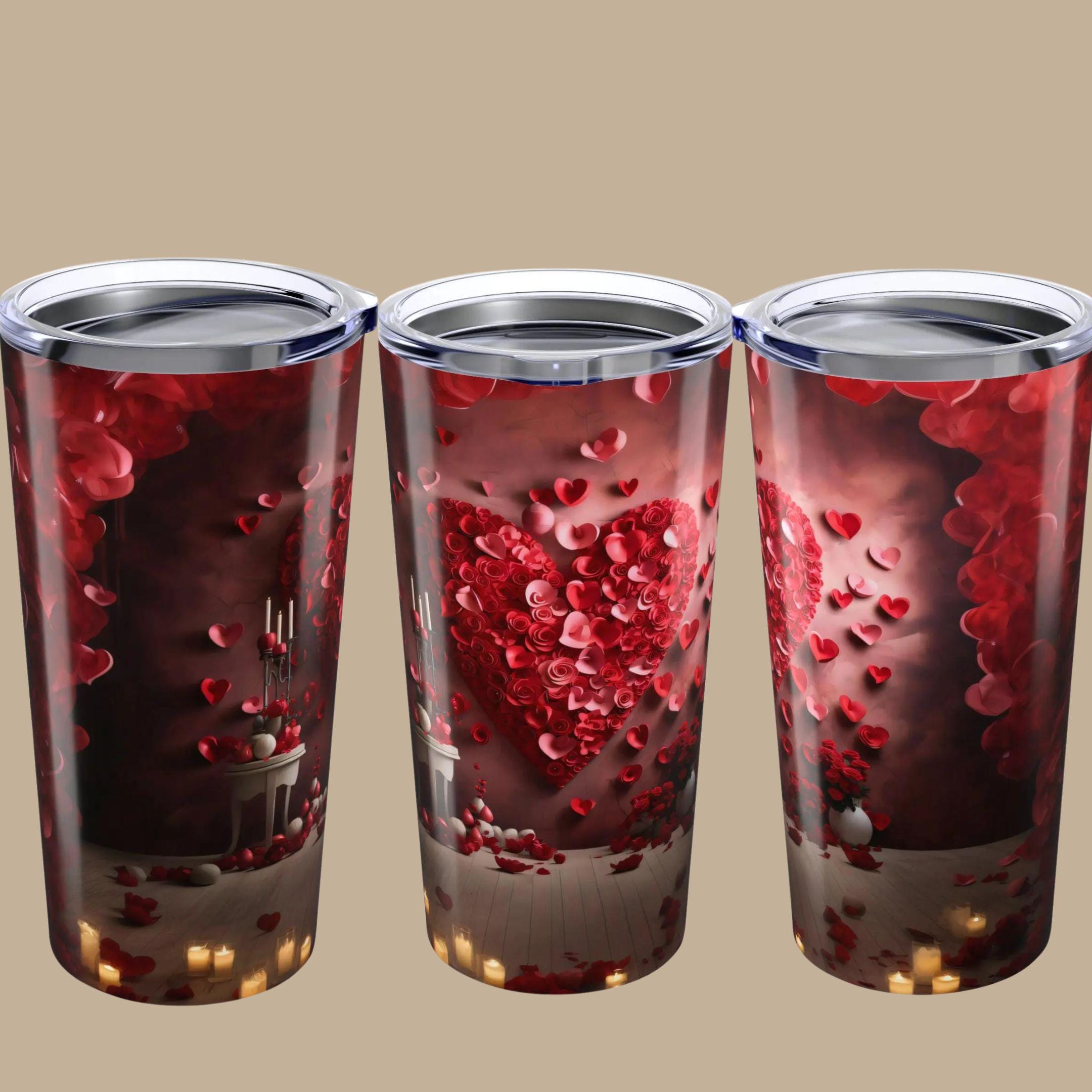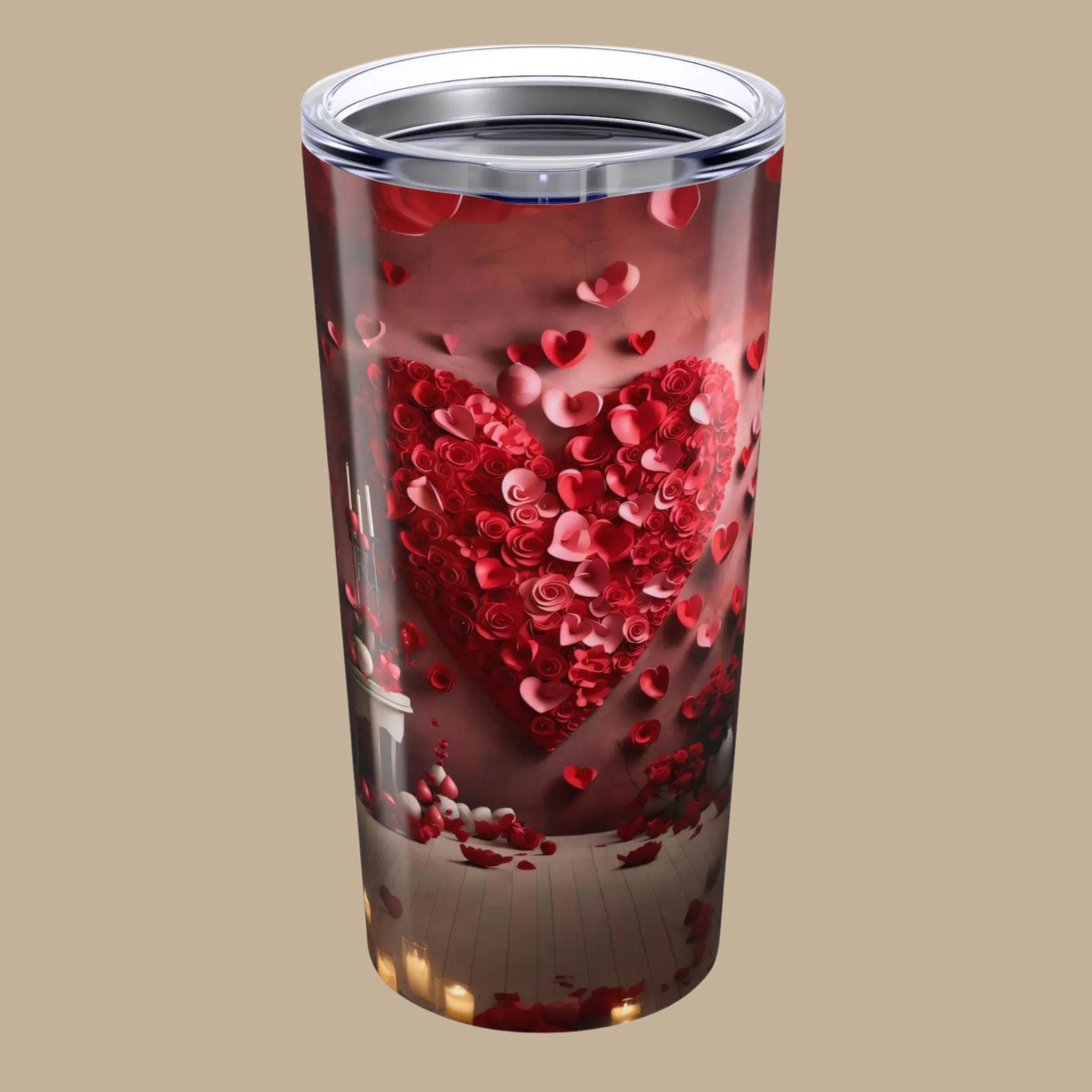 A 20oz stainless steel tumbler wrapped in a deep, romantic cascade of red hearts and petals. The glossy full-color wraparound print catches the light, turning everyday sips into a small, intimate moment. Vacuum insulation holds coffee steaming on chilly mornings or keeps iced drinks cold through long afternoons. The clear push-on lid with a rubber gasket seals securely for commute-ready use, while rounded corners and a smooth finish feel comfortable in hand. This tumbler belongs on bedside tables, office desks, and picnic blankets — a little reminder of warmth and affection with every drink.
