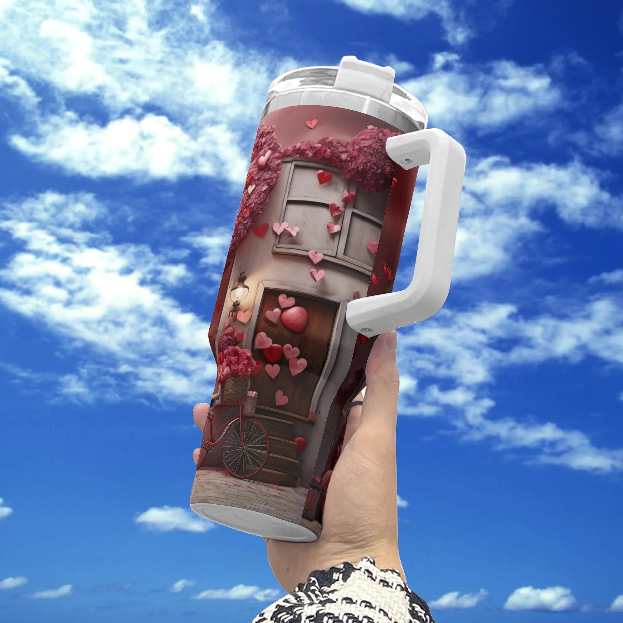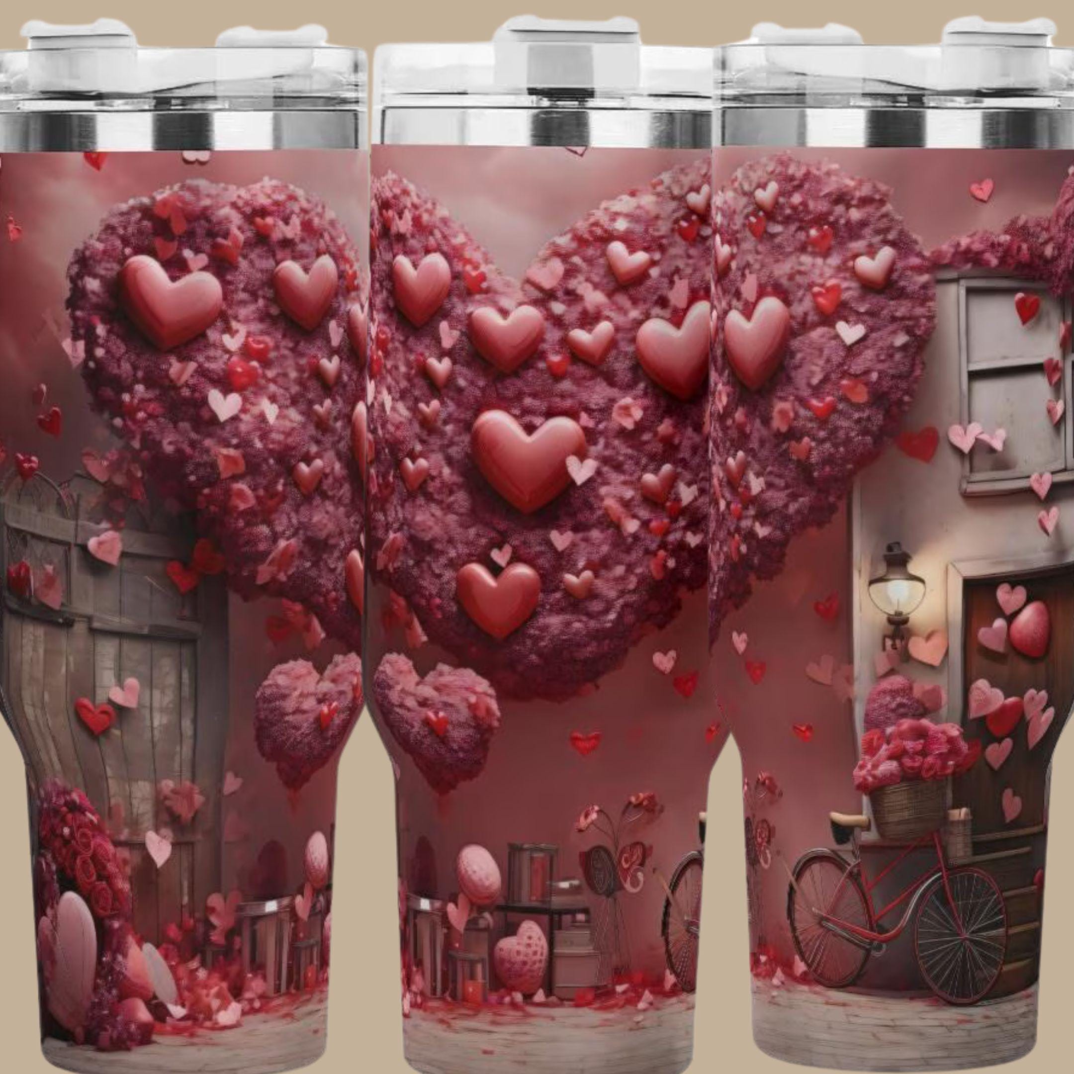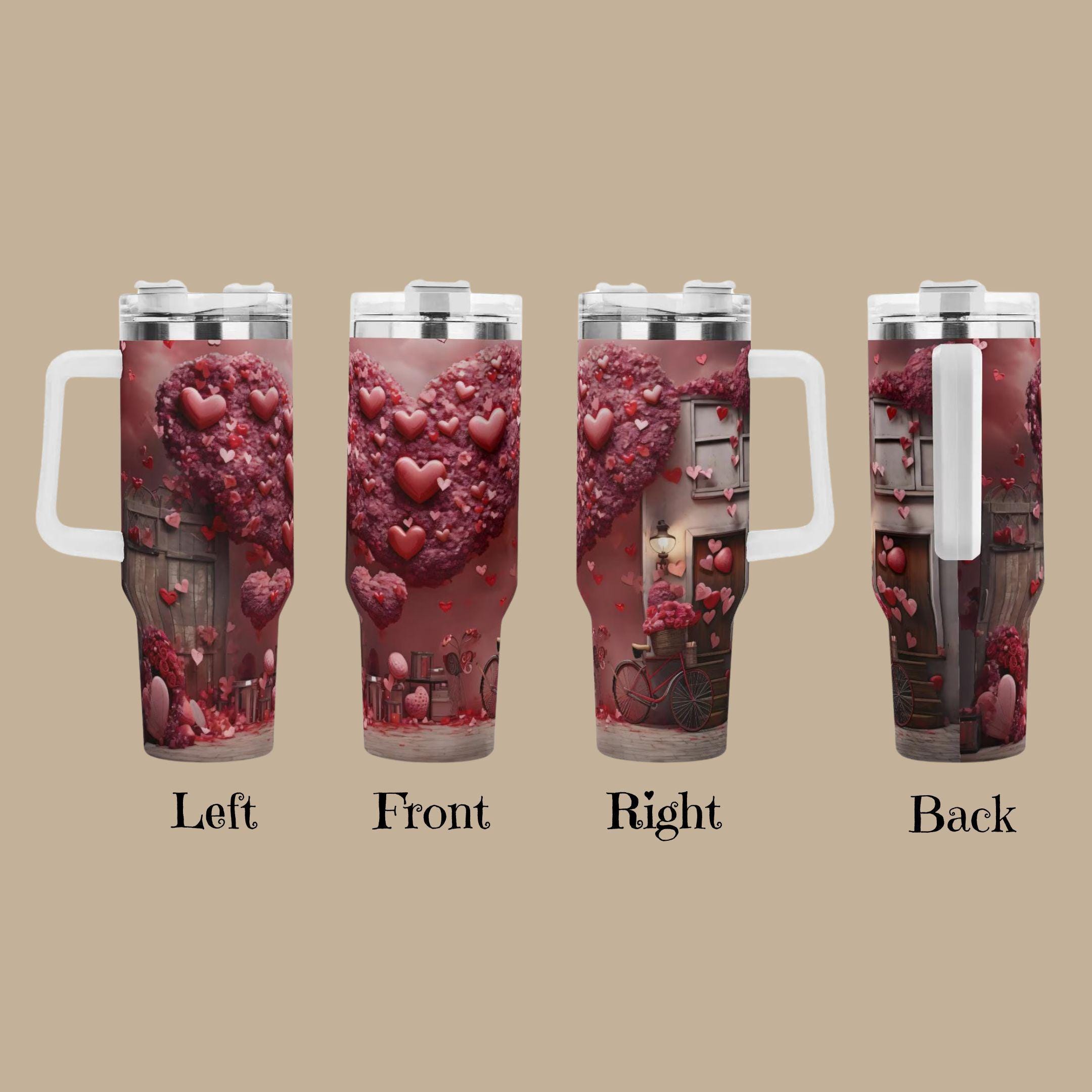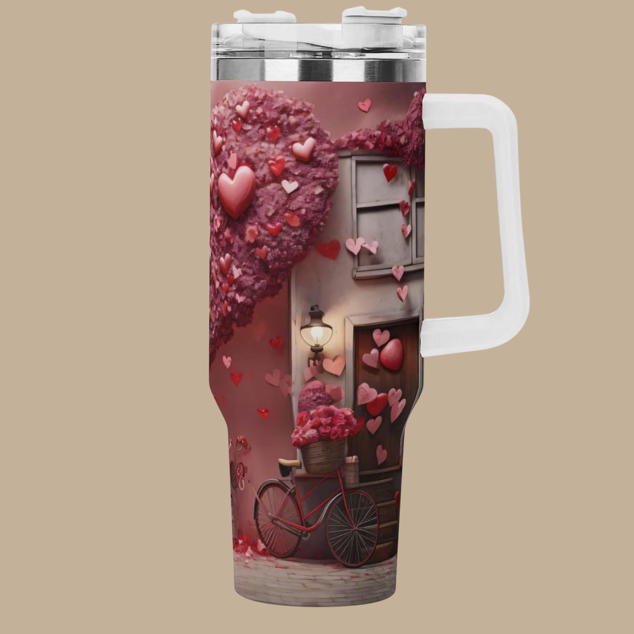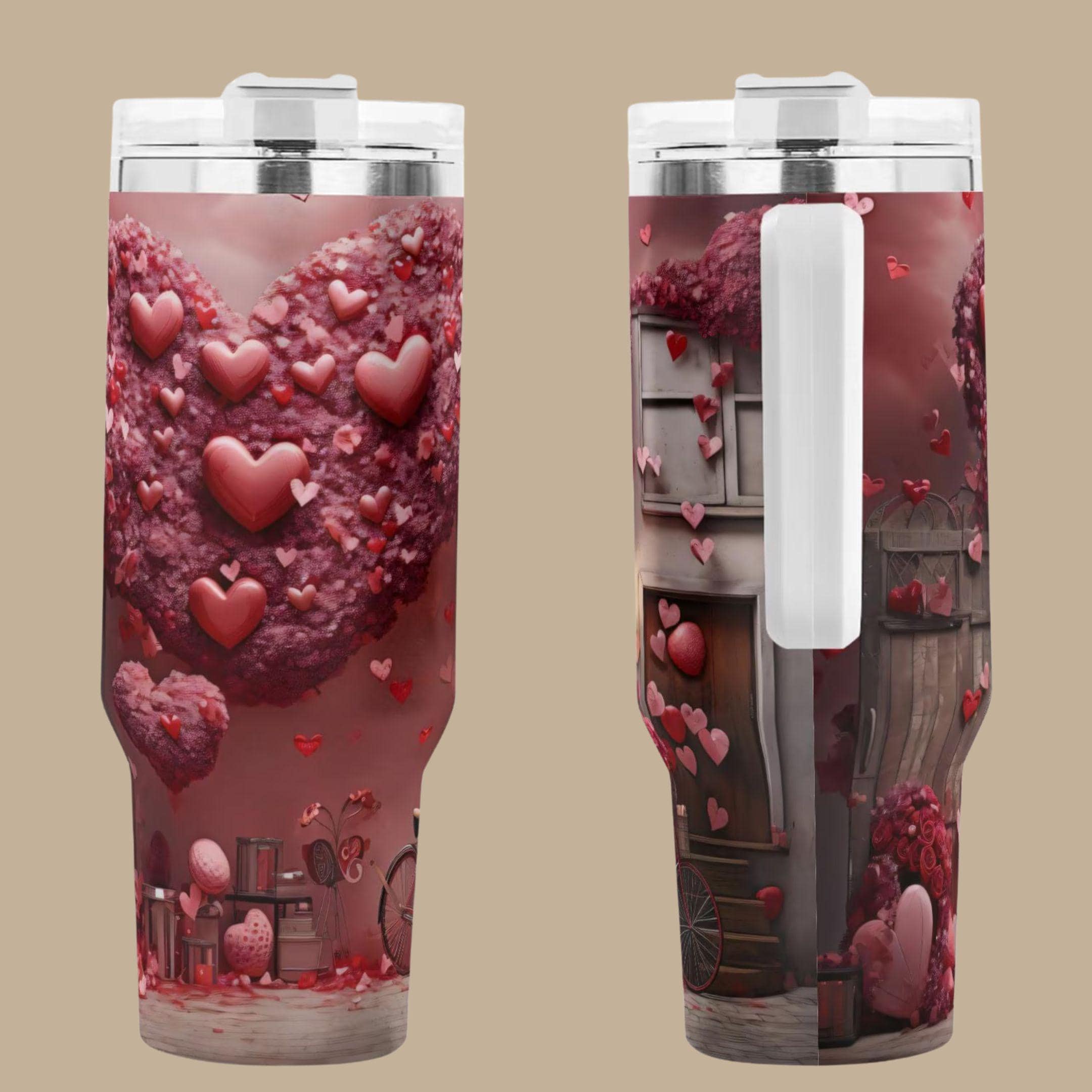 This tumbler features a dreamy heart-filled garden scene, where soft pink blossoms and floating hearts come together in a cozy, storybook setting. It feels warm, gentle, and full of affection — the kind of cup you reach for when you want comfort, sweetness, and a little joy in your day.