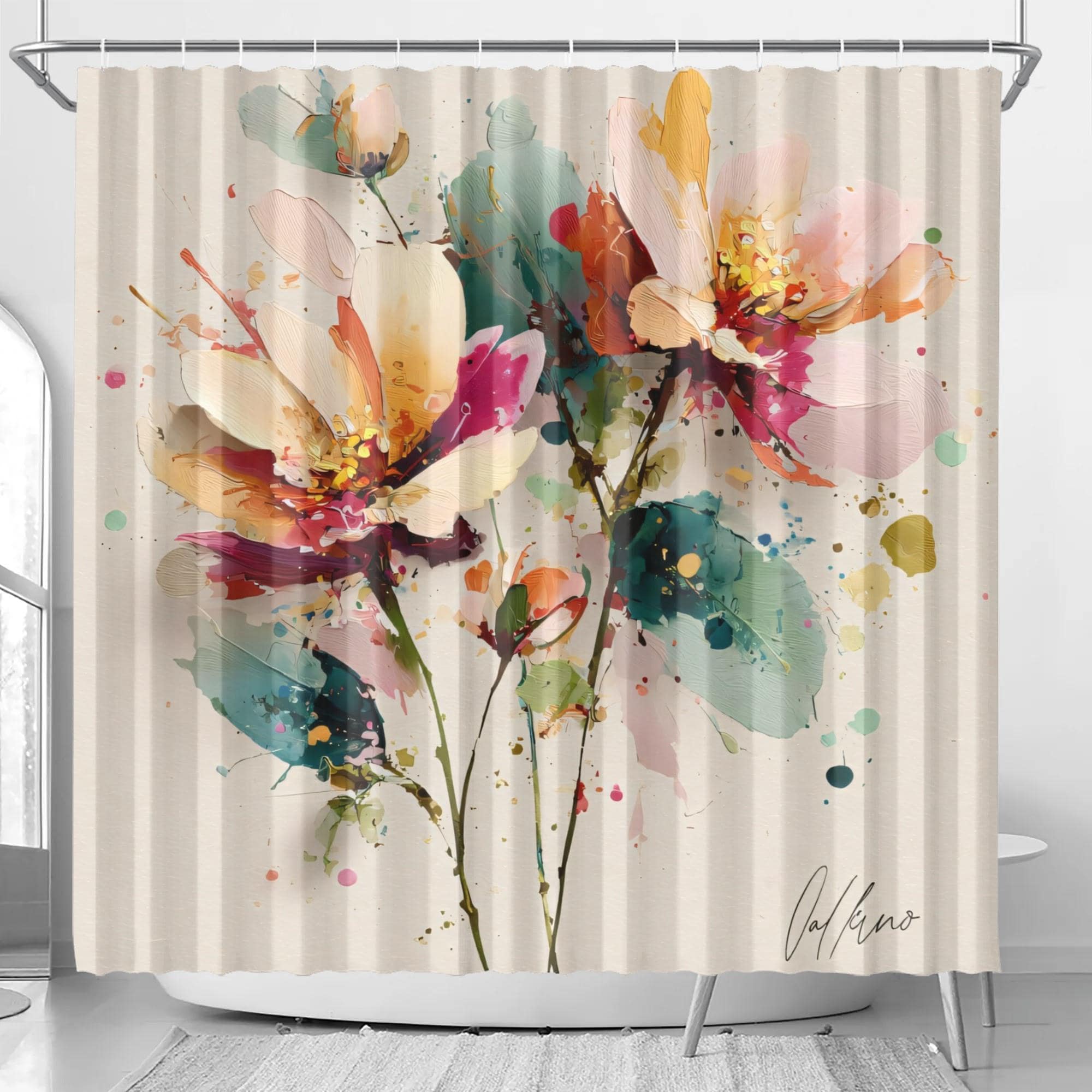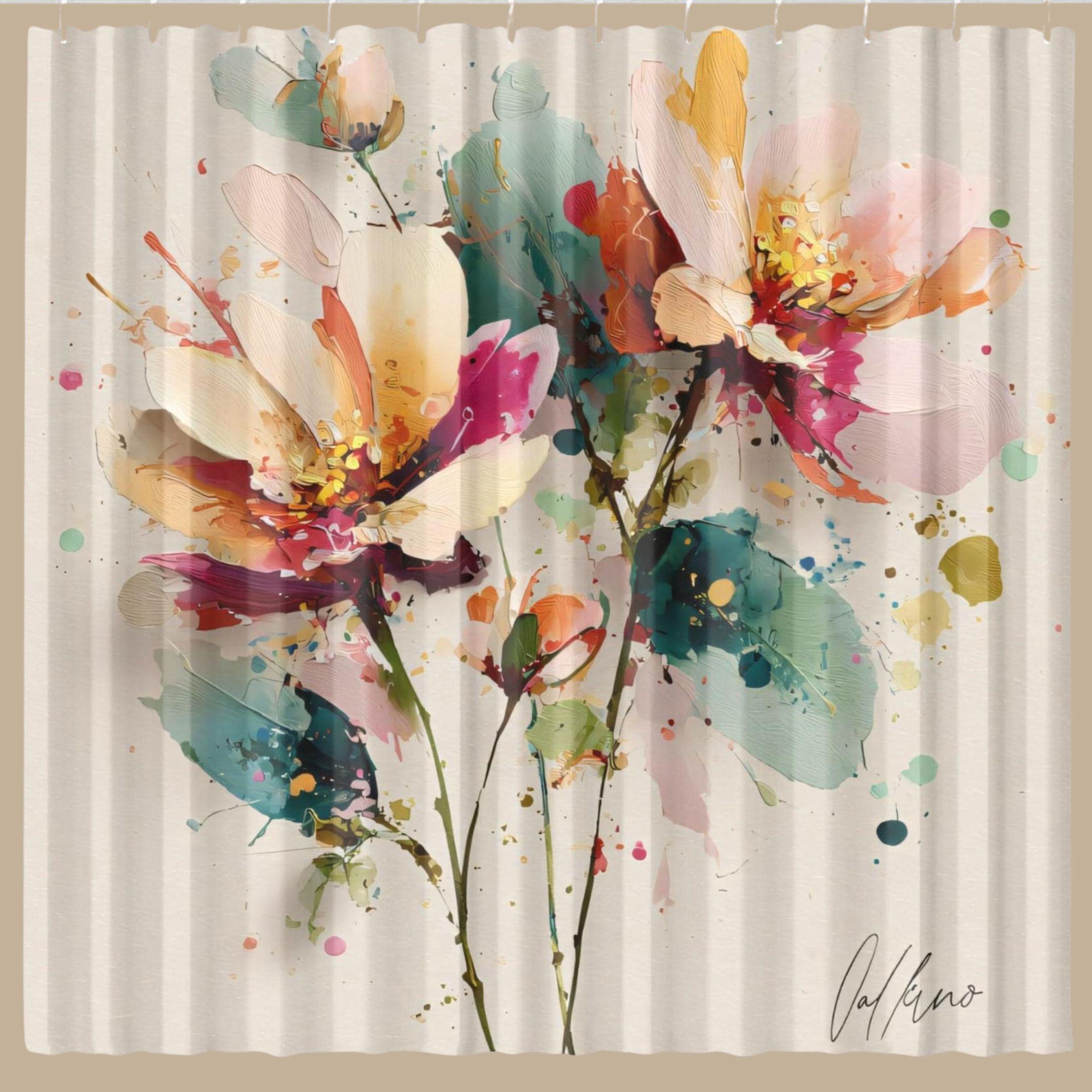 Bring a breath of calm, color, and artistry into your bathroom with this stunning abstract floral shower curtain. Featuring soft watercolor blooms in blush, coral, teal, and golden tones, this design feels like a modern art painting gently unfolding across your space.