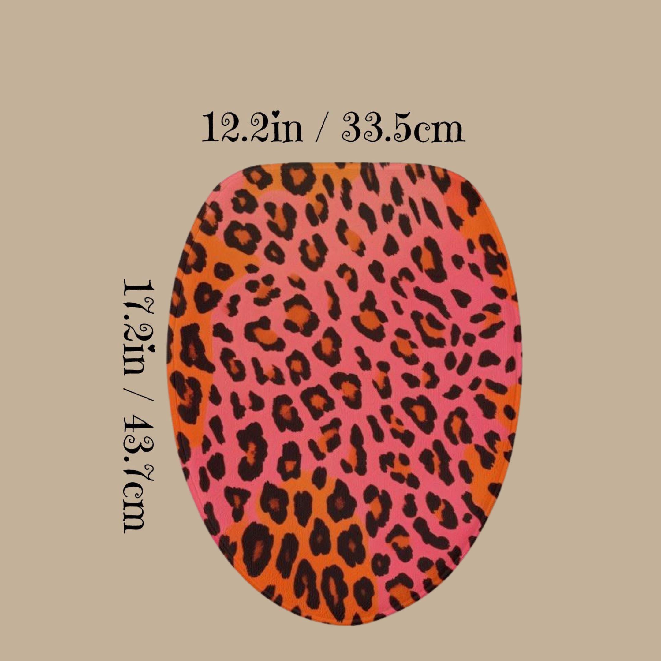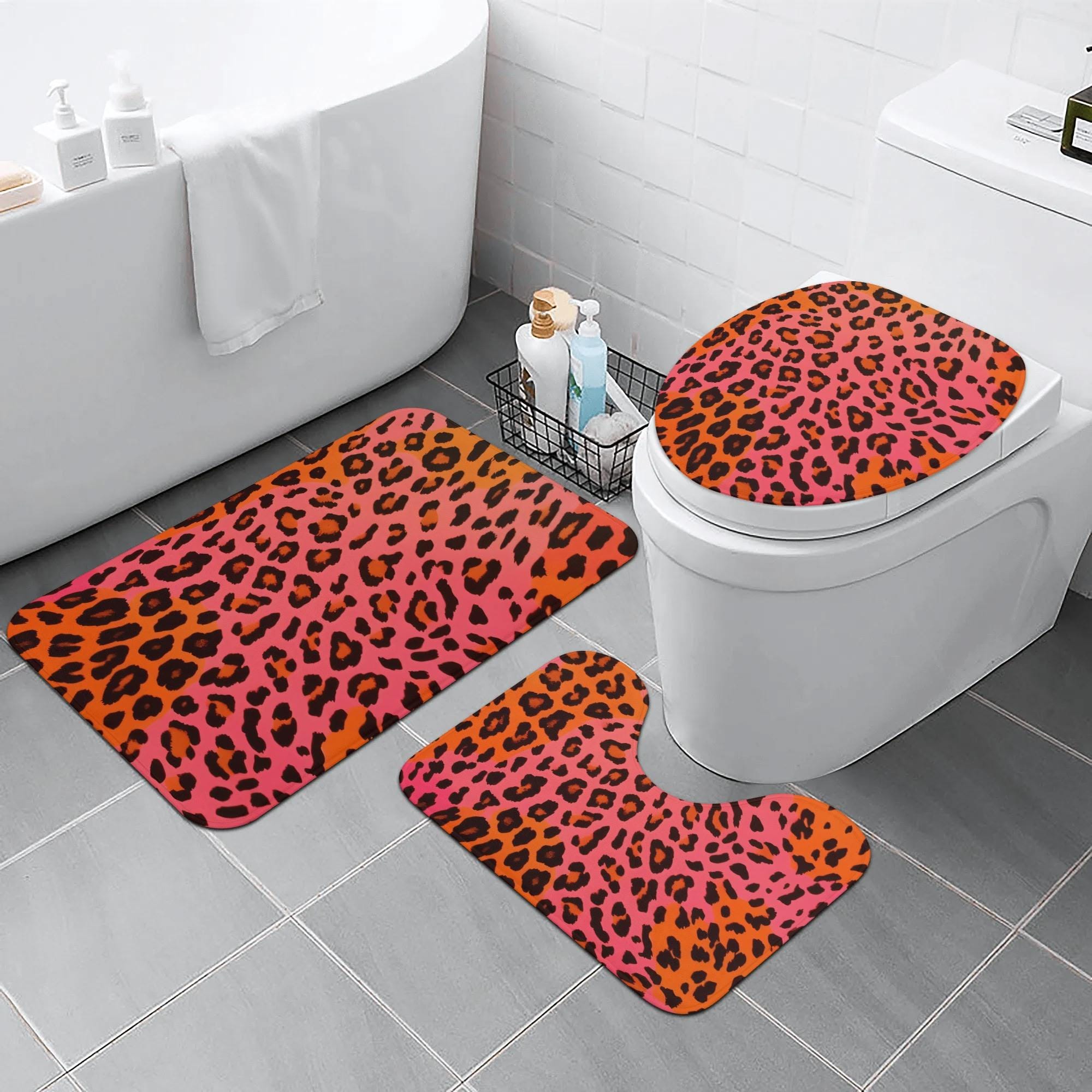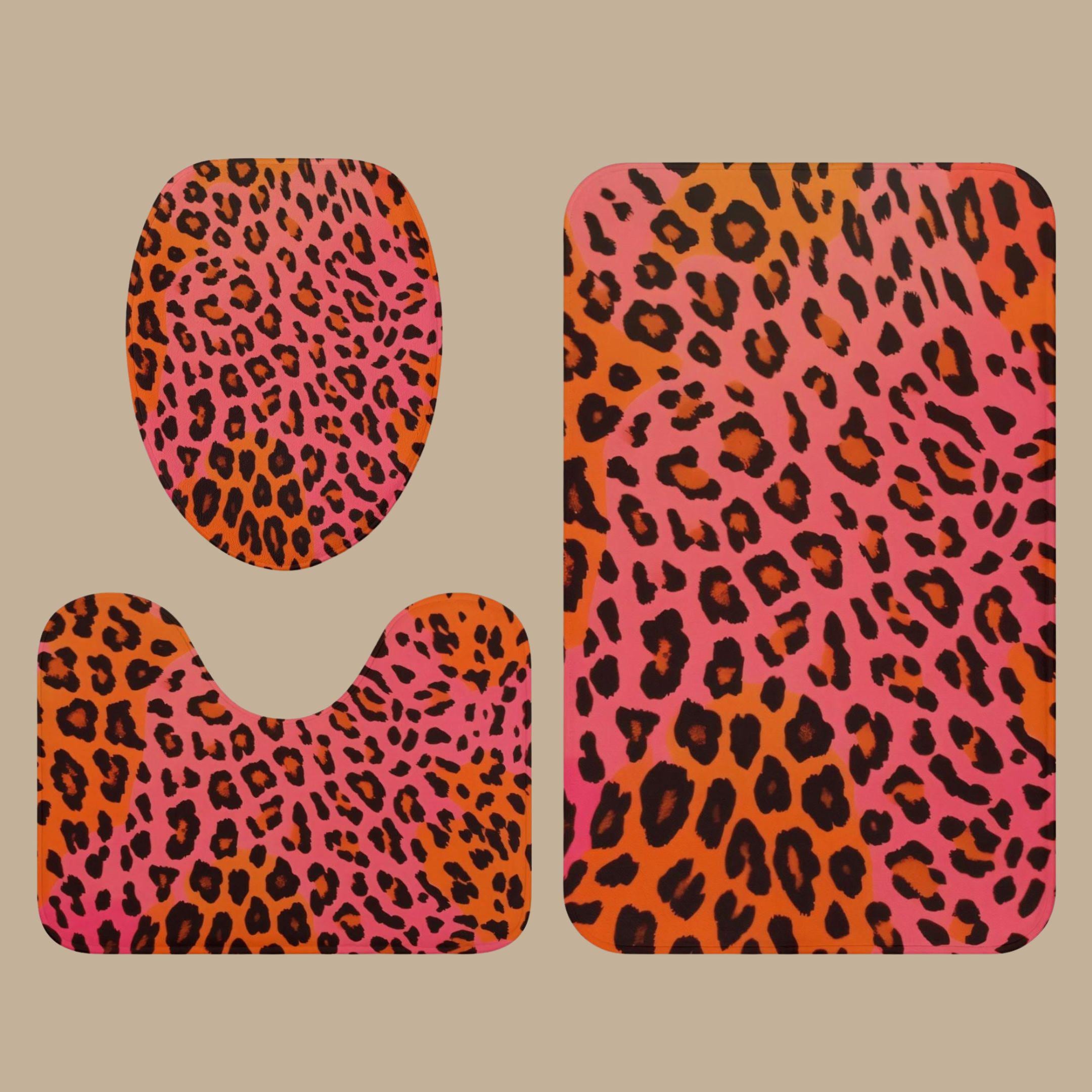 Pink & Orange Leopard Print Bathroom Rug Set | 3-Piece Non-Slip Toilet Mat Set | Flannel Bath Mat & Toilet Cover | Bold Modern Bathroom Decor