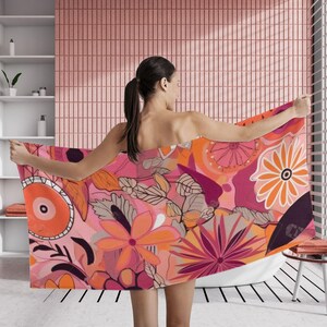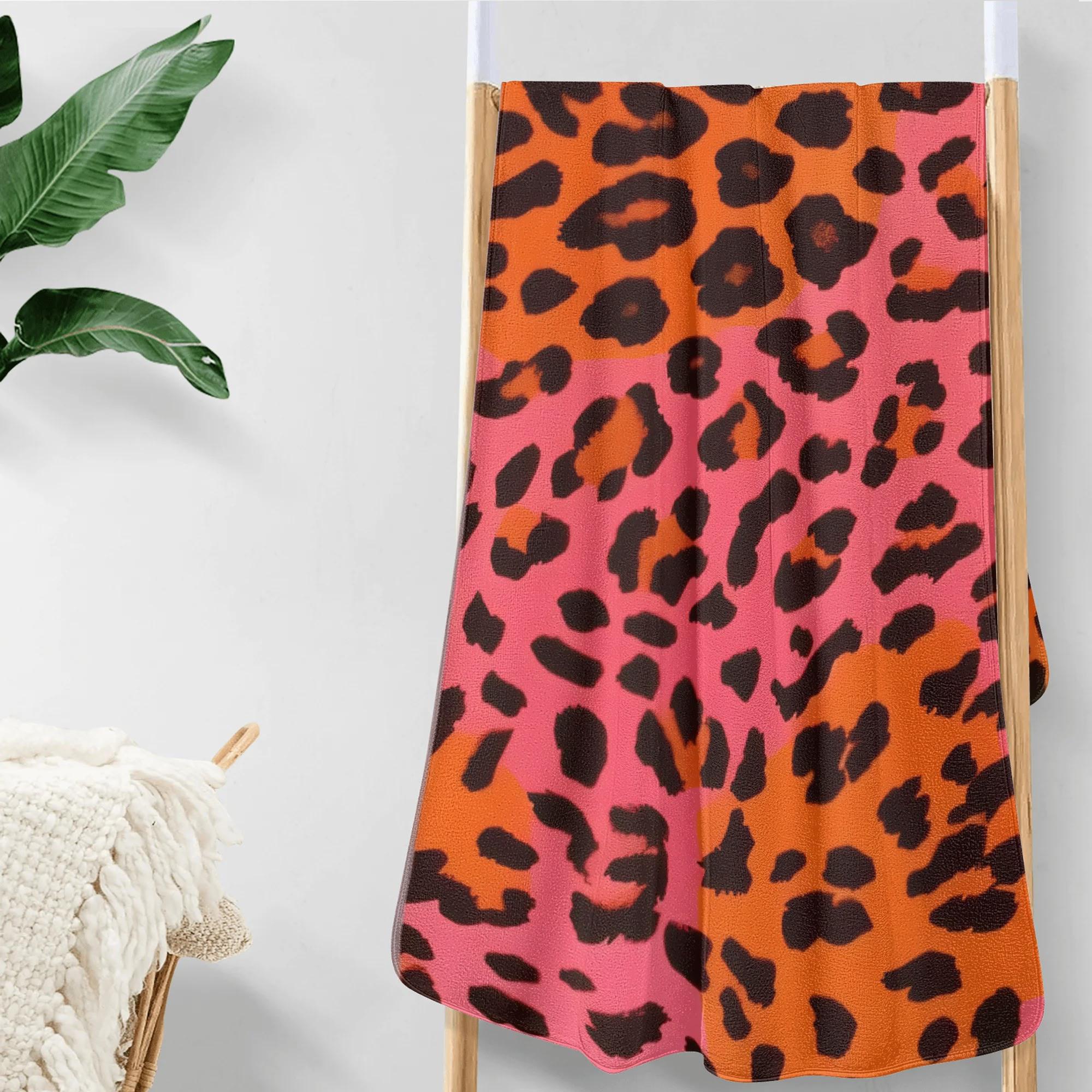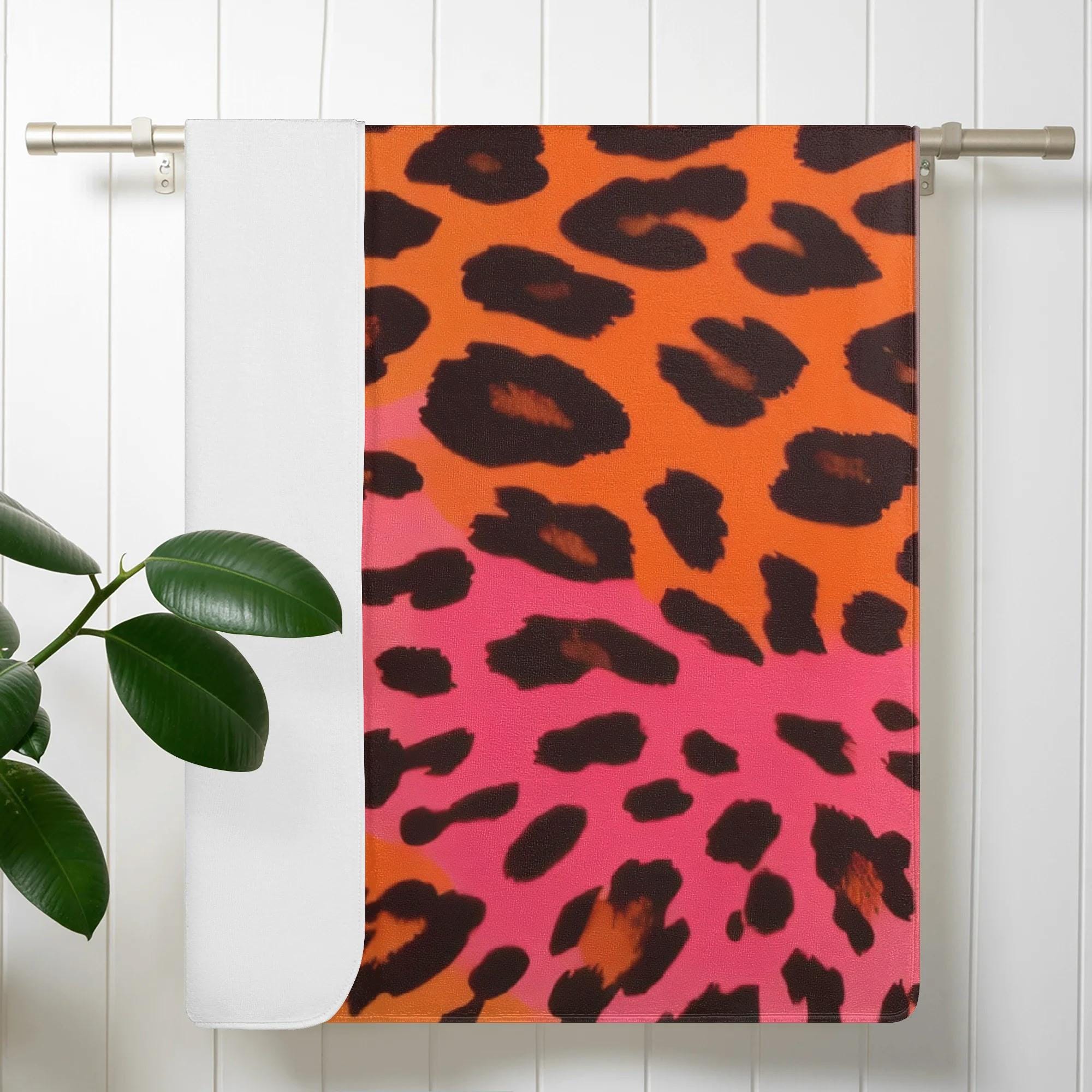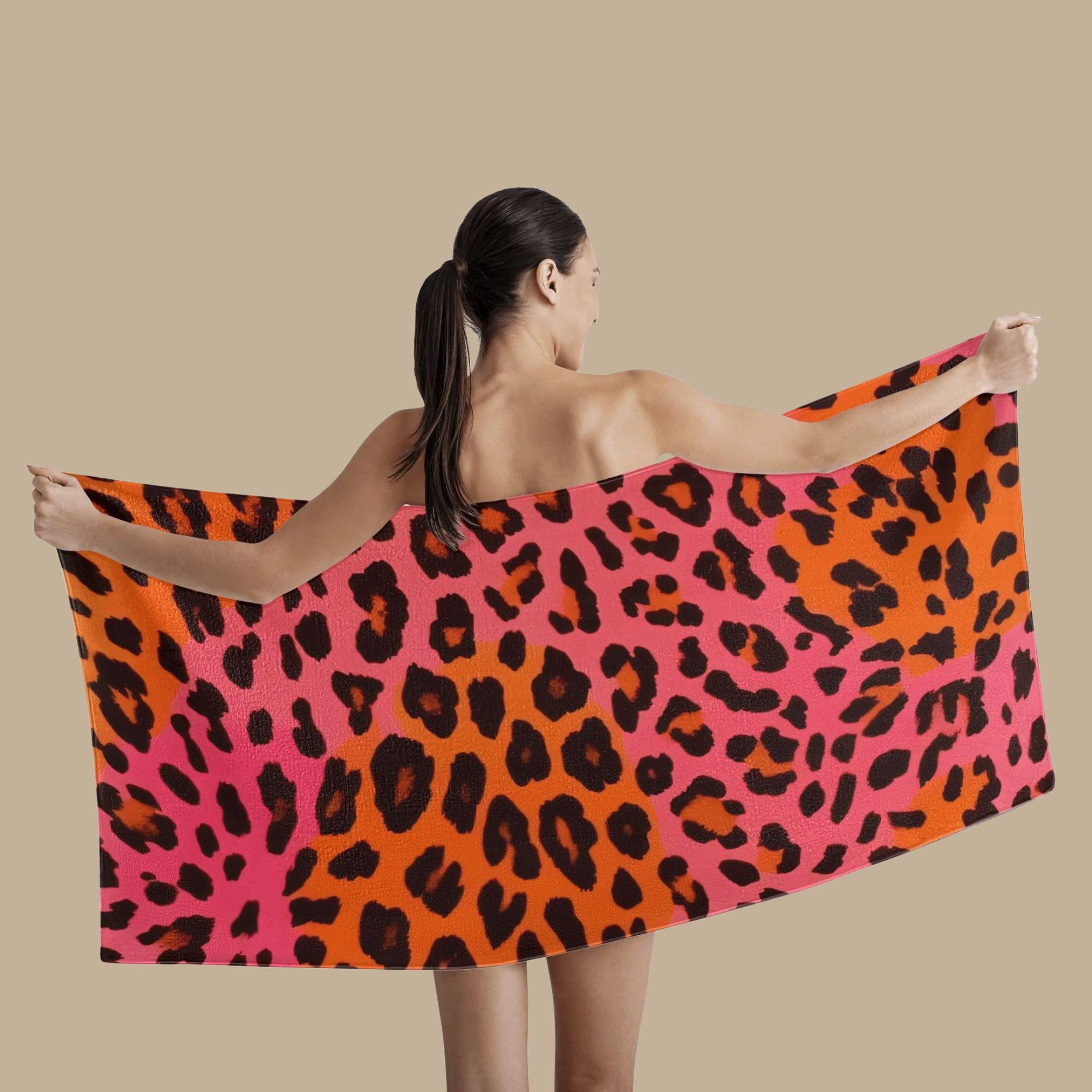Wrap yourself in color and confidence with this pink and orange leopard print bath towel. Designed to be lightweight yet plush, this vibrant towel brings bold style to your bathroom, beach days, poolside lounging, and travel adventures.