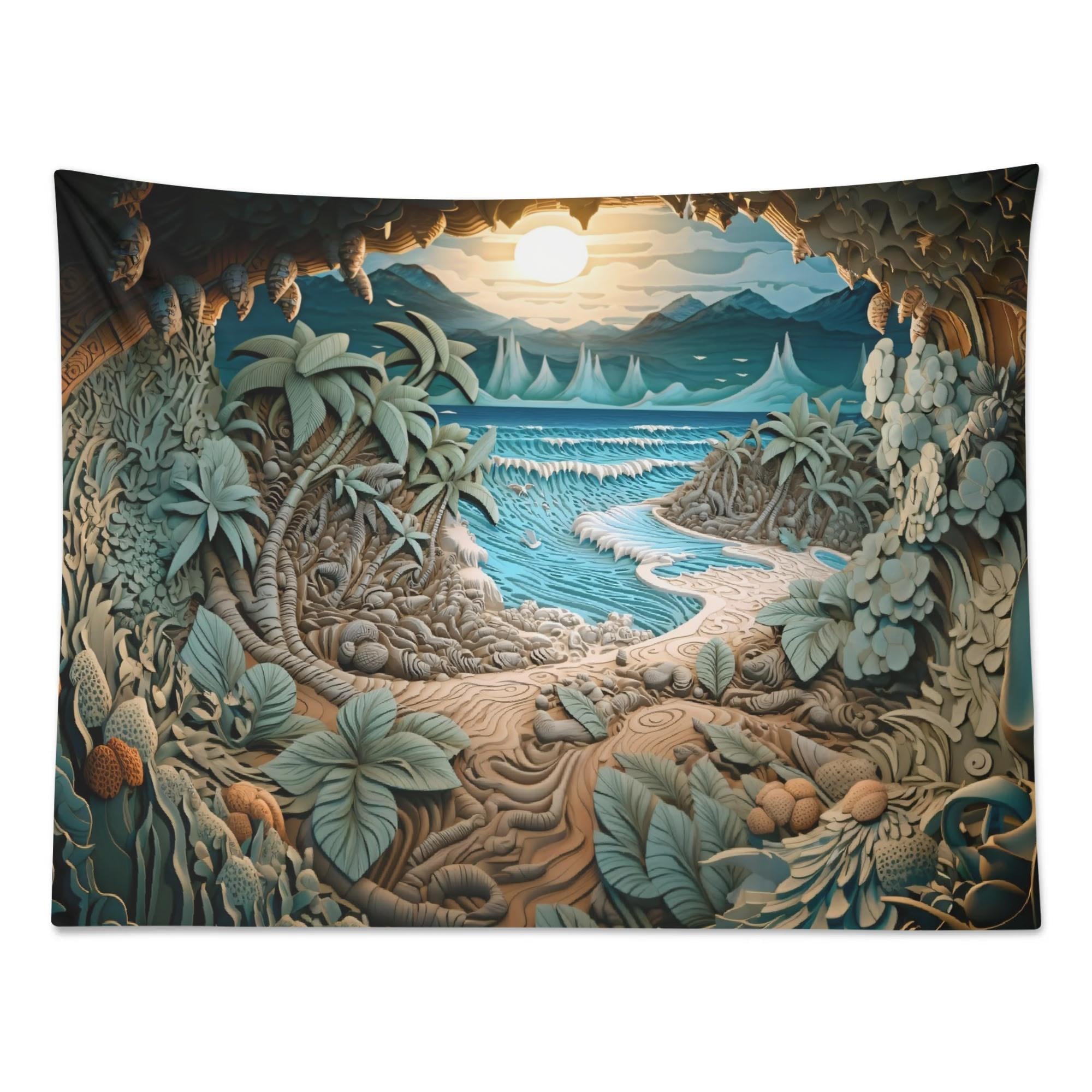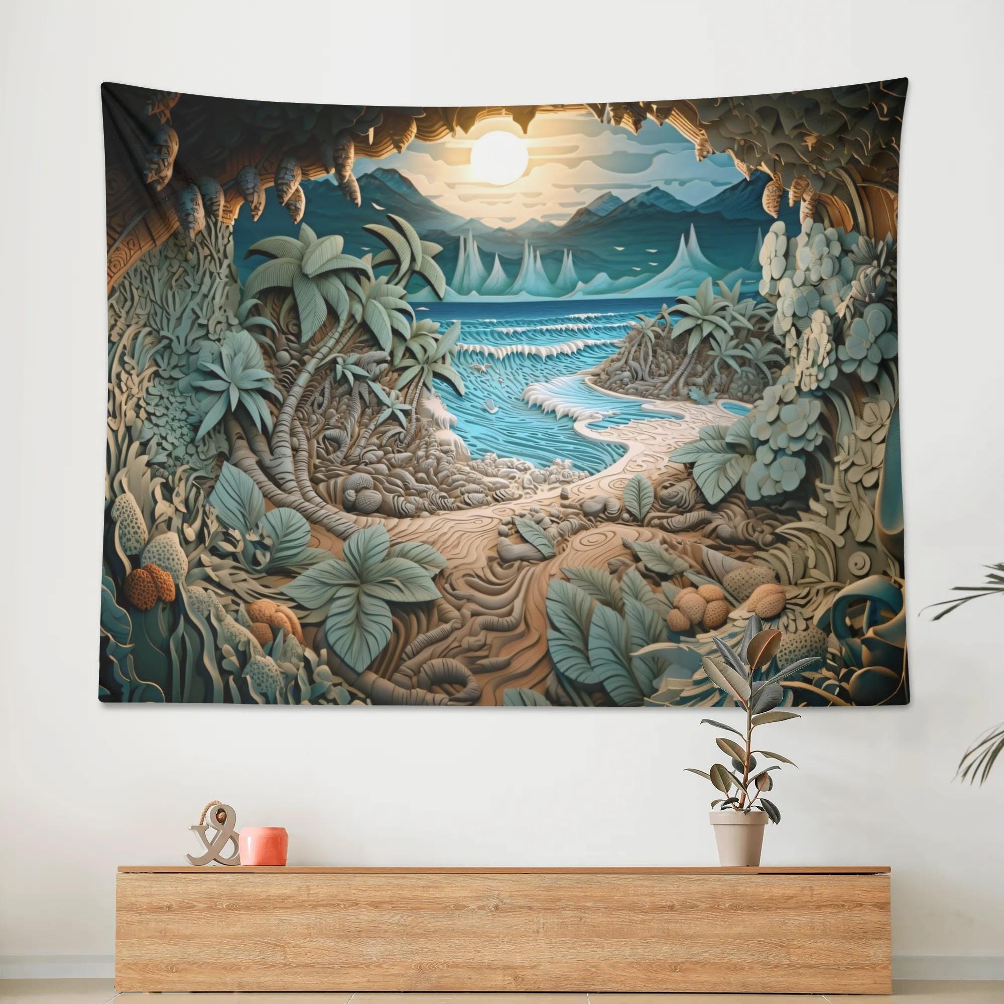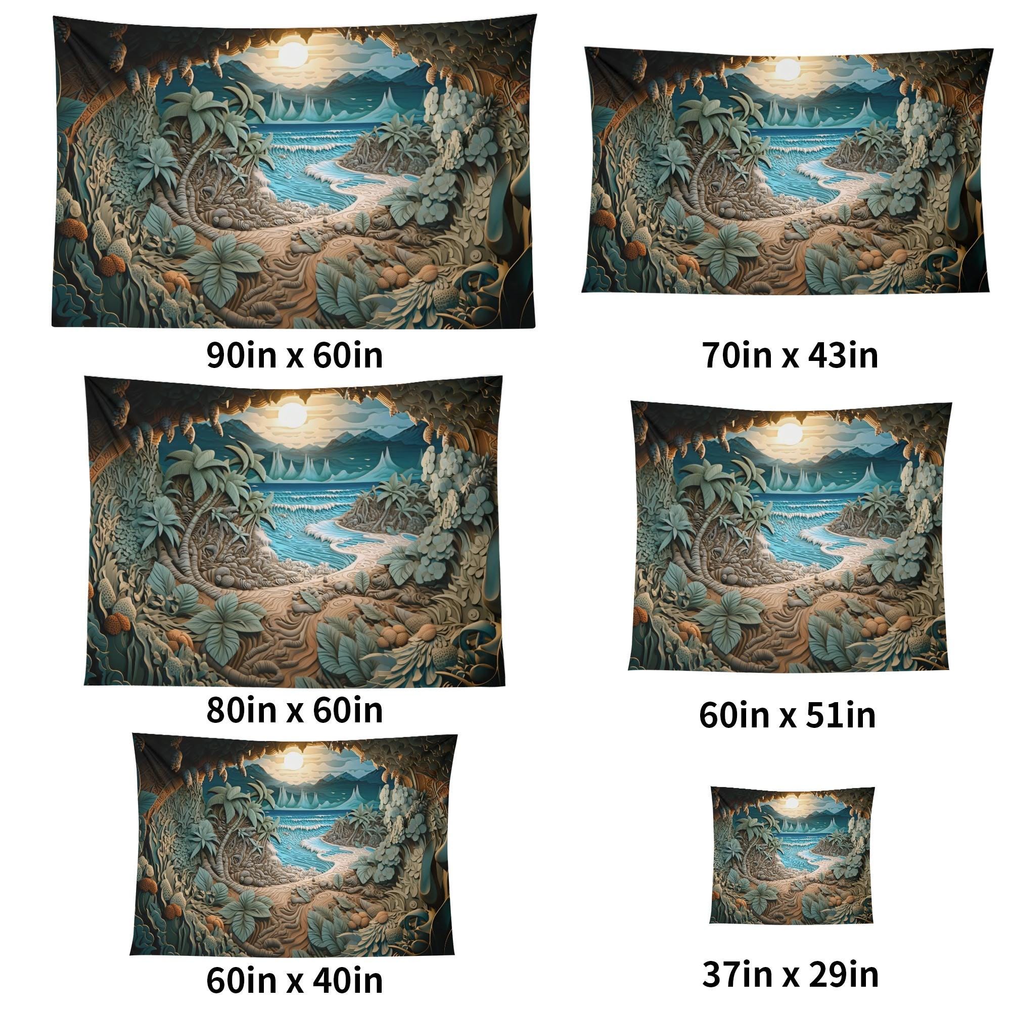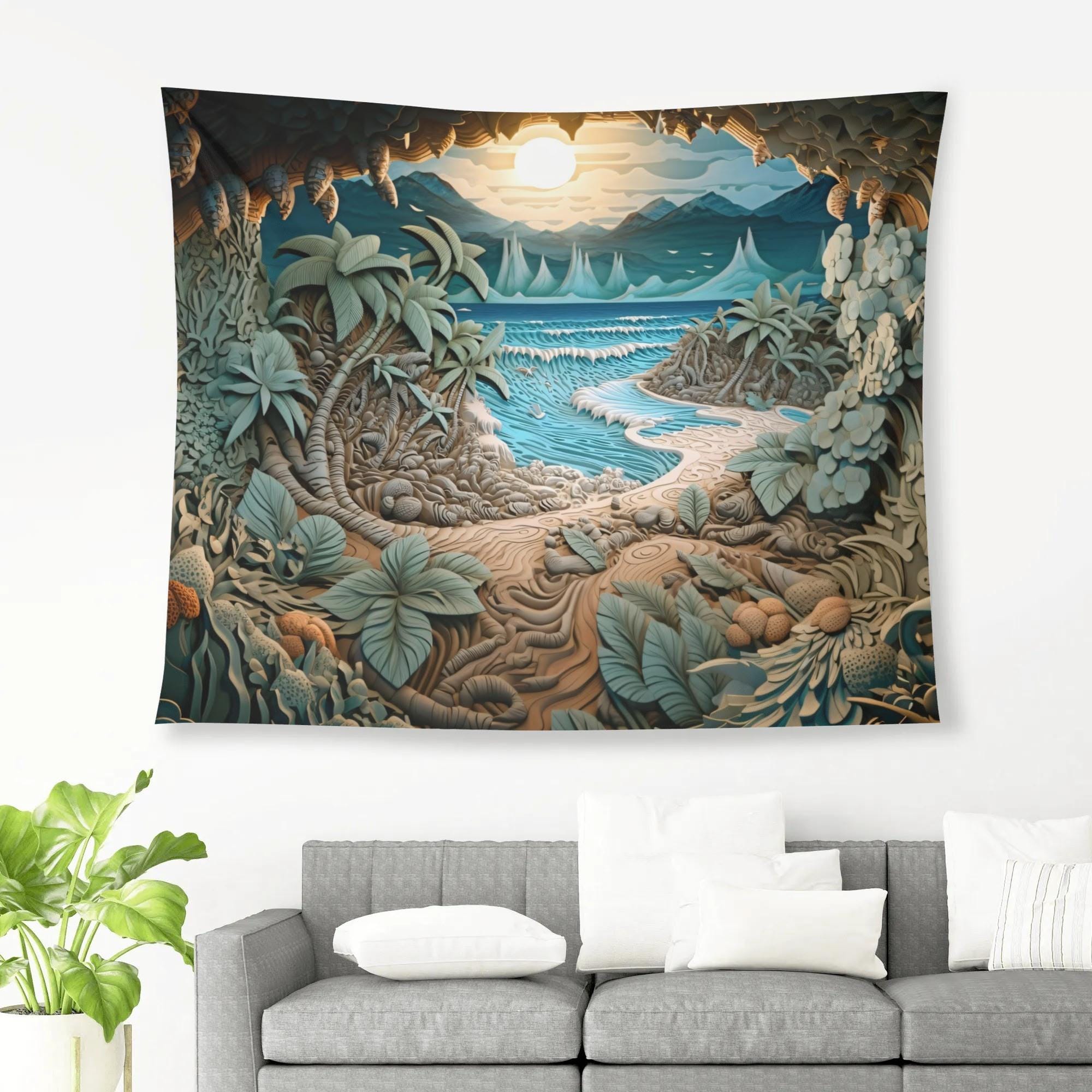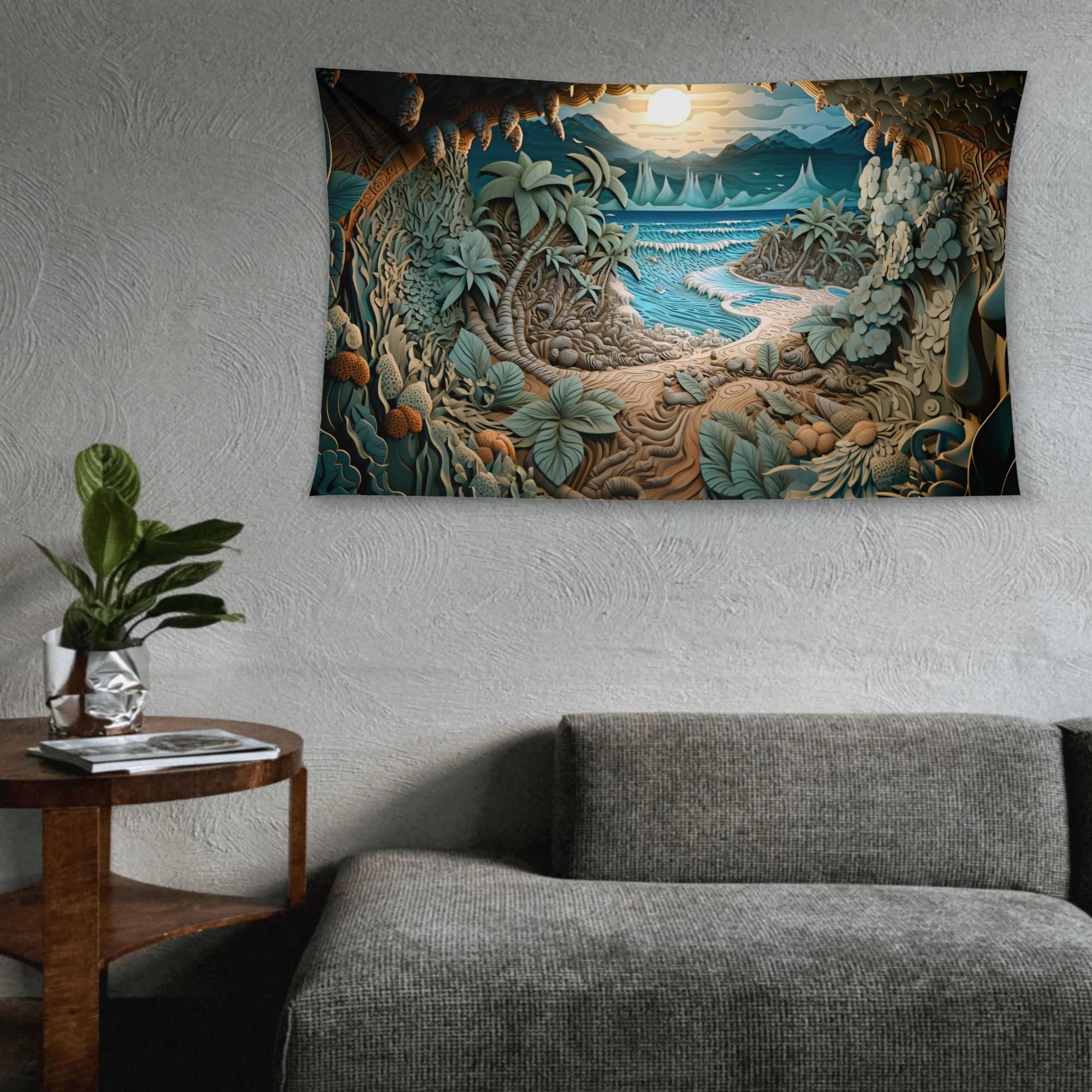 This tapestry invites you into a hidden coastal cove, where a winding sandy path leads through lush tropical foliage toward gentle waves and a glowing horizon. Soft teal waters, layered leaves, and a peaceful sky create a sense of calm, curiosity, and quiet escape.