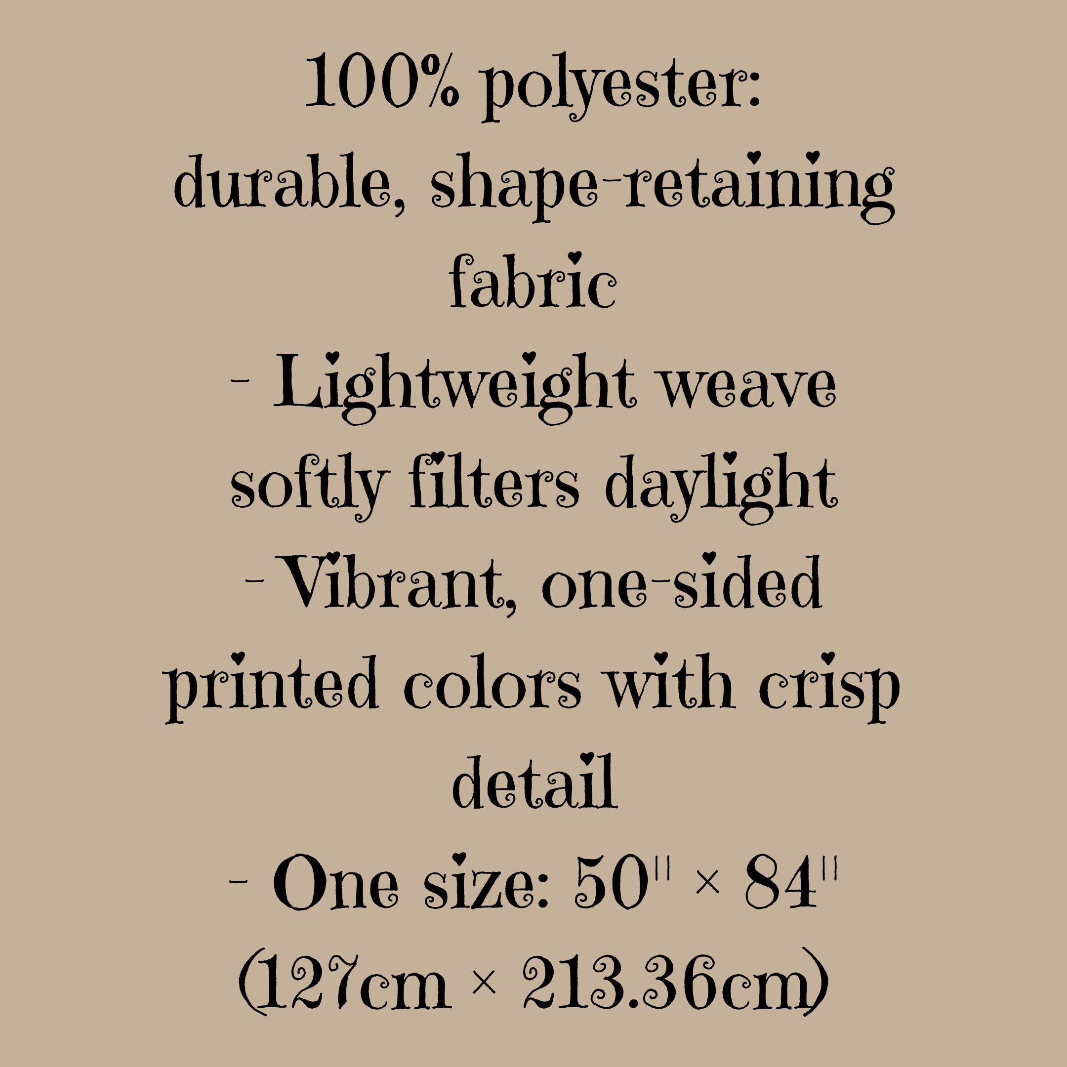 Product features - 100% polyester for durable, shape-retaining performance - Lightweight, translucent fabric that softens incoming light - Vibrant, one-sided print with crisp color reproduction - Single size: 50" × 84" (127cm × 213.36cm) — ready to hang - Easy-care synthetic that dries quickly and resists wrinkles