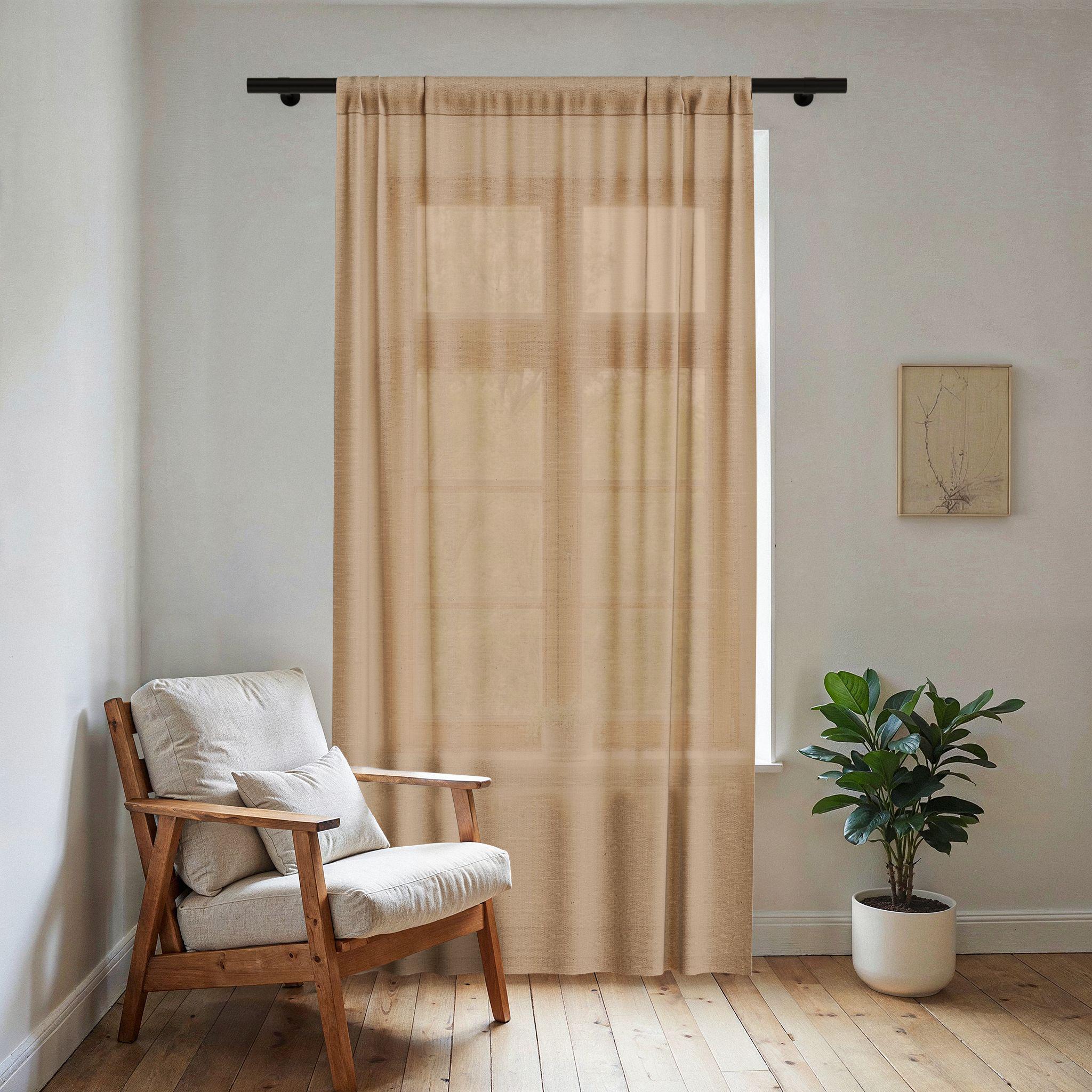 Soft, airy sheer that filters sunlight into warm, golden tones. This lightweight curtain drapes with a relaxed vertical flow, giving windows a calm, curated look without blocking the view. The translucent weave brightens a room while adding privacy and a gentle, textural layer. It settles beautifully in minimalist, Scandinavian, or modern rustic interiors — a quiet backdrop for morning coffee, slow afternoons, and rooms that lean into natural light.