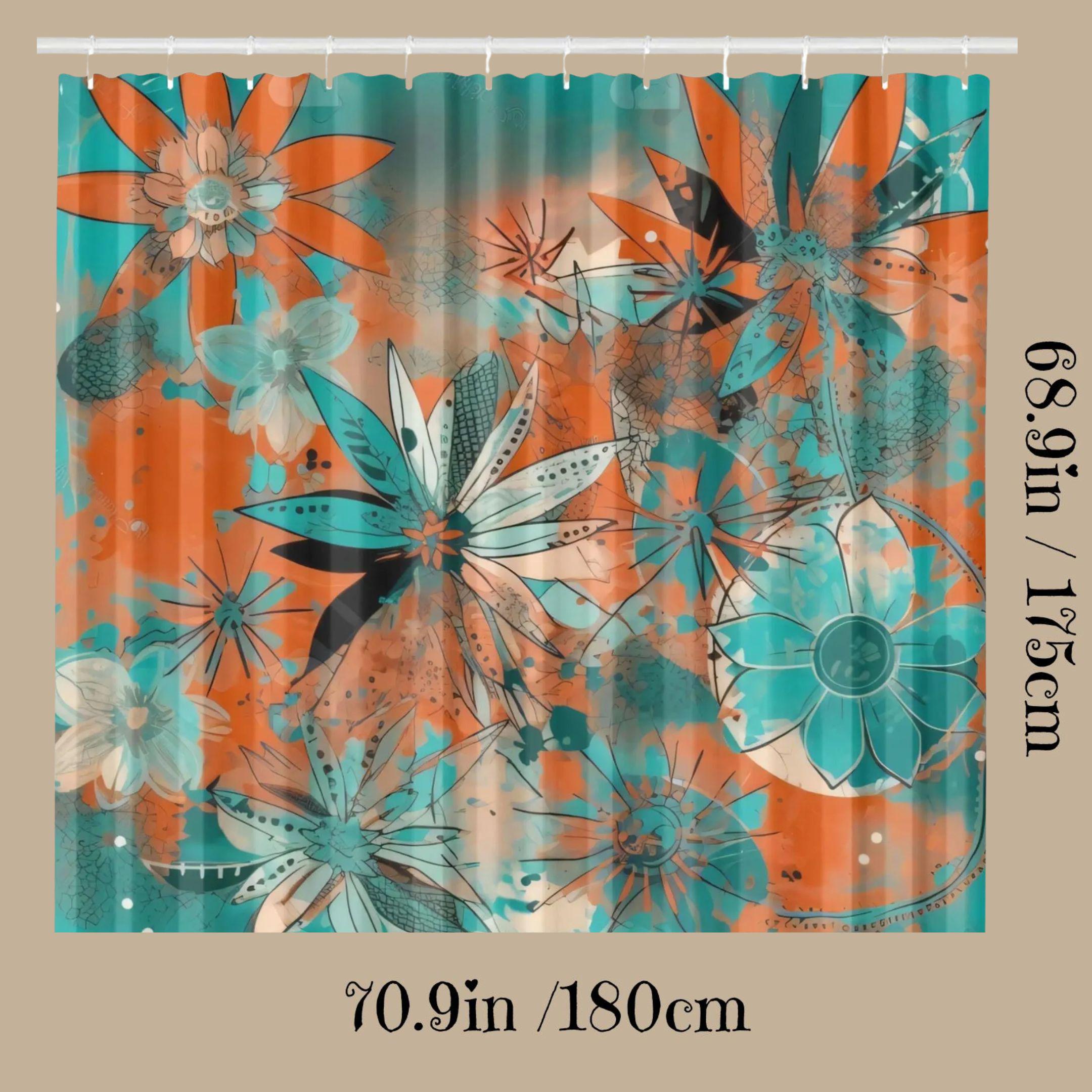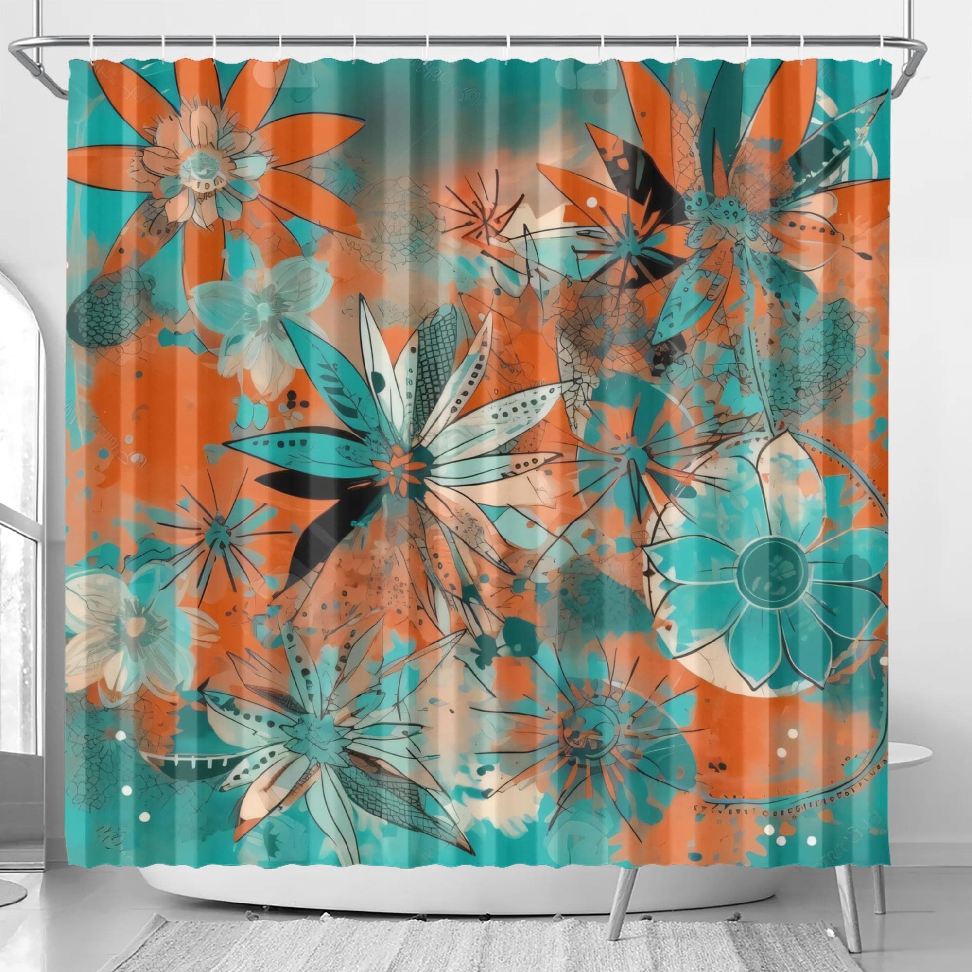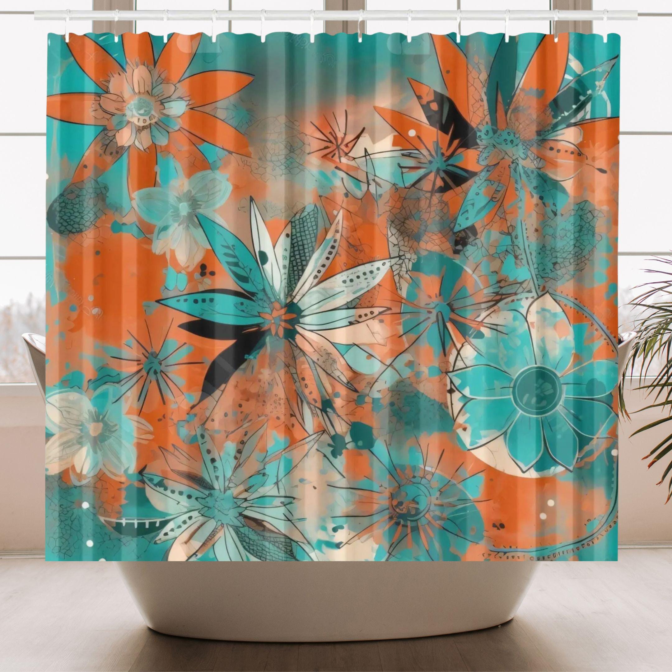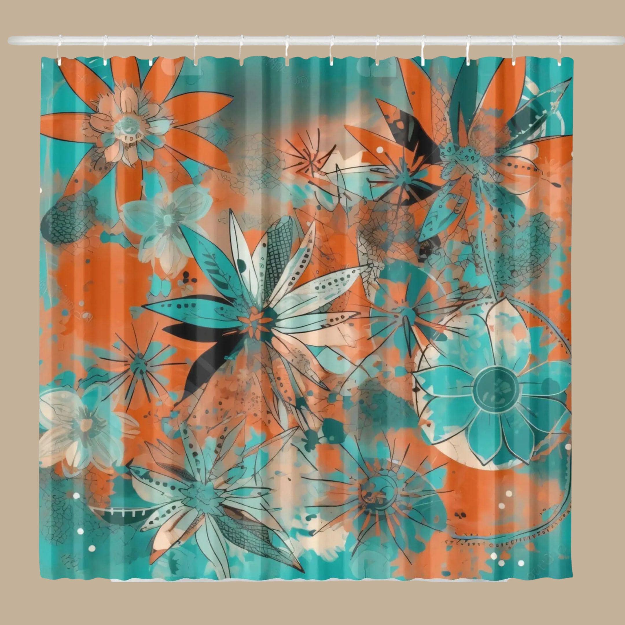 Abstract Floral Shower Curtain: Turquoise & Burnt Orange Botanical Fabric