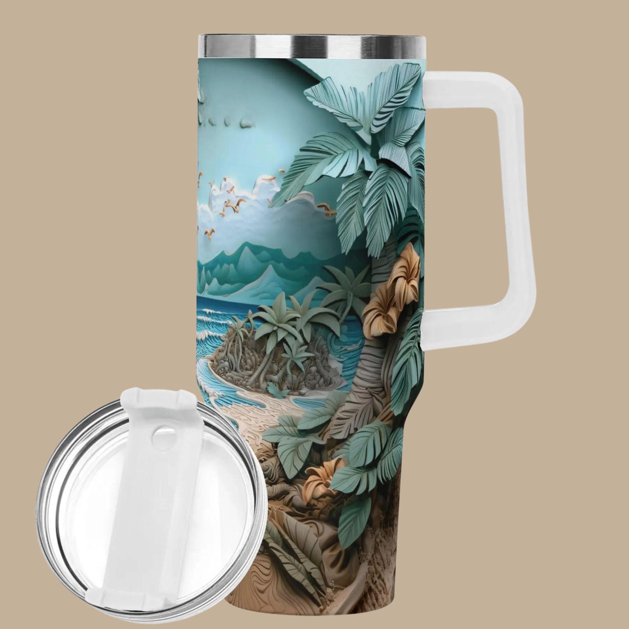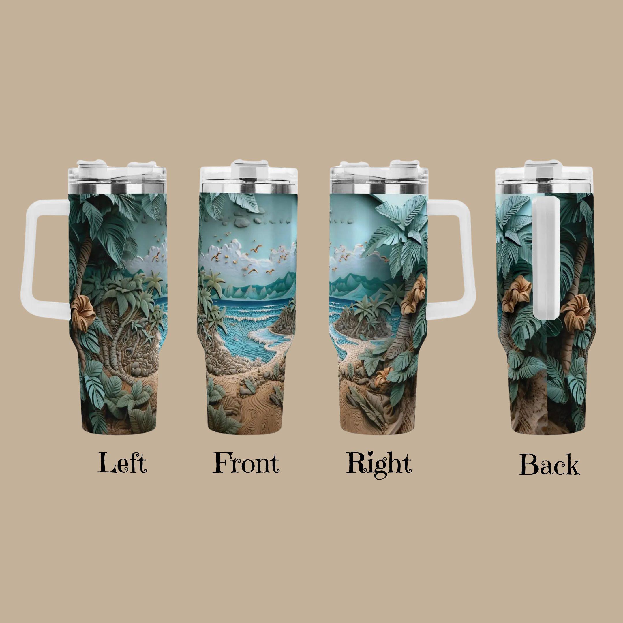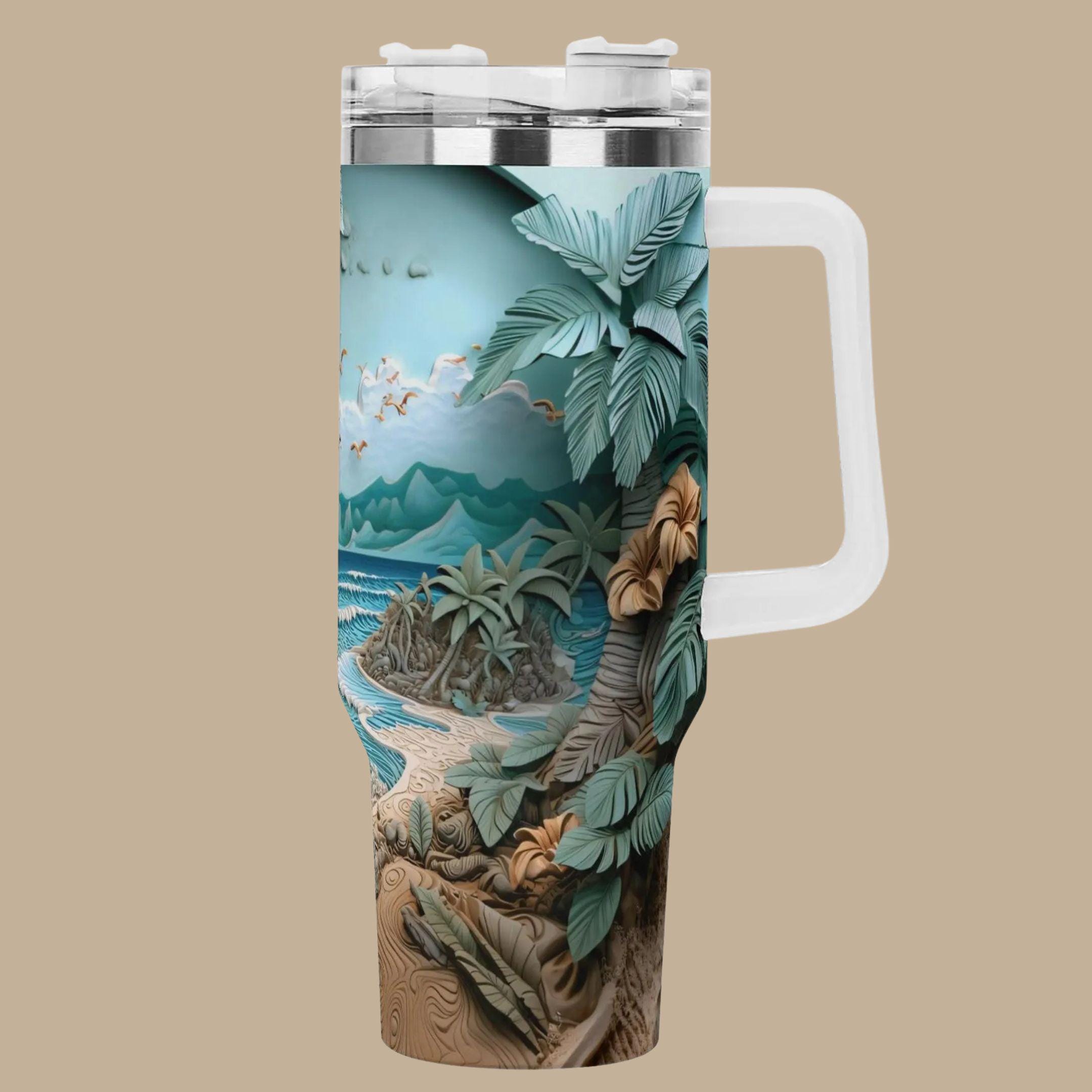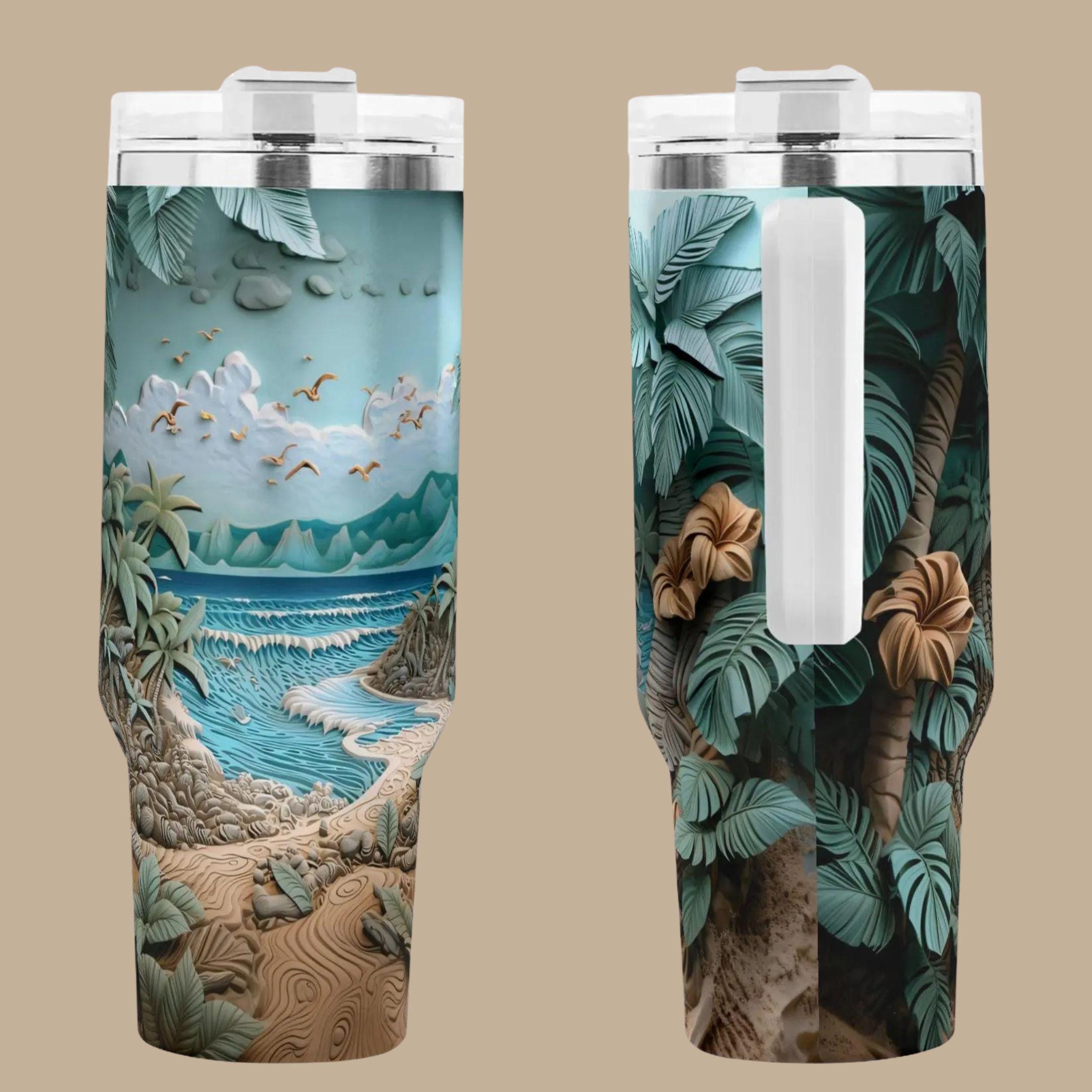 Bring the calm of the coast with you wherever you go. This 40oz insulated stainless steel tumbler features a breathtaking coastal paradise design—rolling turquoise waves, sandy paths, tropical palms, distant mountains, and seabirds drifting across a glowing sky. It feels like a tiny vacation in your hands.