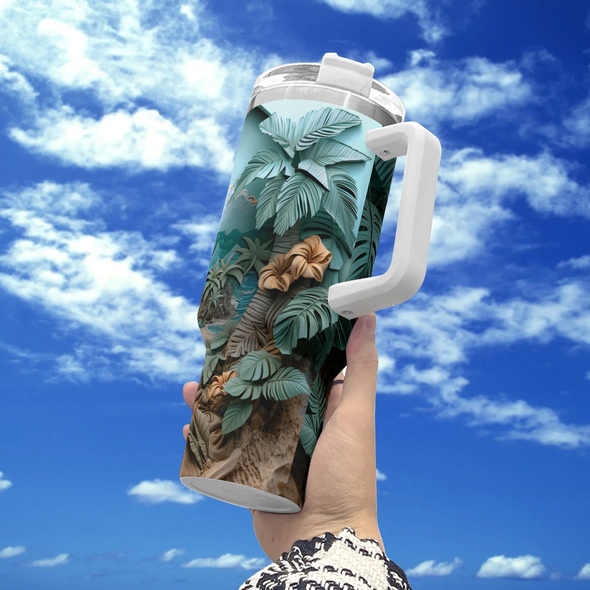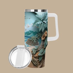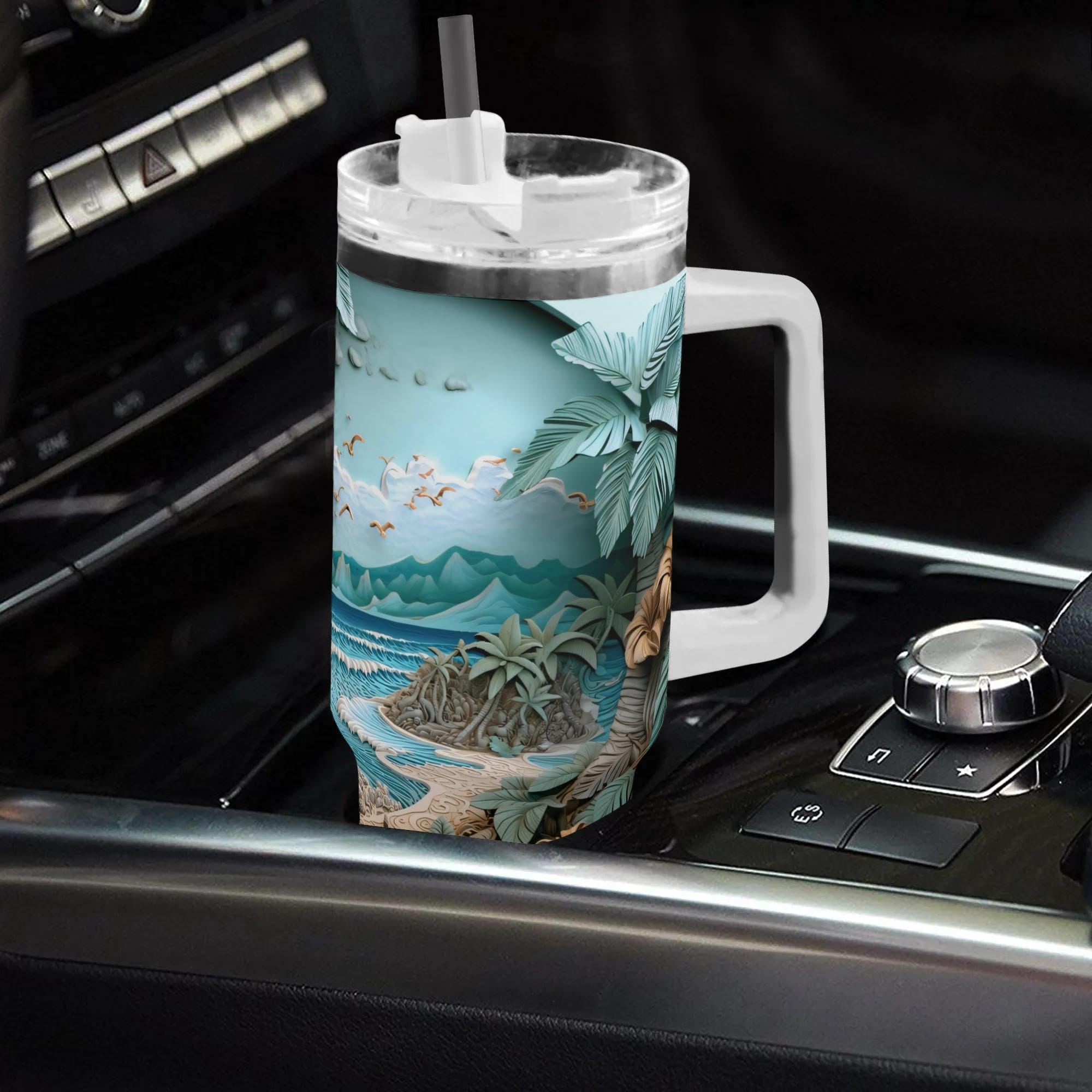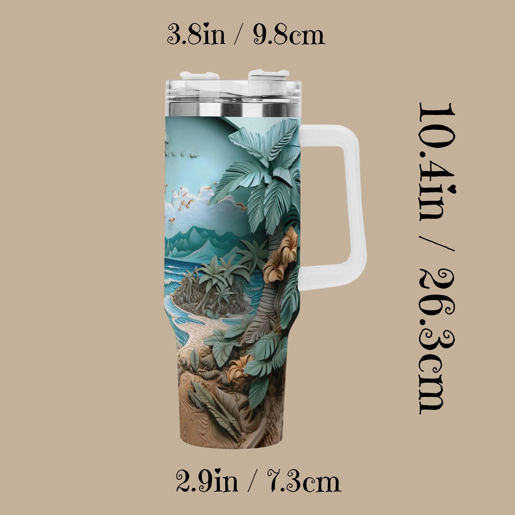 Bring the calm of the coast with you wherever you go. This 40oz insulated stainless steel tumbler features a breathtaking coastal paradise design—rolling turquoise waves, sandy paths, tropical palms, distant mountains, and seabirds drifting across a glowing sky. It feels like a tiny vacation in your hands.